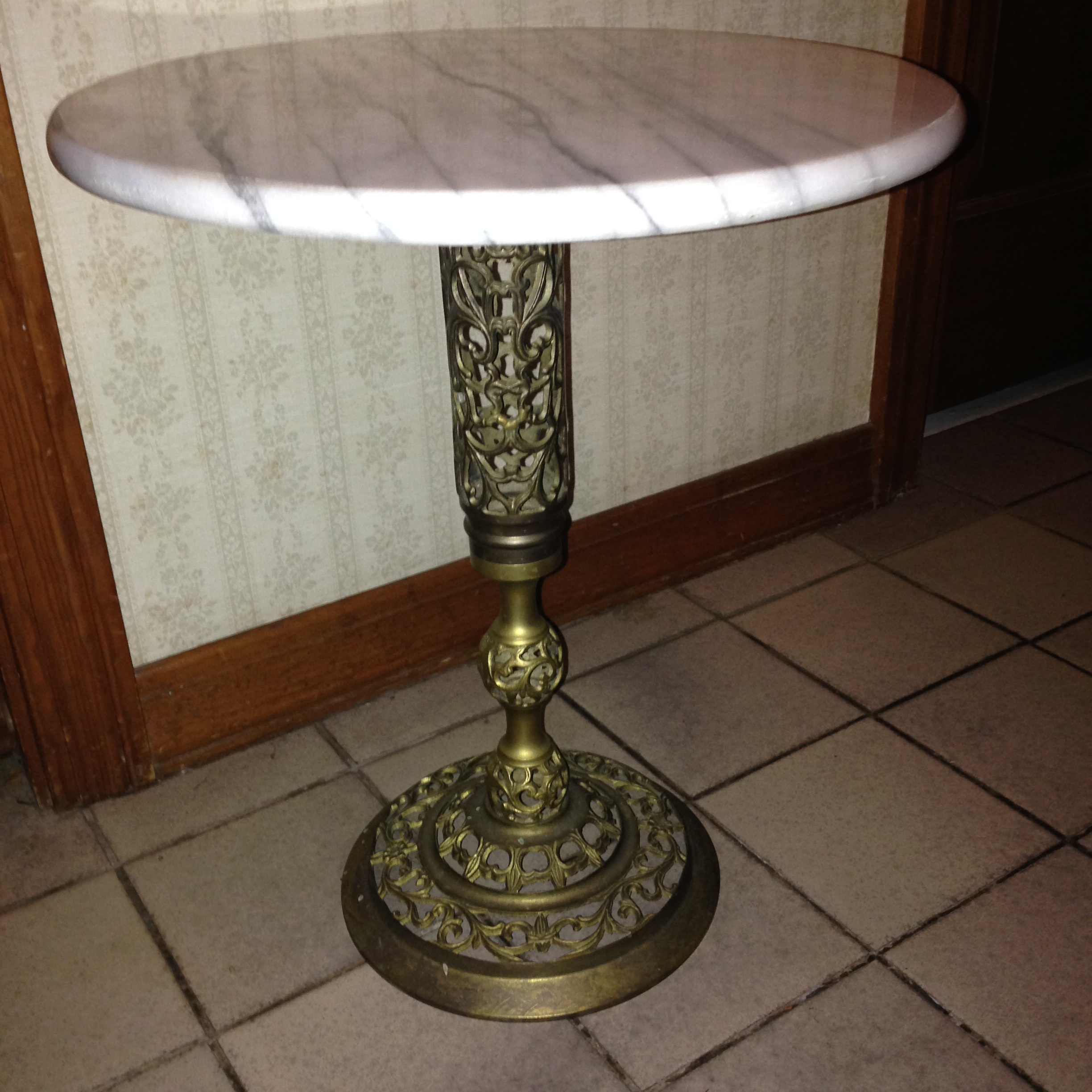Vintage, beautiful round marble top end or plant table with ornate brass base.