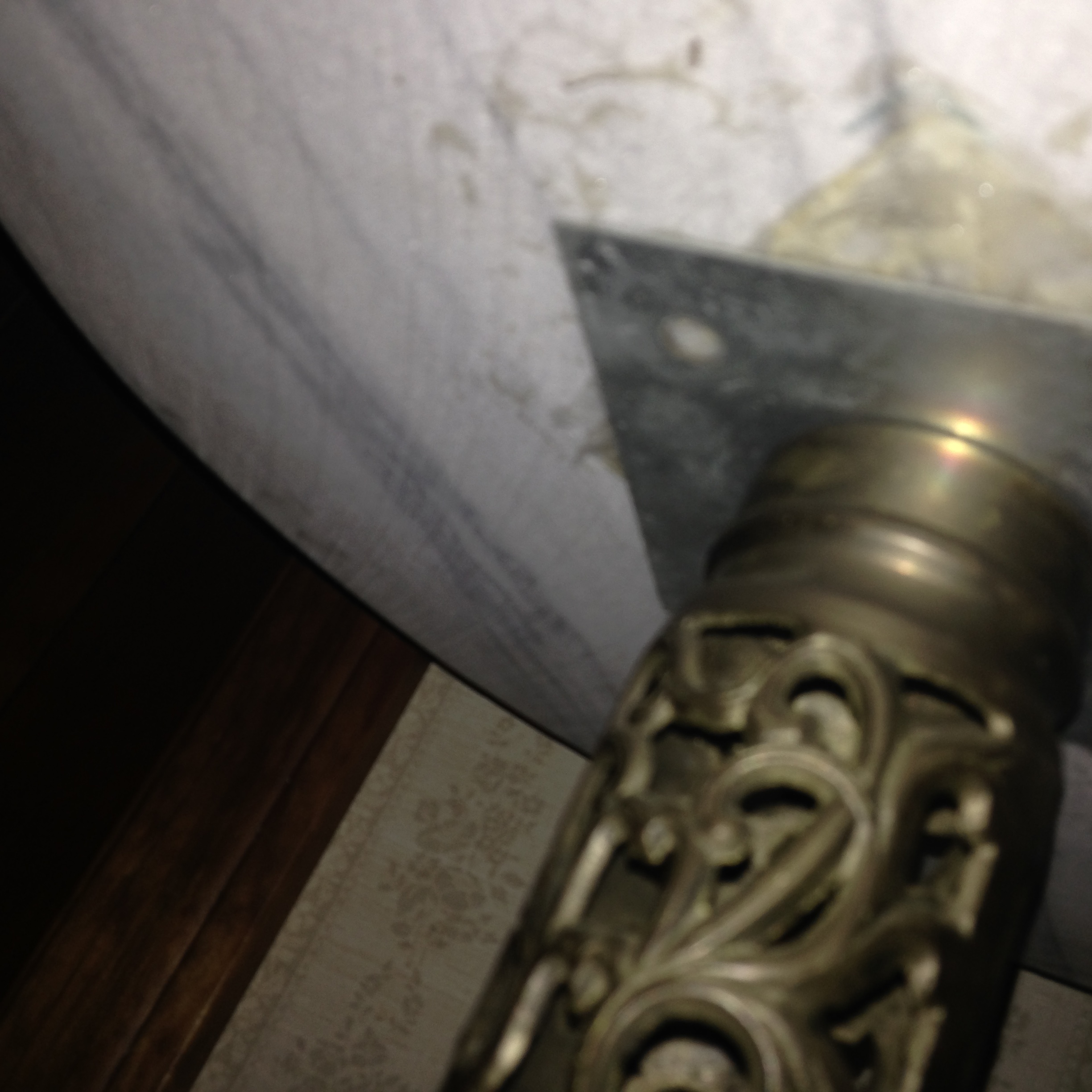 Defects, Nicks and/or Blemishes: It appears that the pedestal was removed from the marble top and glued back on. Our suspicion is that the bolts holding the base to the top were sheared off, as the bolt holes are there, and one can see where the pedestal was originally attached to the top. This does not show unless you turn the table upside down but does constitute a defect of sorts.