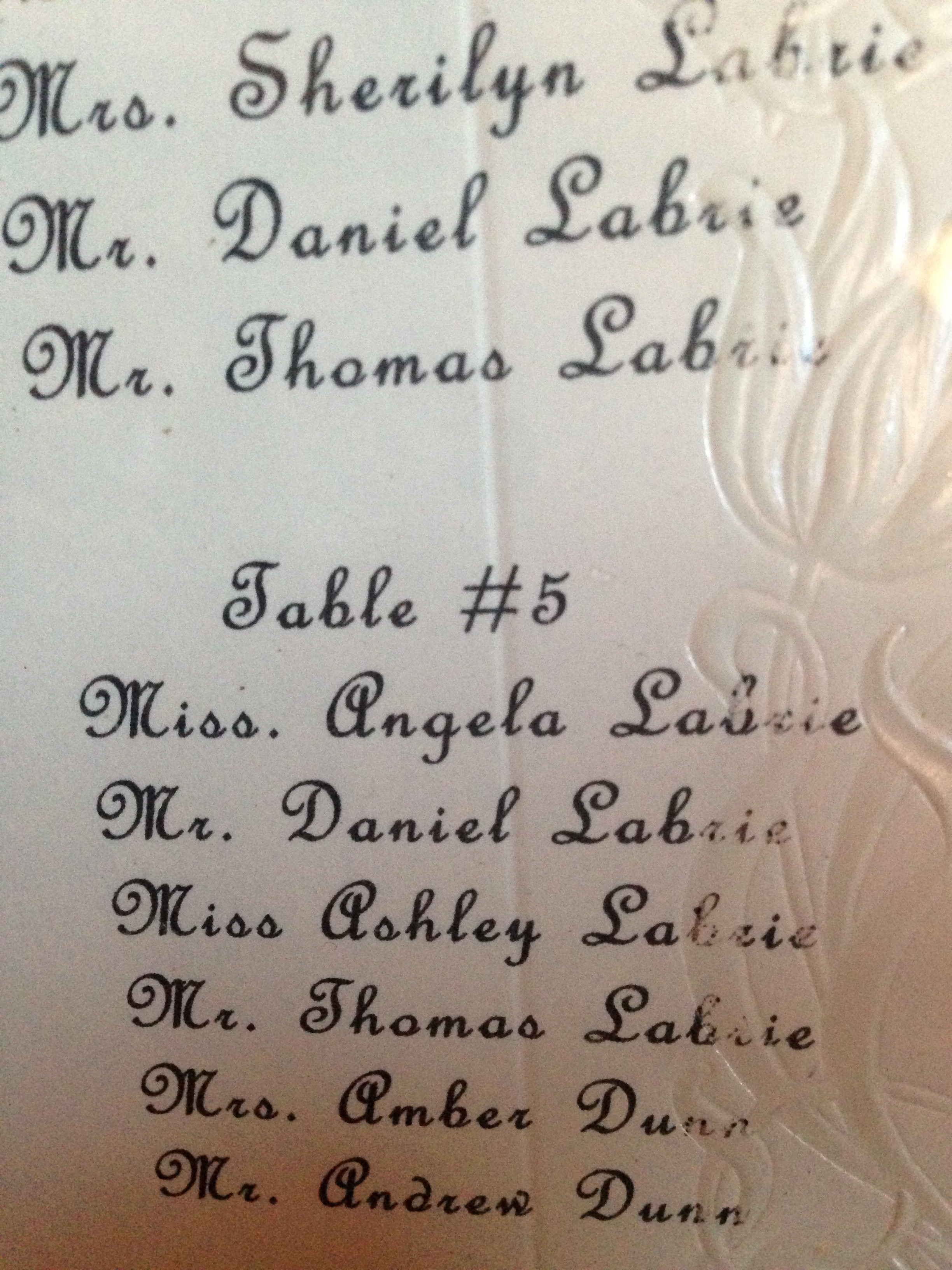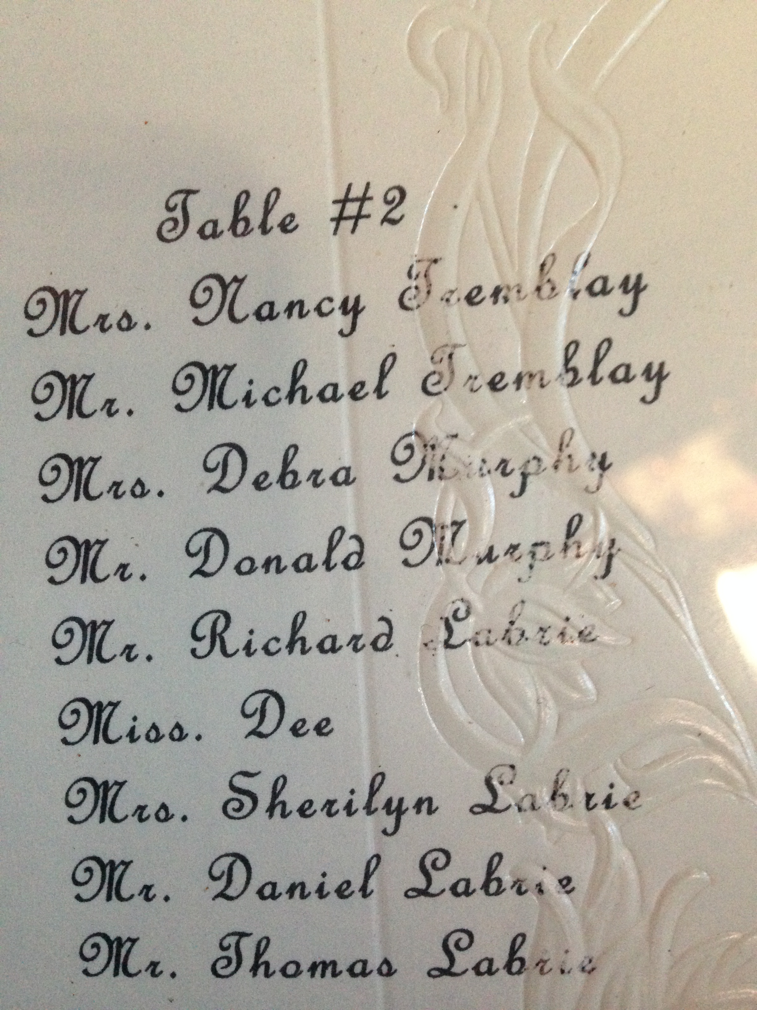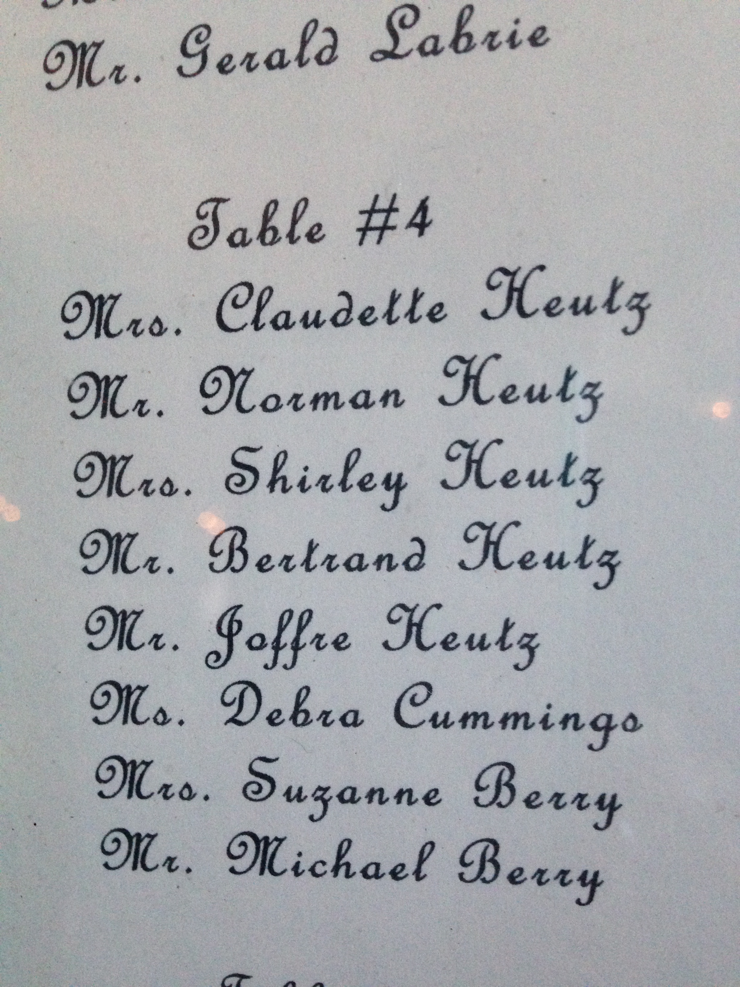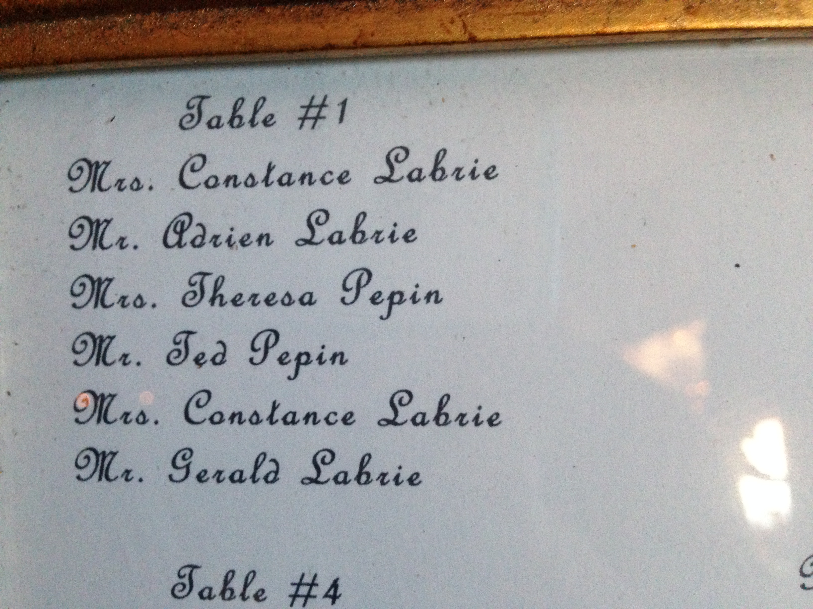 There’s nothing to indicate the year nor the event. The seating plan is typed on heavy paper with an embossed floral design on one side, and a fold crease down the middle. The frame is in “picture perfect condition” – remarkable given its apparent age and the location where we found it.