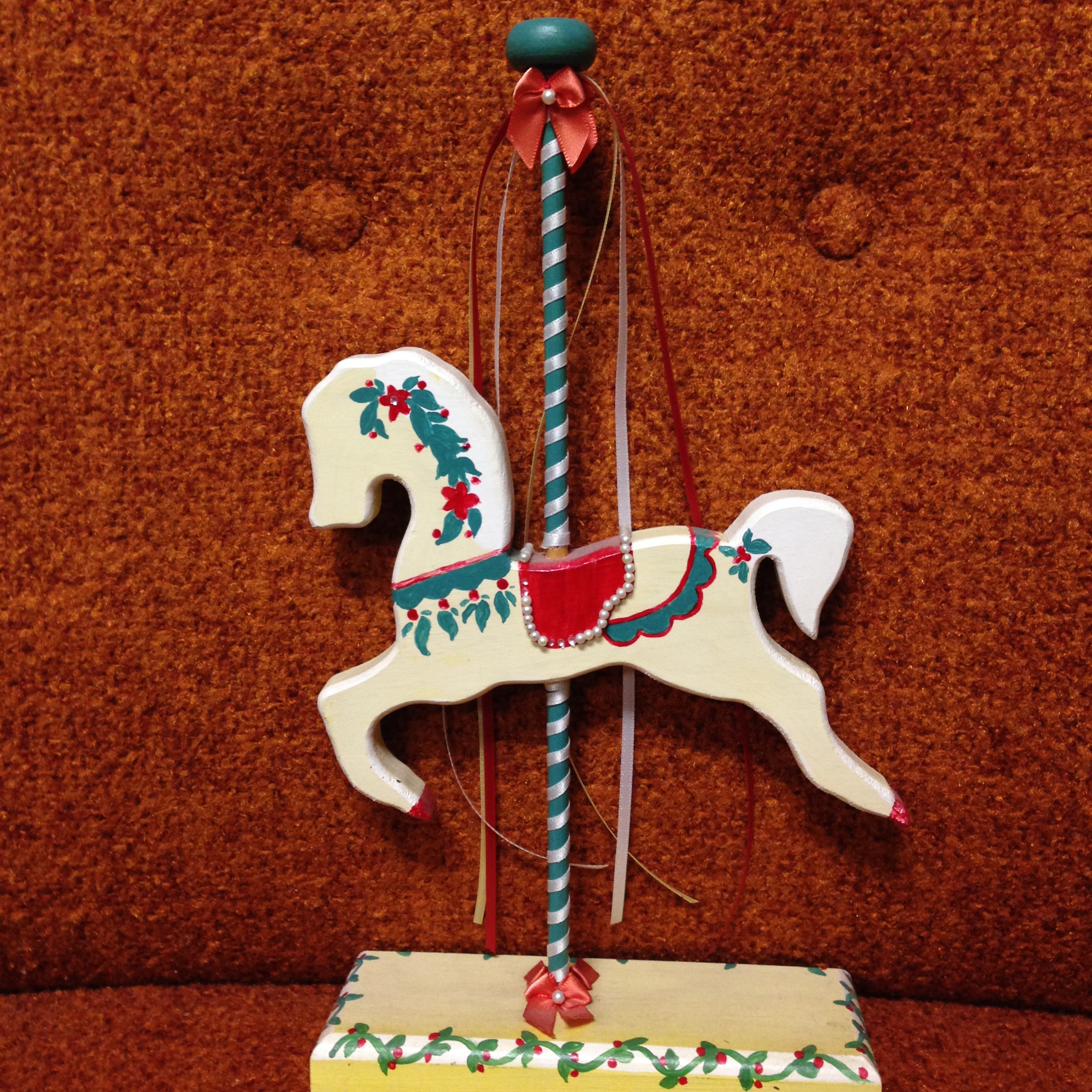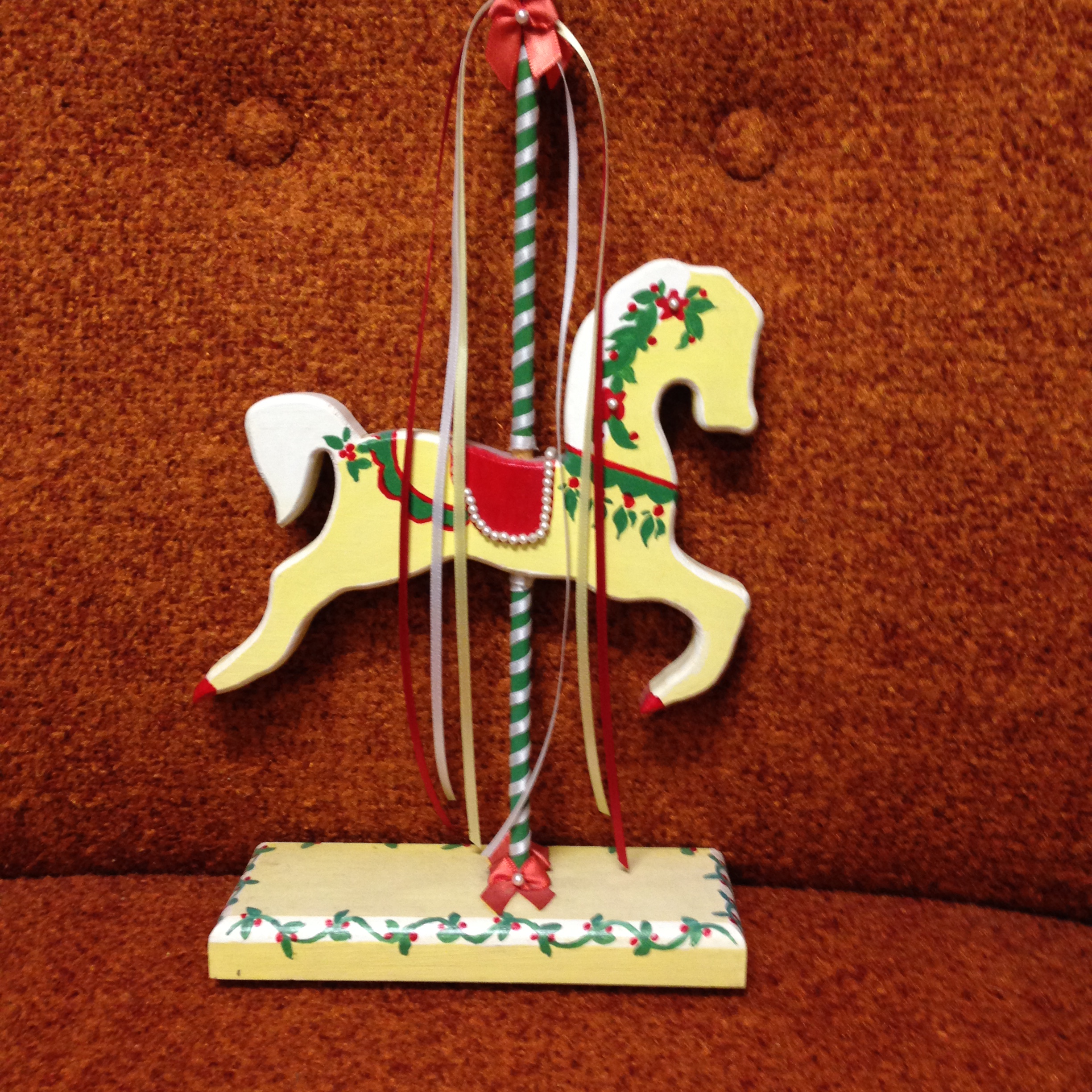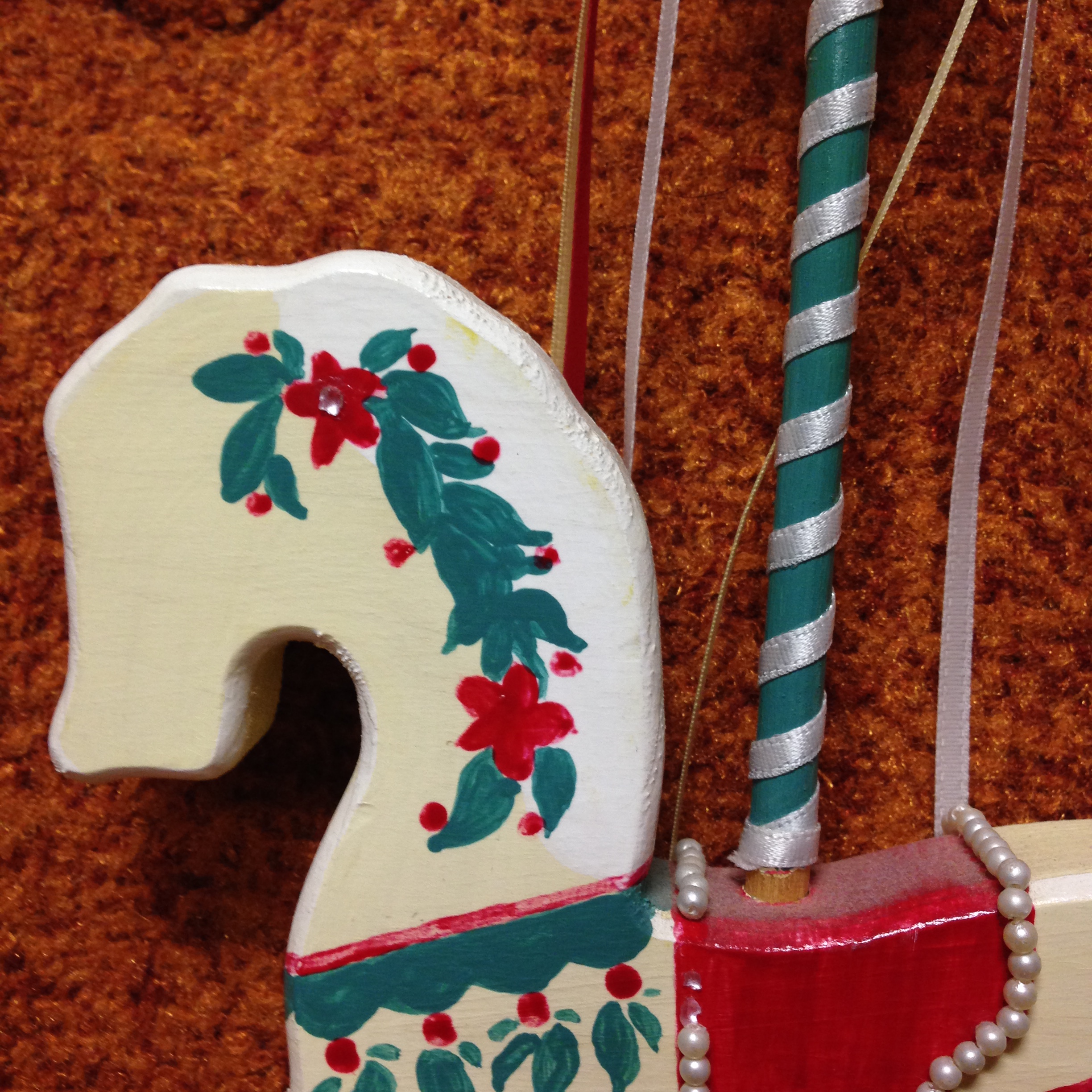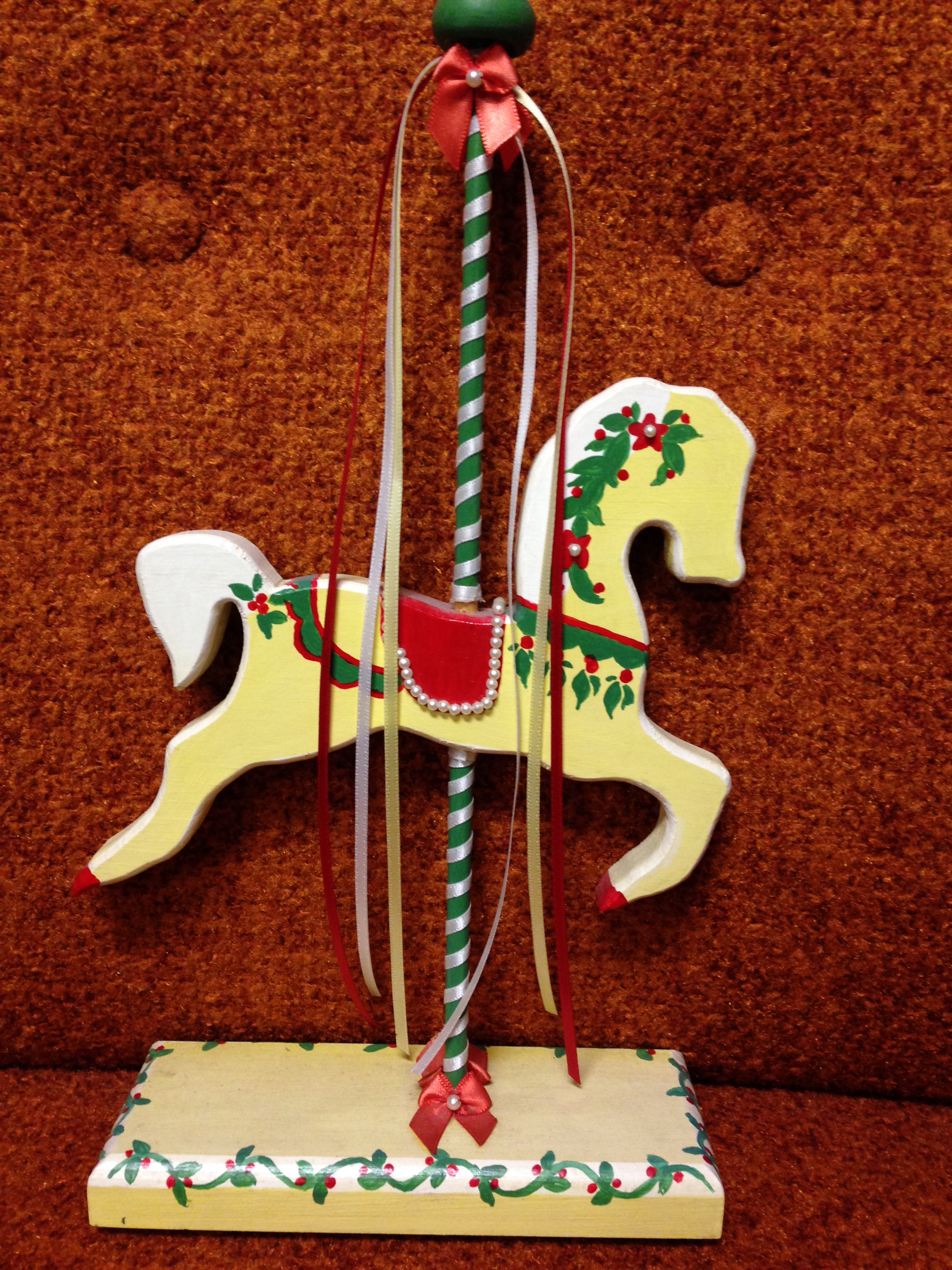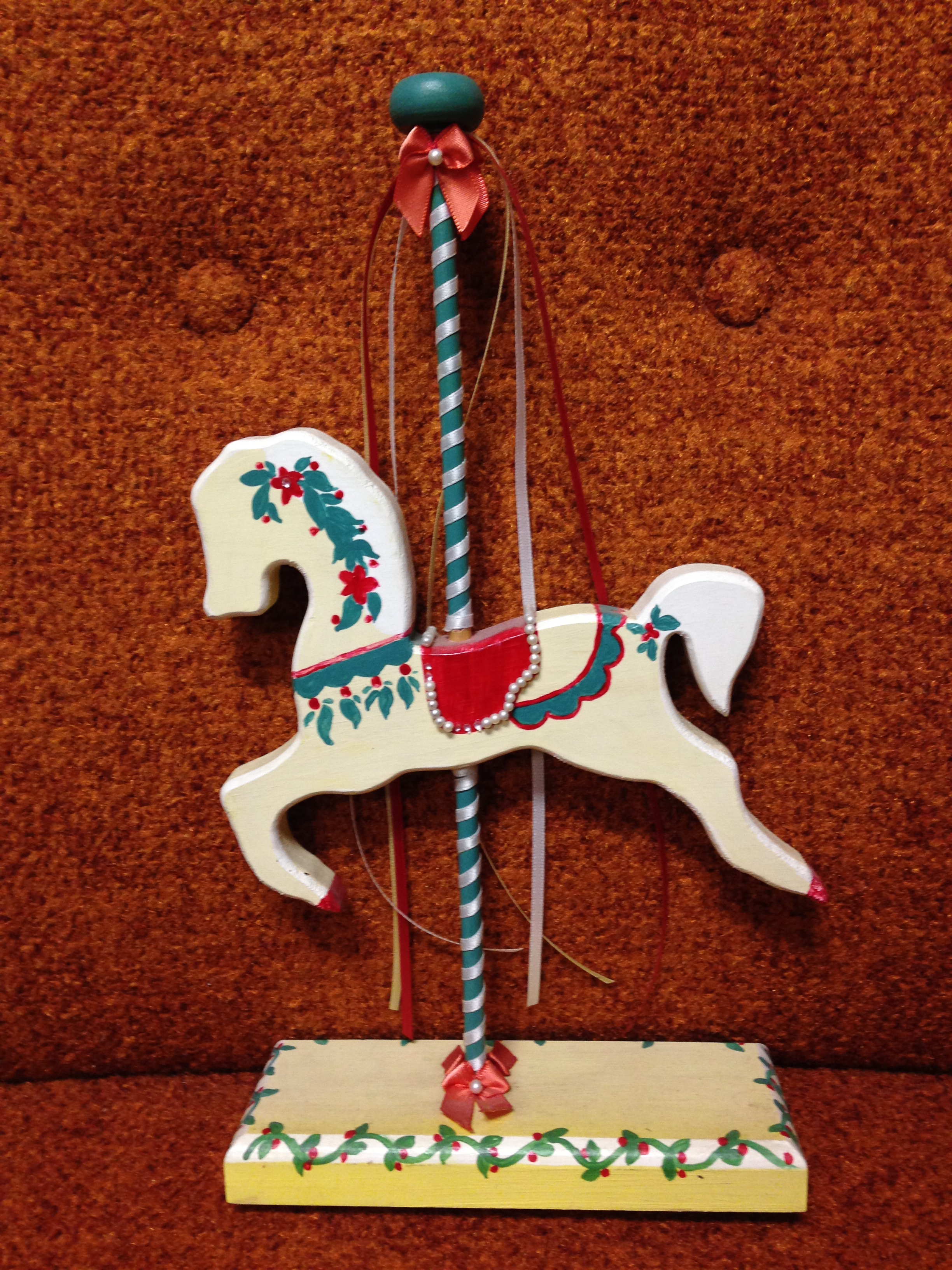 This sweet little wood & ribbon decorative item is just a foot high. The right-facing side is mostly pale yellow, while the left-facing side appears to have faded out to a light cream color.