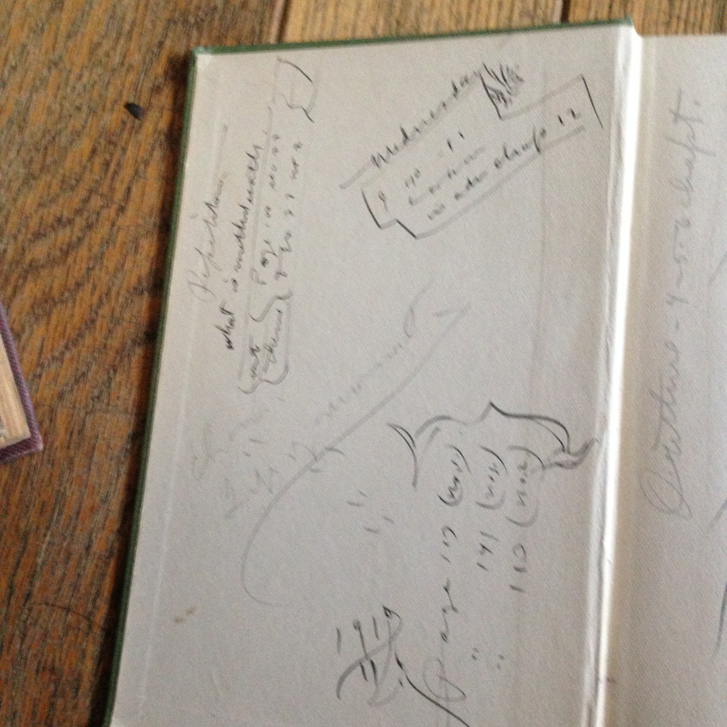 Inscriptions Inside: See photos above; the inside front cover pages have multiple notes written on them, as does the inside back cover. The bottom of the book’s pages has the date “1910” written across them (only noticeable when the book is turned on its side).