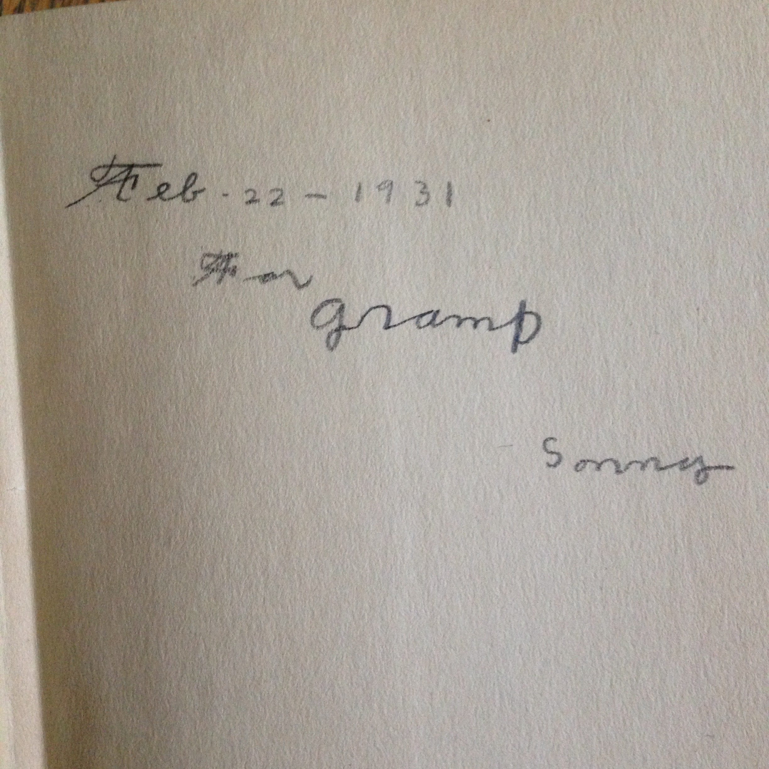 Signed Inside: See photo: “February 22 – 1931. For Gramp. Sonny.”