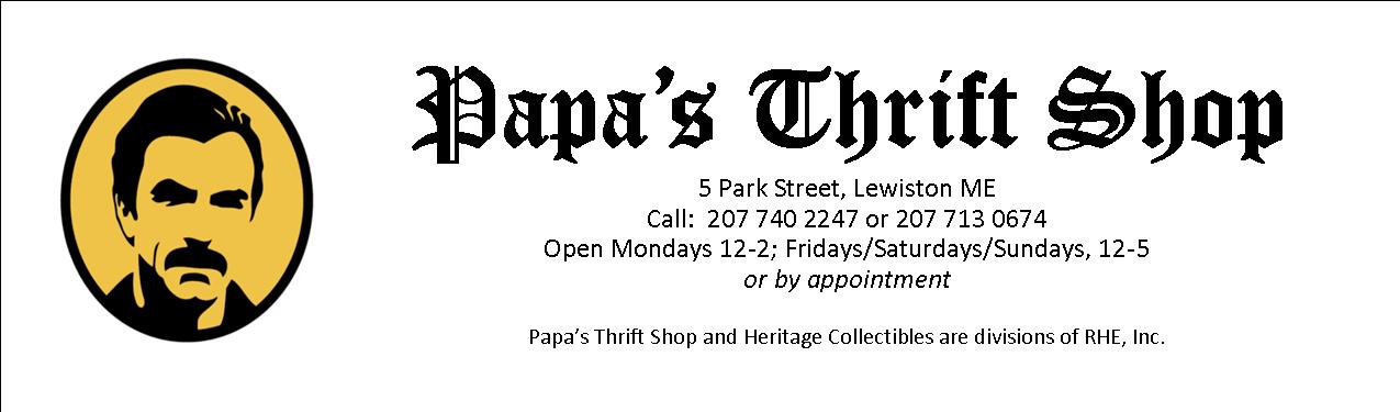 Papa’s hours are Fridays | Saturdays | Sundays from 12:00-5:00 and Mondays from 12:00-2:00. Please check in at Heritage Collectibles (around the corner at 189 Main Street) as that’s where we’ll be if there aren’t any customers visiting Papa’s. You can also reach us by calling Linda at 207 740 2247, or emailing me at LSnyder at regroupbiz dot com.