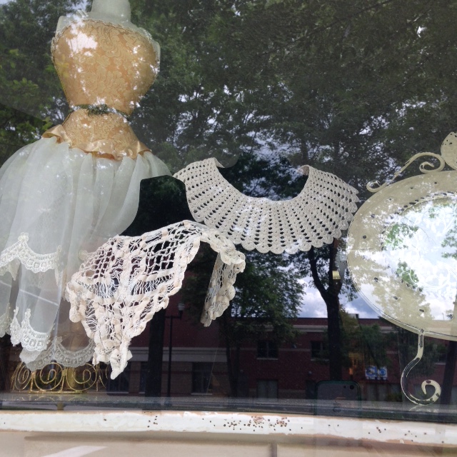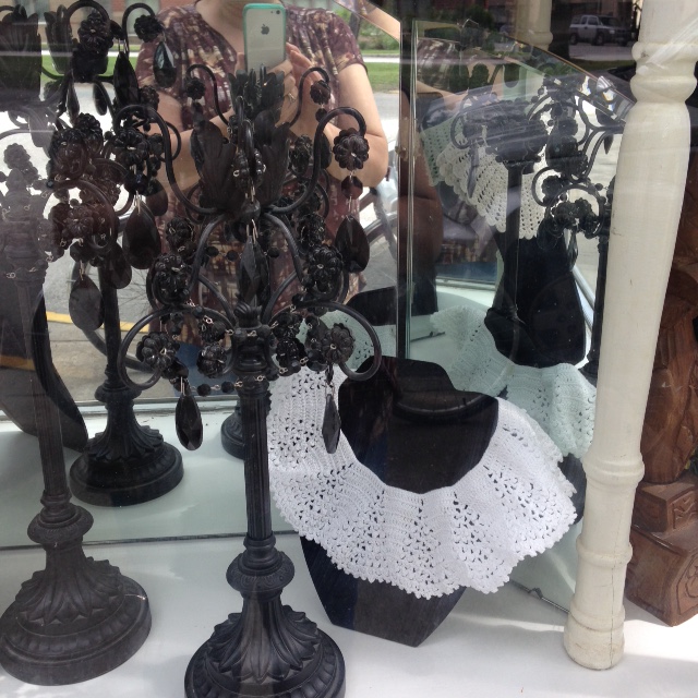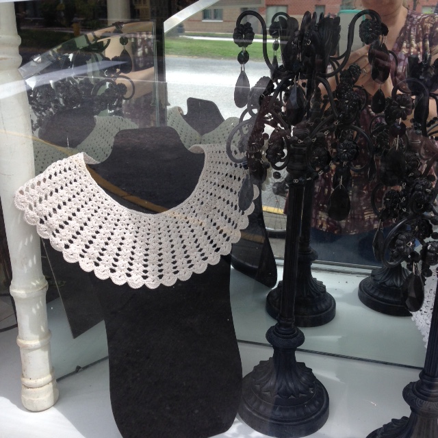 We have a wonderful selection of crocheted collars in a variety of designs. These will look lovely with nearly any ensemble; come on in and try one (or more) on!