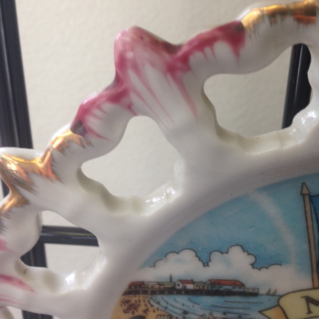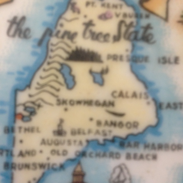 This lovely little souvenir map of Maine (8″ in diameter, excluding the points of the reticulation) is what was once called a ribbon plate, as one could thread ribbon in and out among the openings.