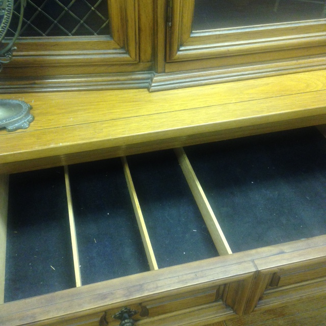 There are two drawers below the glassed upper section. As the photos below show, the left hand drawer is lined and probably intended for silverware. The right hand drawer is unlined.