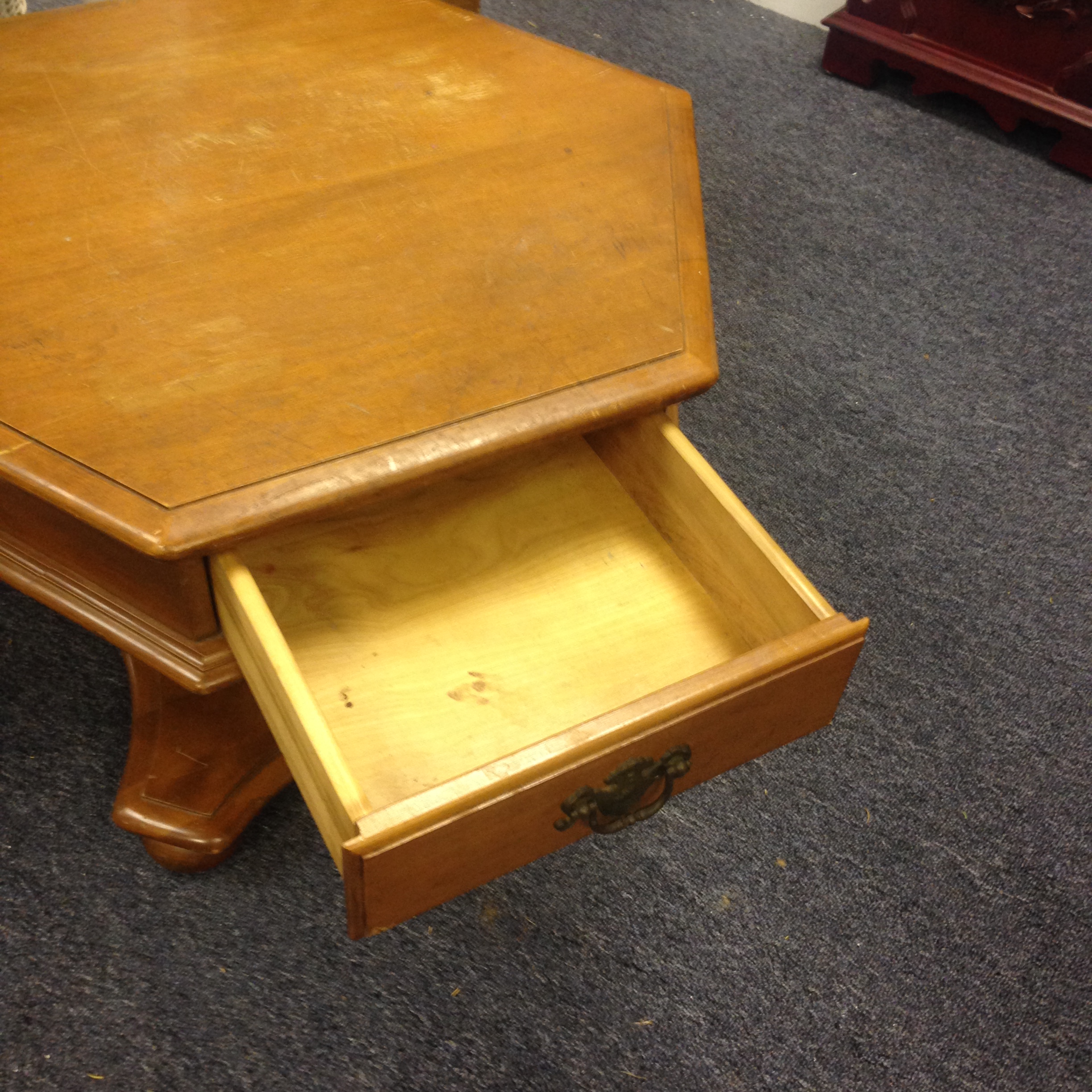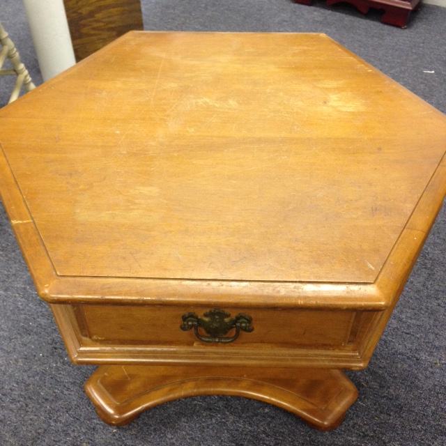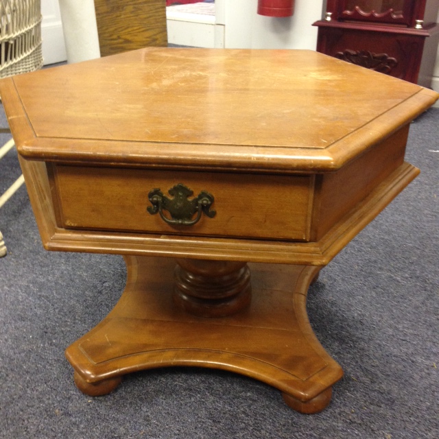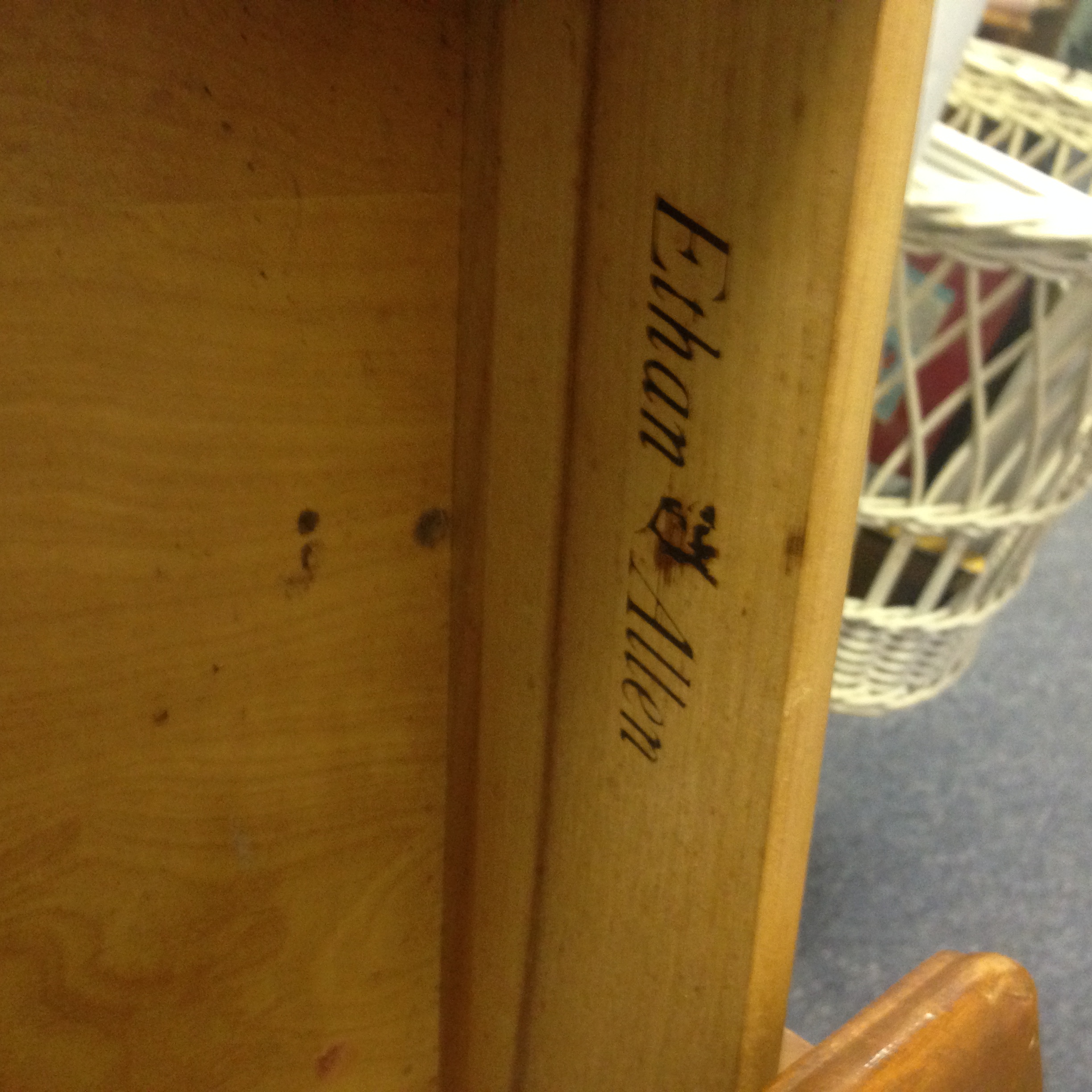 Ethan Allen is a name known for the quality of their furniture. Brand new and in perfect condition, this one-drawer, pedestal-style coffee table would go for hundreds of dollars. However, our piece has been well-loved (a euphemism for “somewhat scratched up”), so the price (was $85.00; now $42.50) reflects it. Refinish this great, sturdy coffee table and you’ll have a wonderful, classic piece!
