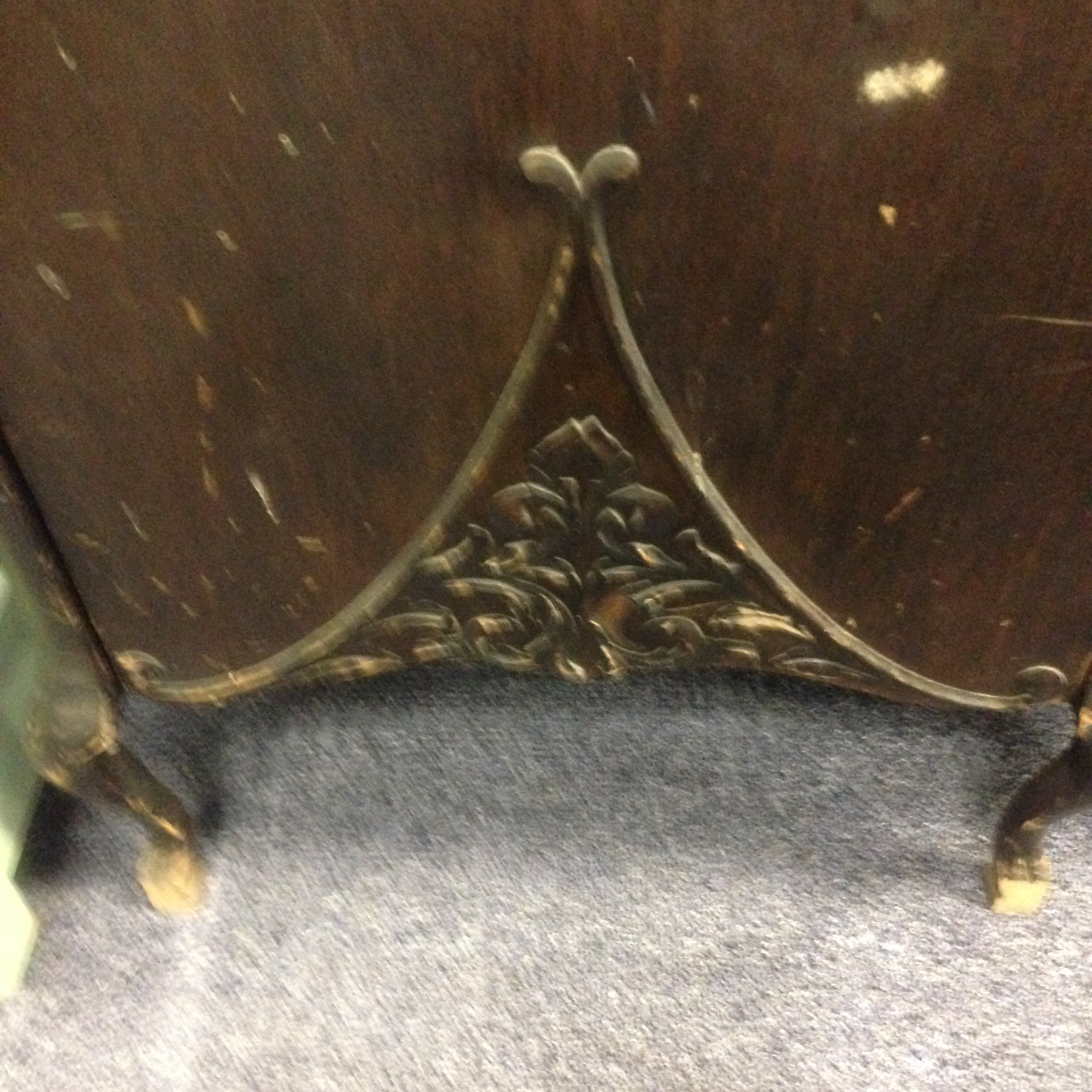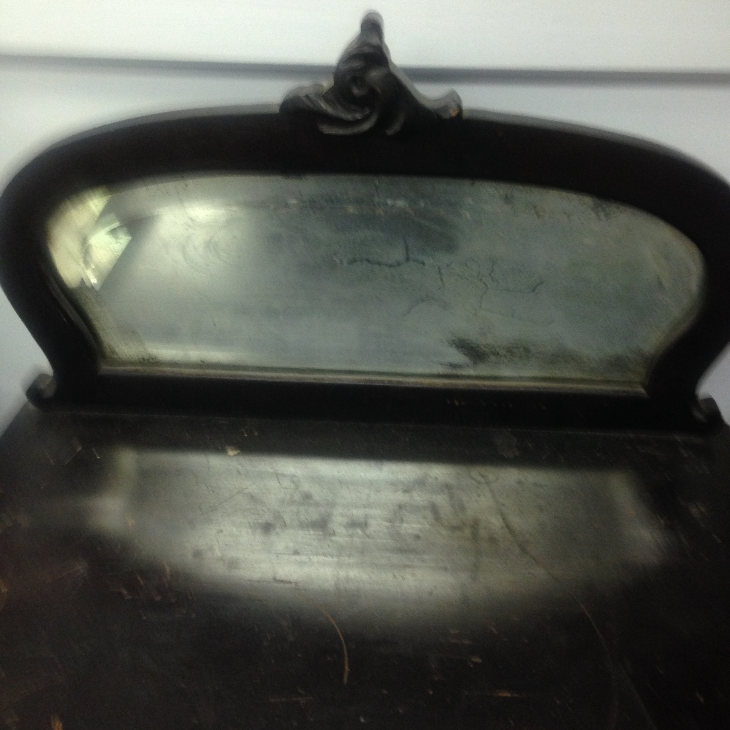Condition: As shown. The silvering on the mirror has deteriorated, there are scratches in the wood, and the legs have been damaged – apparently deliberately to fit into a specific space.