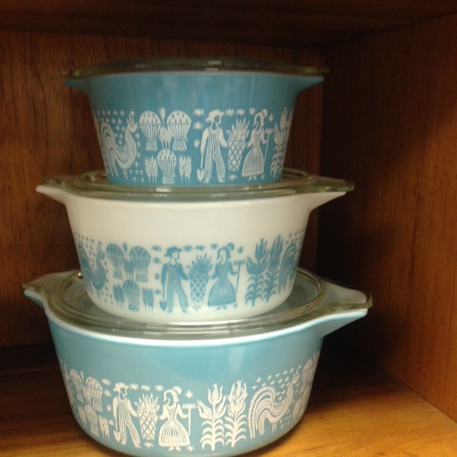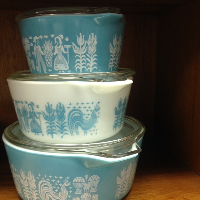 We LOVE this set of Pyrex Turquoise Amish Butterprint 480 Cinderella Casseroles!