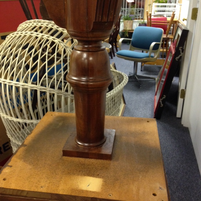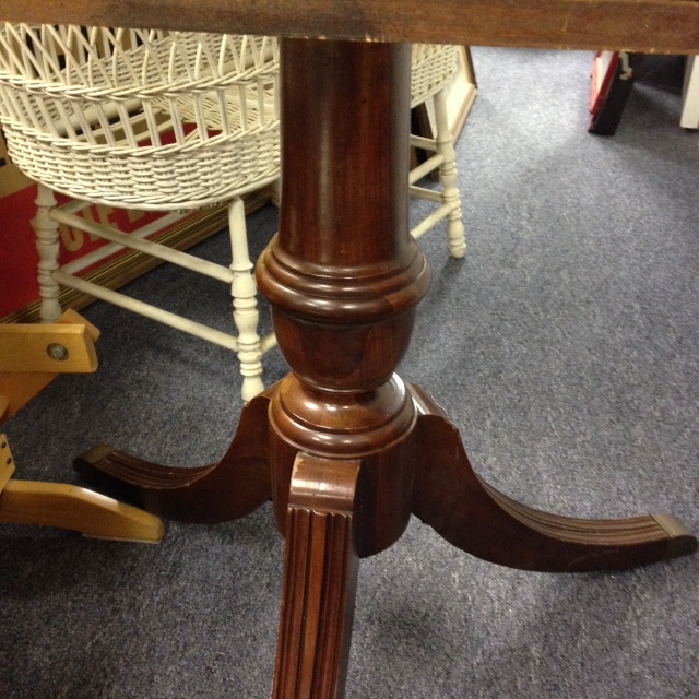 As you can see, we don’t have very good pictures of the table, mostly because we don’t have room in the shop to set it up properly, so the top, the leaves and the pedestal legs are all separated. However it only takes four screws for each pedestal leg to put the table back together, and it’s a whole lot easier to transport this way anyway. (We took it apart to move it from the auction house to the shop.)