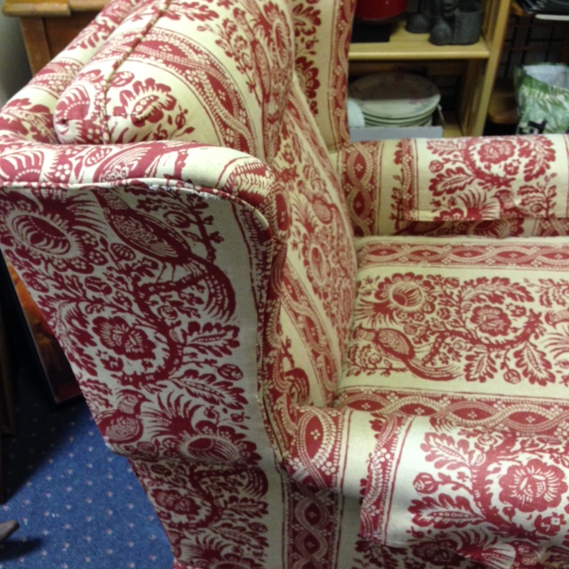 Condition: Excellent. There is some very slight fading on the seat cushion, and one of the antimacassars (the extra piece of fabric used to protect the arms of a chair), but otherwise, it’s of the quality you’d expect from an Ethan Allen piece – at far less than you’d ordinarily pay!