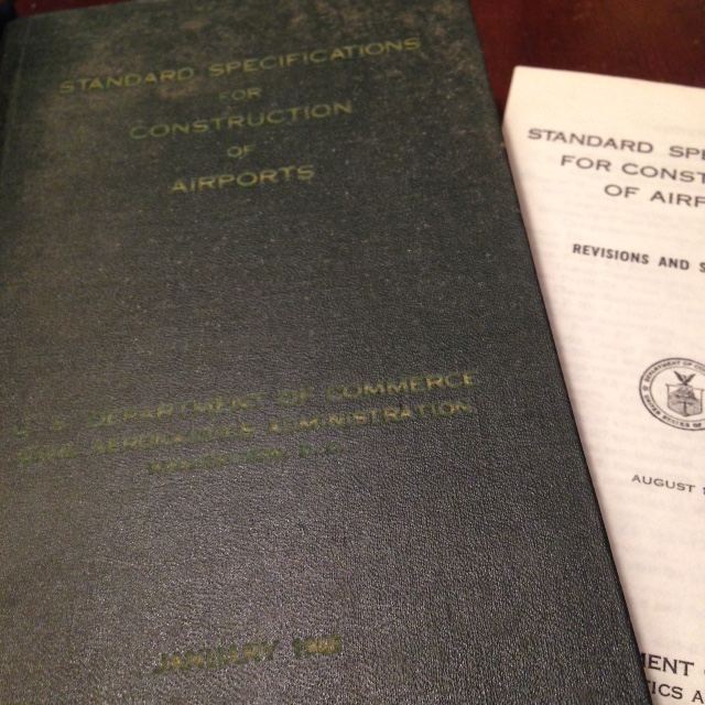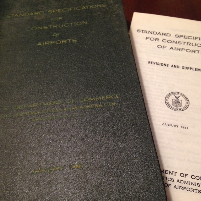Standard Specifications for Construction of Airports – U S Department of Commerce, Civil Aeronautics Administration. January 1948. Includes a booklet of Revisions & Supplements, dated August 1951.