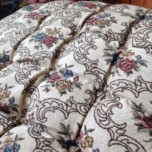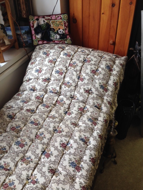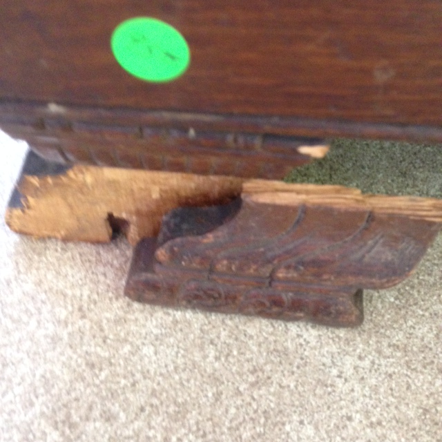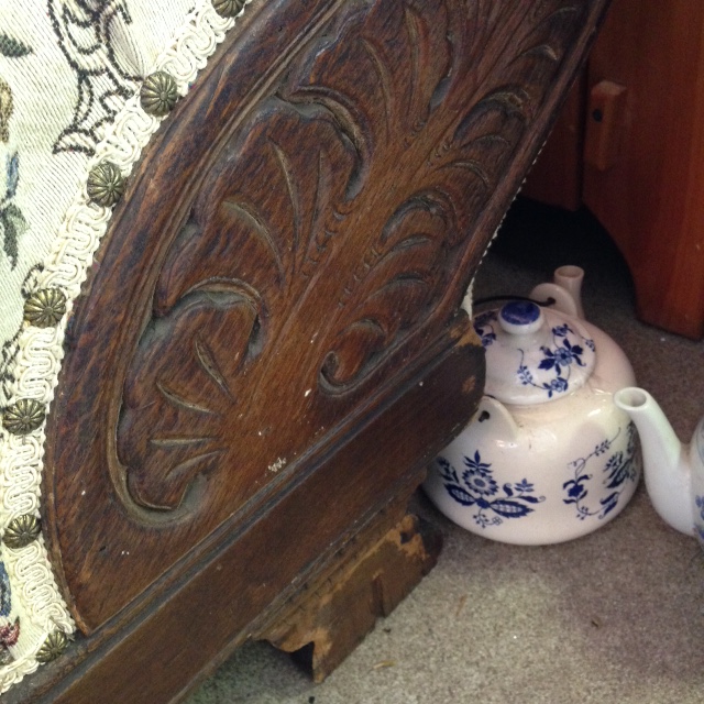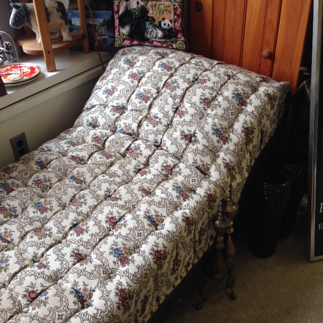 Condition: While the upholstery of our fainting couch is in very good condition, the legs were damaged at one point and need repair (we do have the necessary pieces as shown in the pictures); however, the couch is perfectly usable as is! Come on in and try it out! It’s a fabulous piece and if we had room in our house, I’d take it home right away!