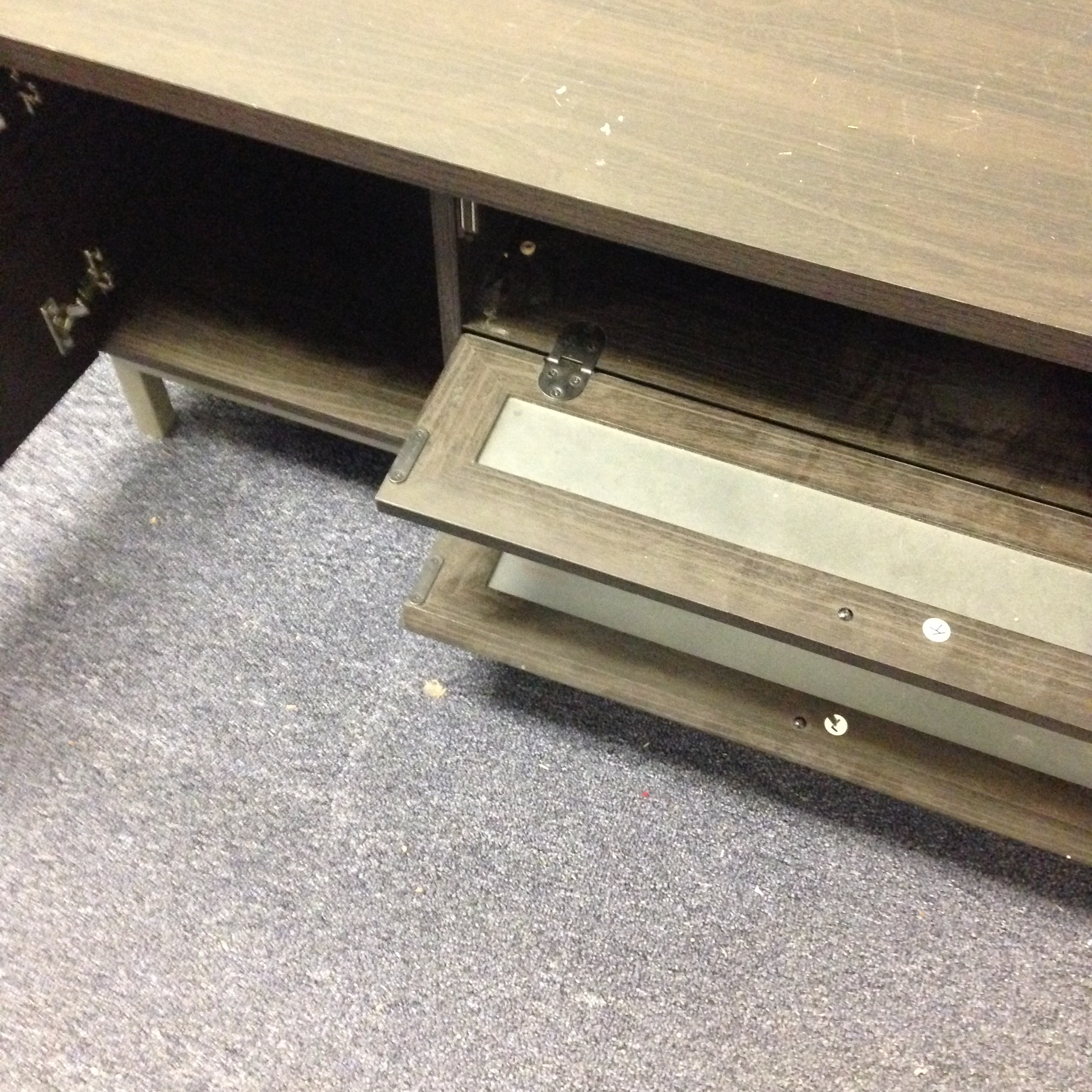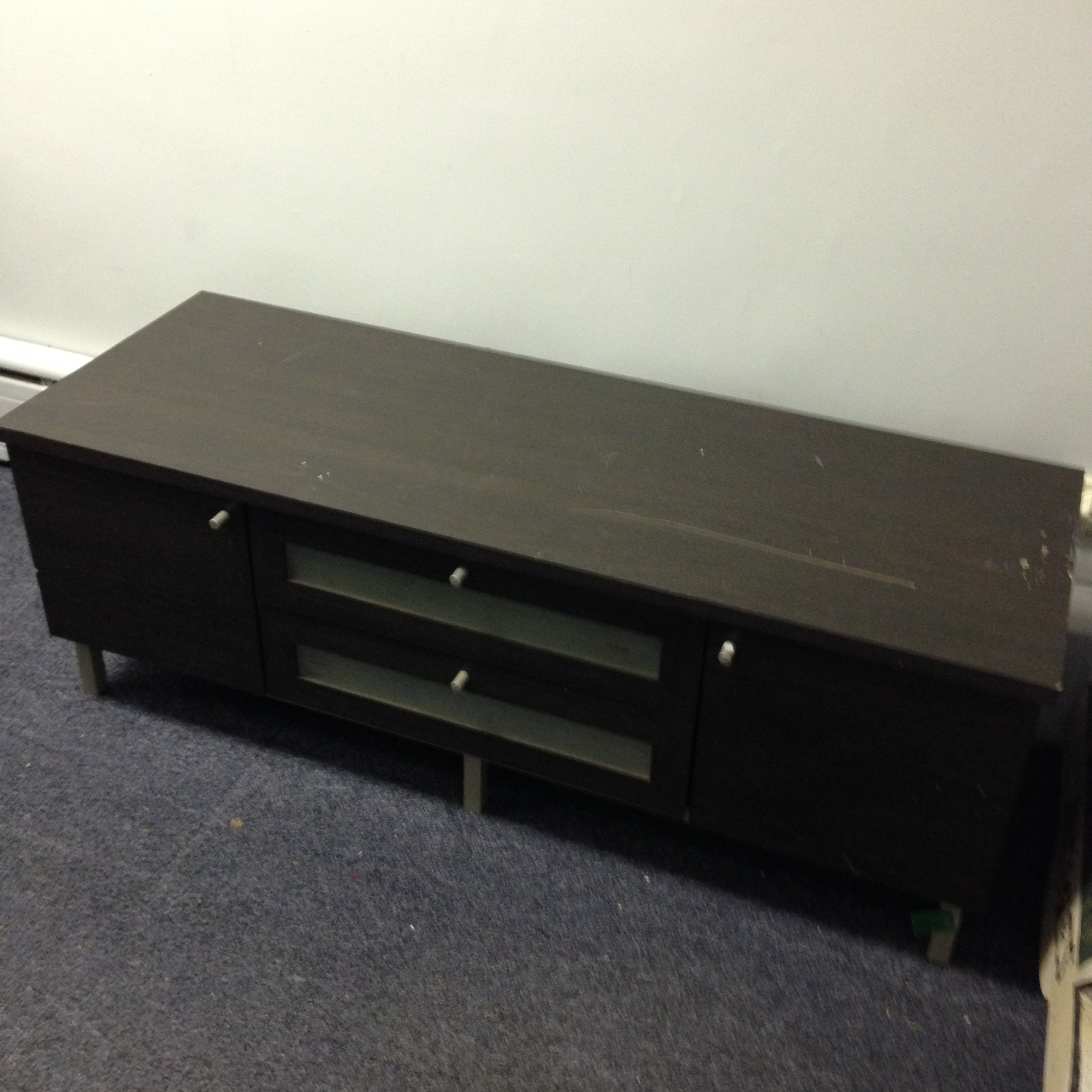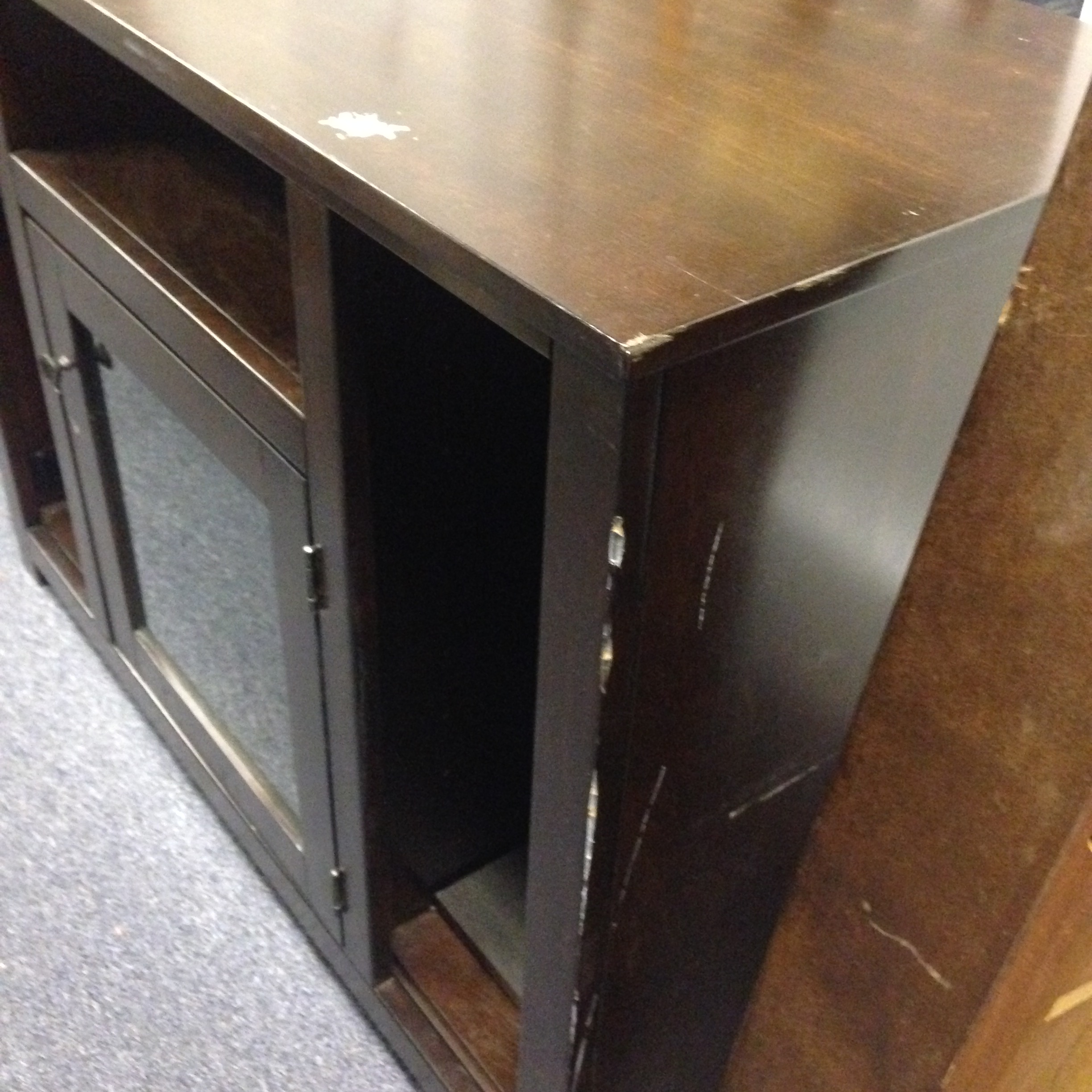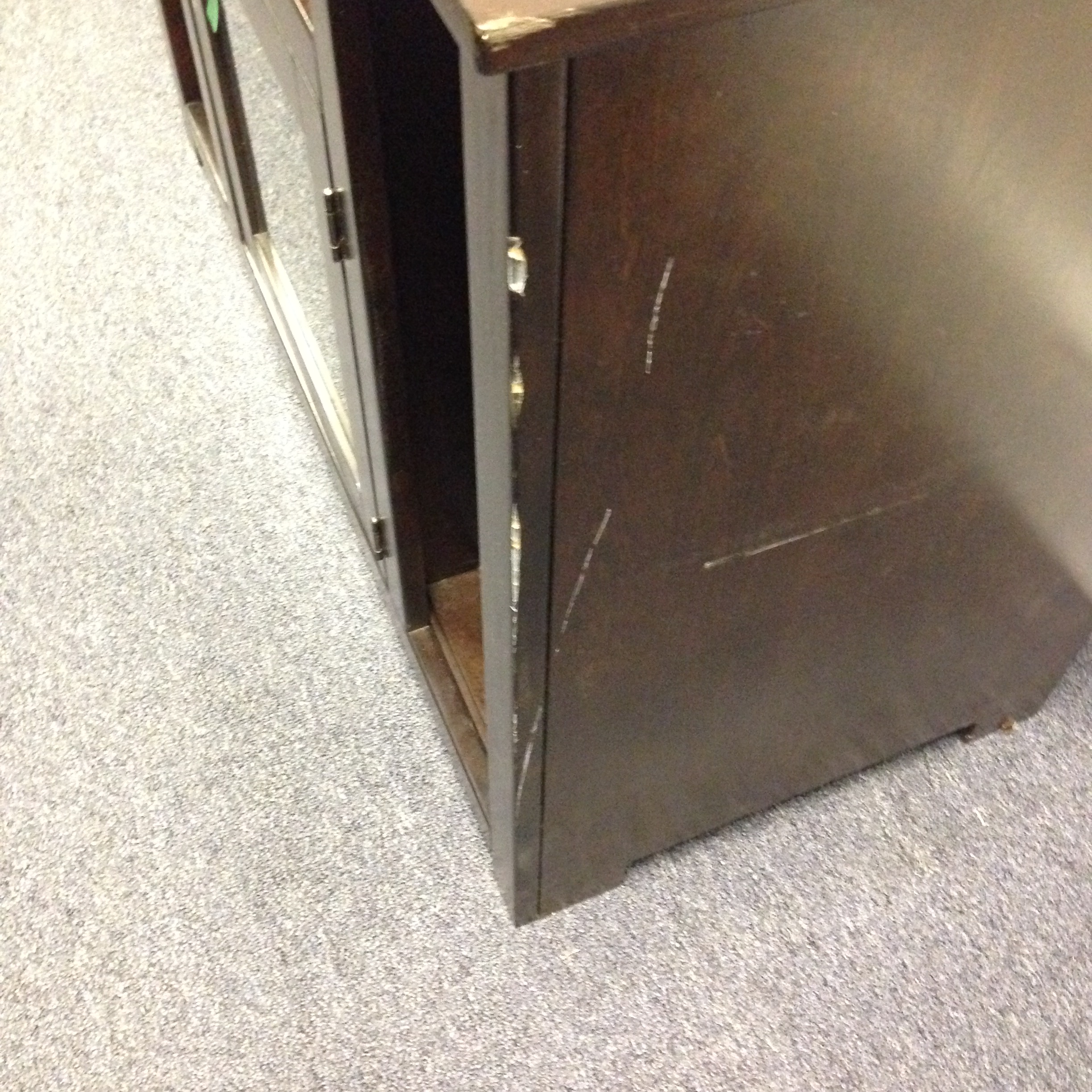 Entertainment Center #2. Tallish (maybe 3 feet high) and narrower than our other. This has a nice glassed in cabinet, with narrow shelves on the sides. Note the minor damage along the sides.