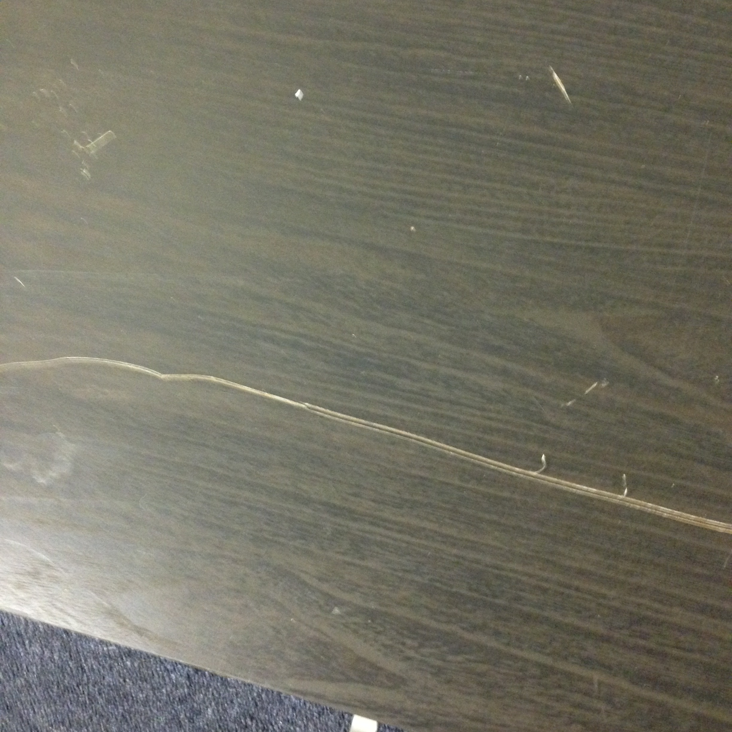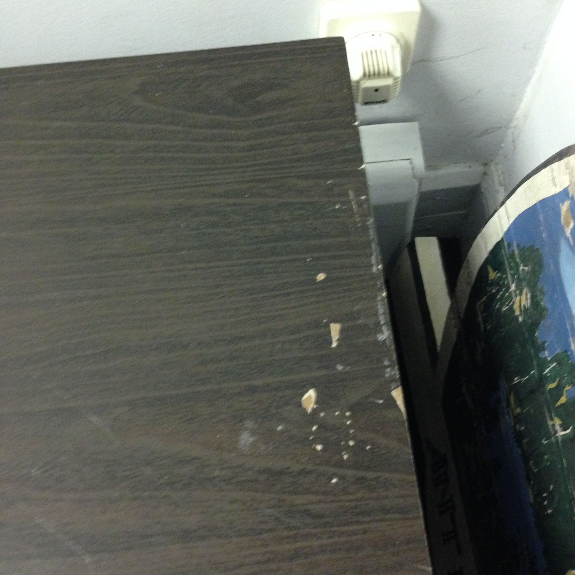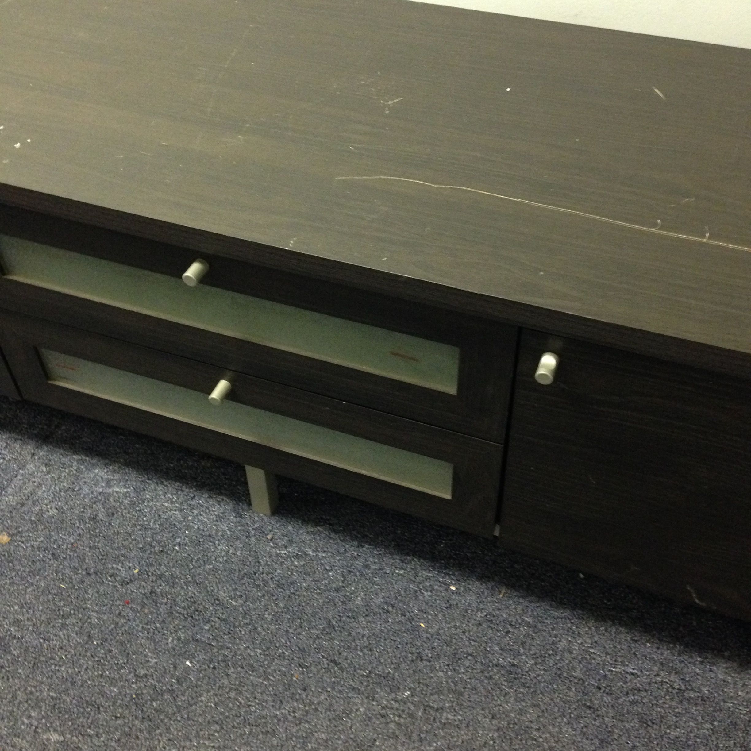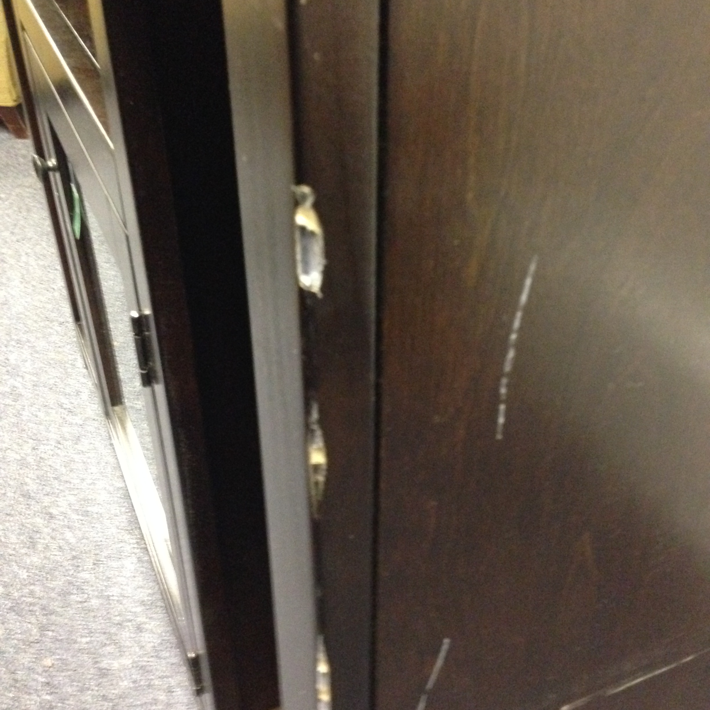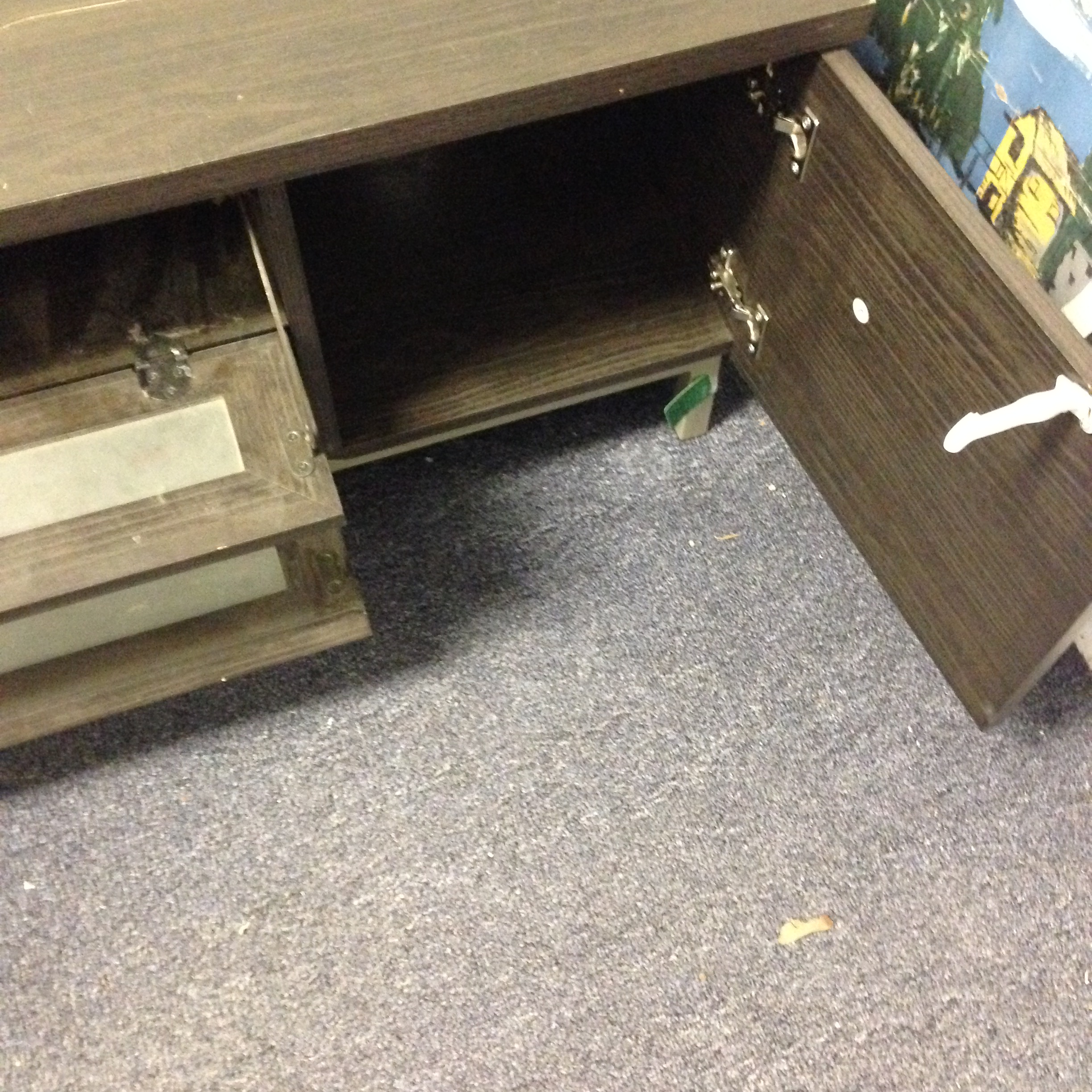 Entertainment Center #2. Tallish (maybe 3 feet high) and narrower than our other. This has a nice glassed in cabinet, with narrow shelves on the sides. Note the minor damage along the sides.