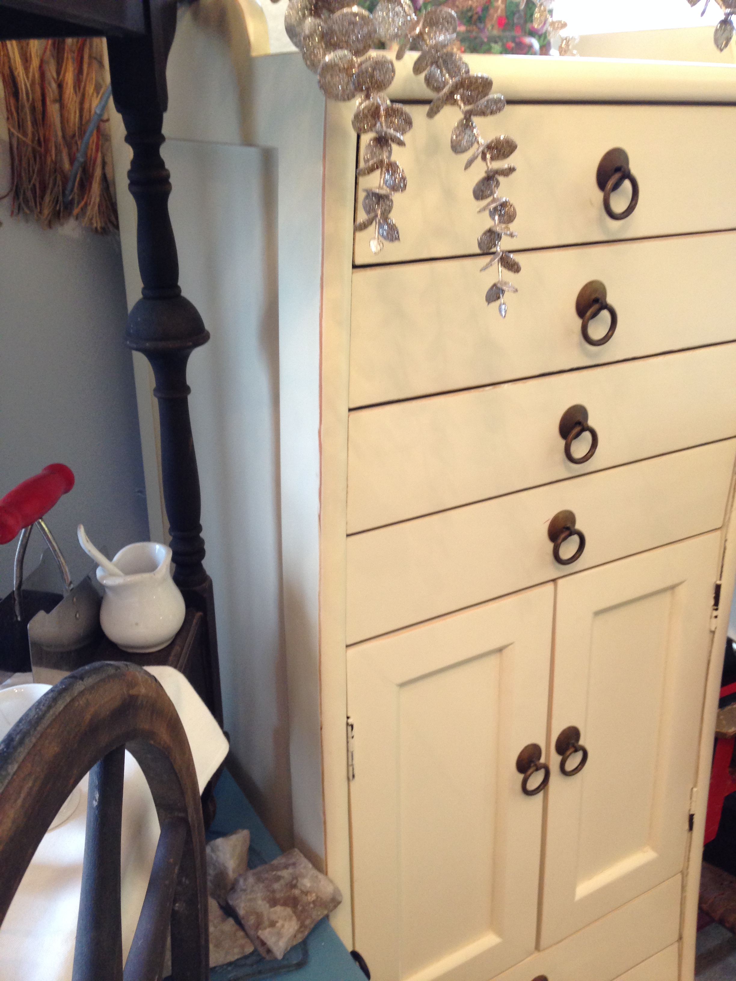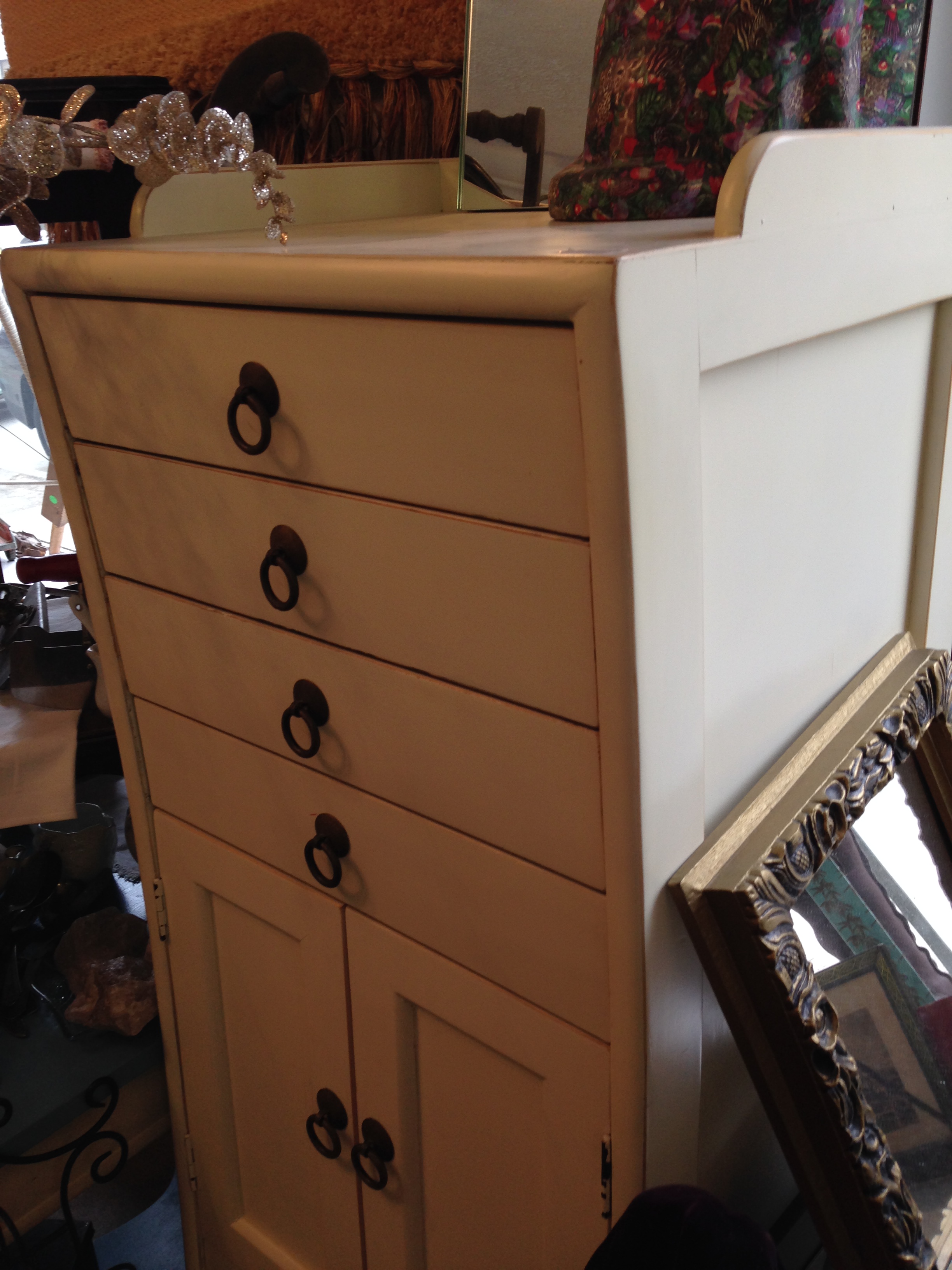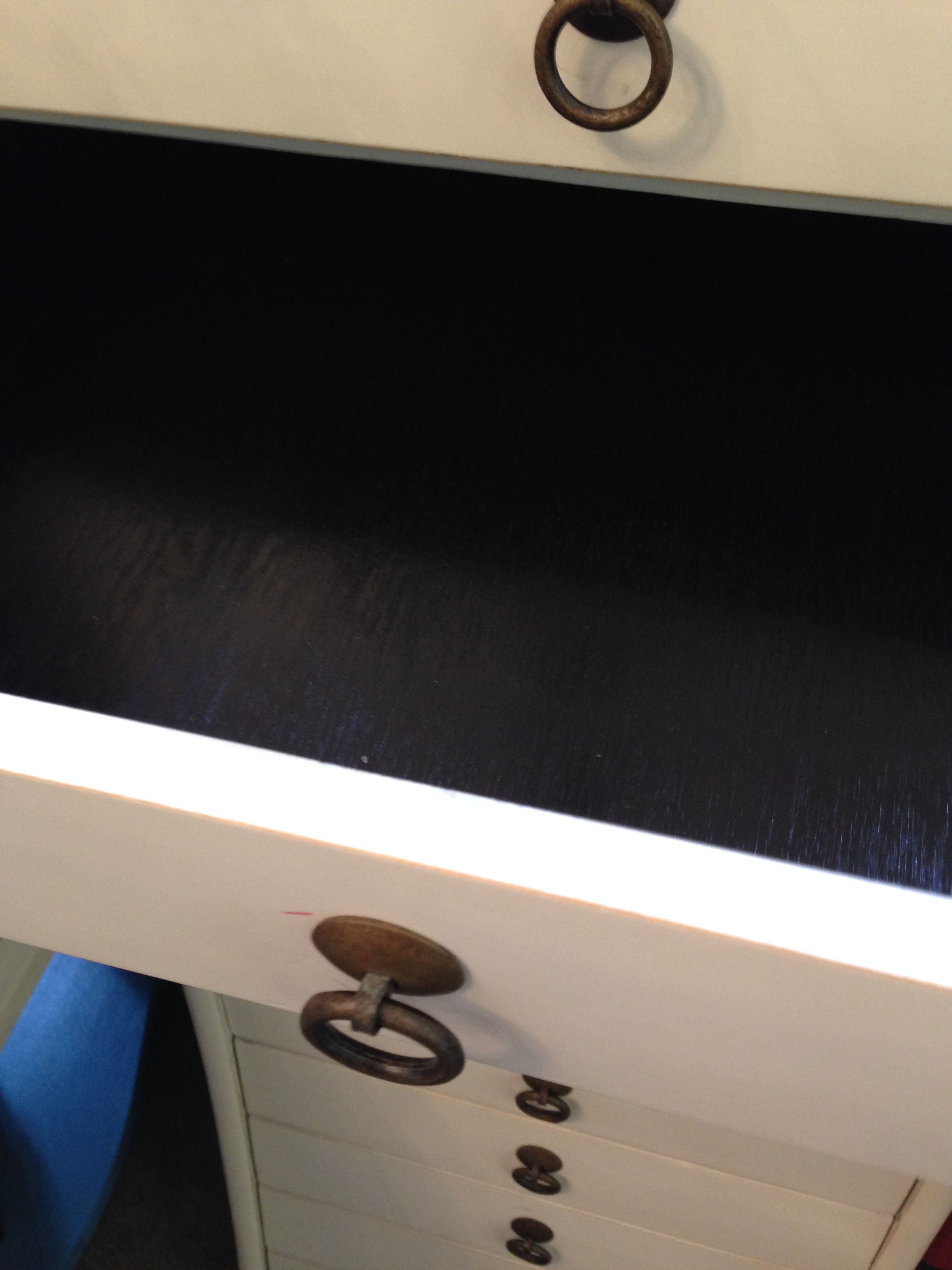 Condition: The chest is in almost pristine, ab-sa-root-ry gorgeous condition. I initially wrote that the only flaw was one tiny little red mark on the front, which it came with, but since then have found that there appears to be a dark rub mark on the left front leg as you face the dresser. (See picture below.) This may have come from something being pushed up against the dresser leg (our shop is pretty crowded).