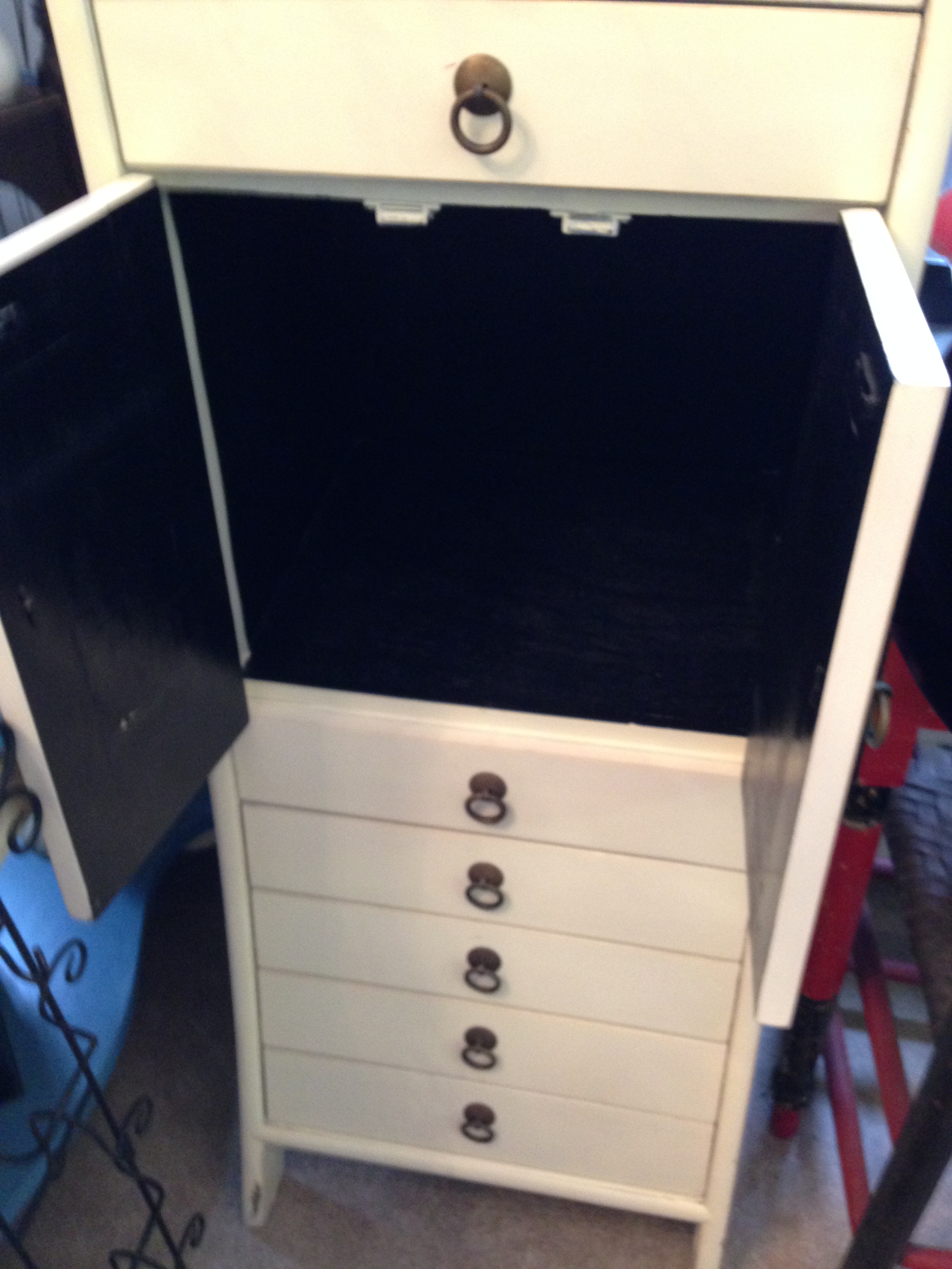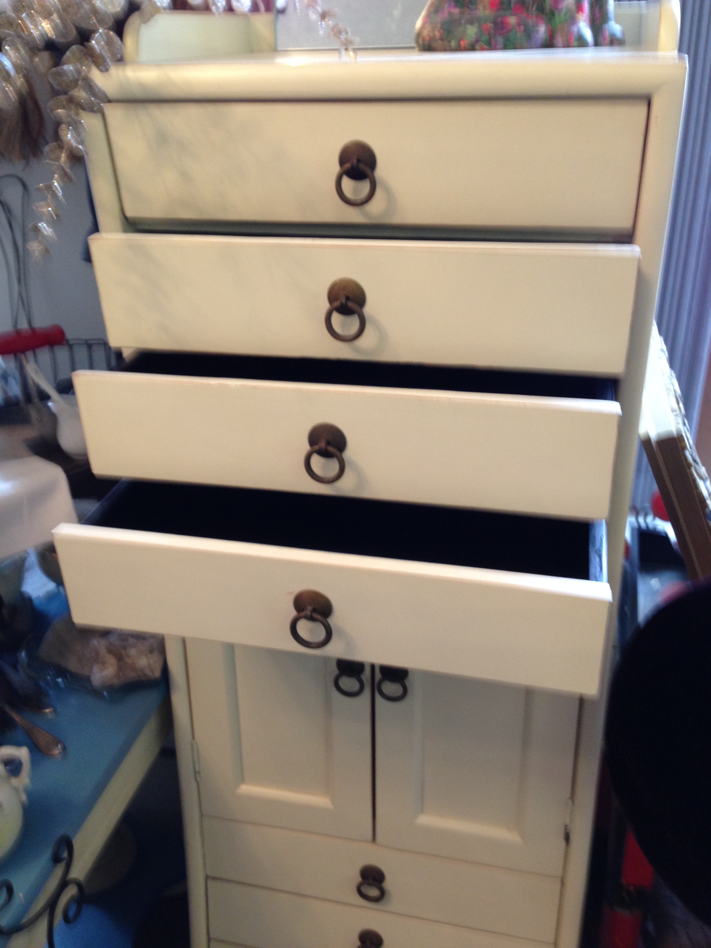 Dimensions: The dresser is 17 3/4″ W x 53 1/2 H to the surface. There is a 1 1/2″H lip on three sides of the top surface. The dresser is designed to bow out in the front so that the top is 15″ D with the lower half getting progressively deeper until the bottom is 21″ D.