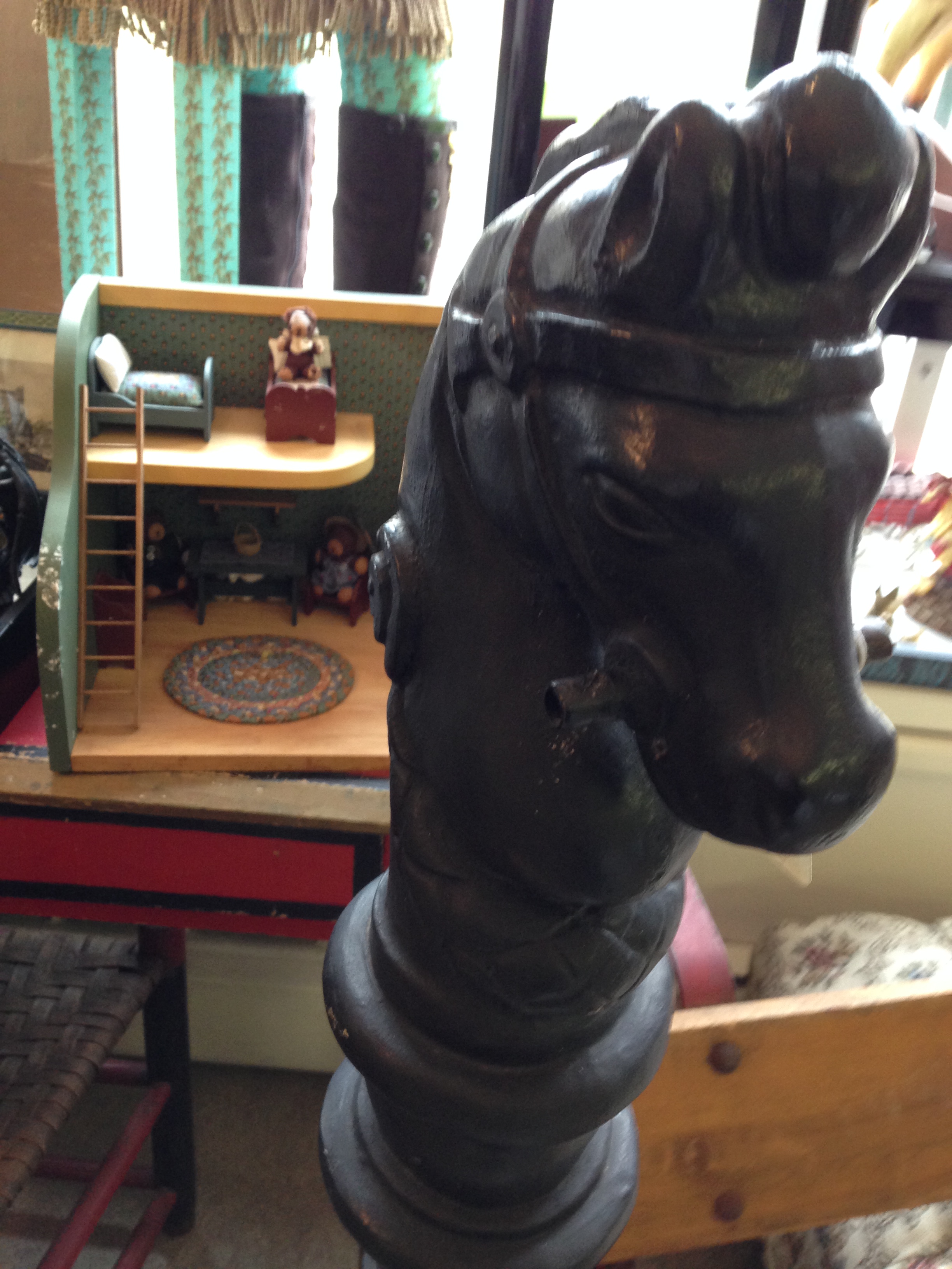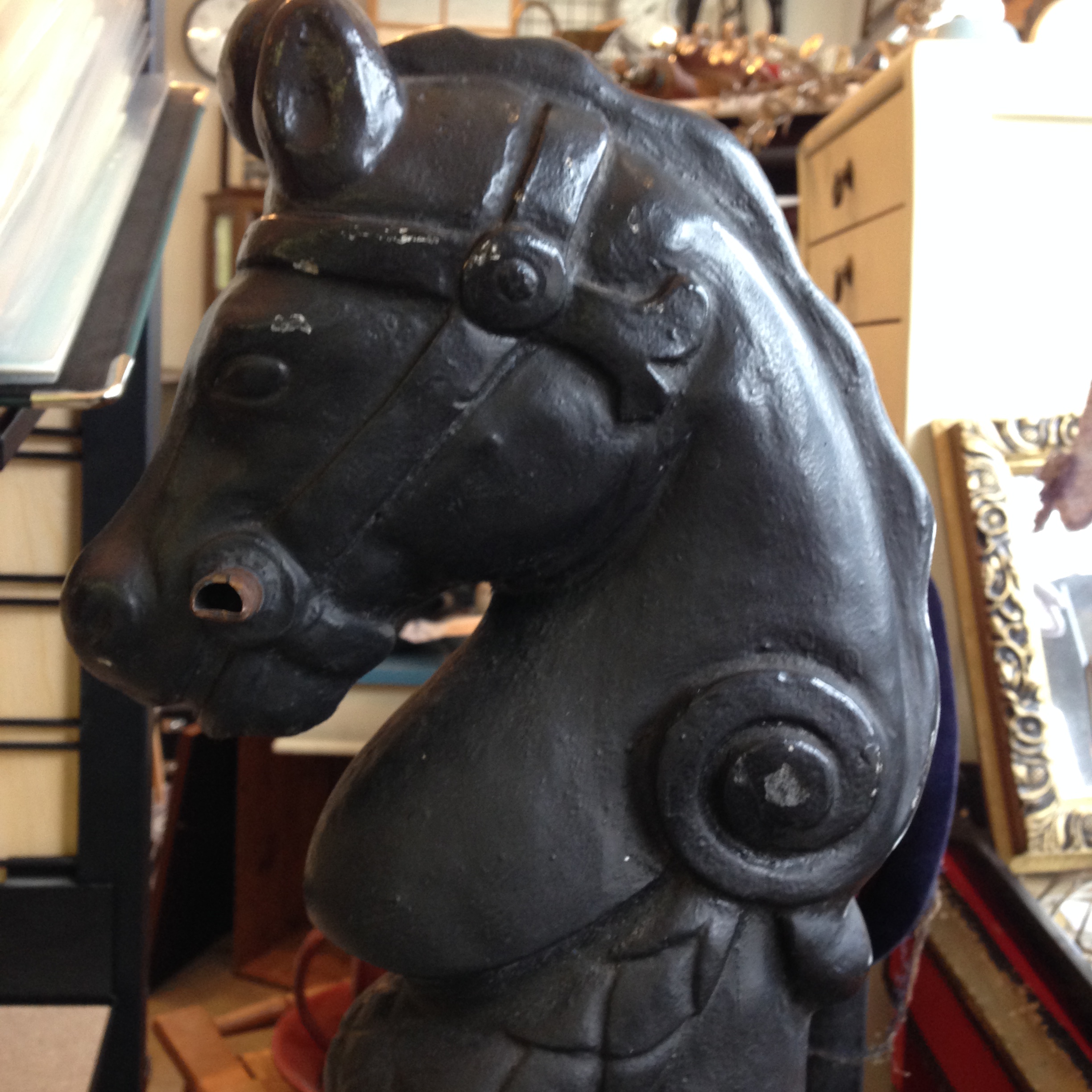 Condition: Our horsey post is a wonderful piece of metal and concrete. It’s missing the brass hoops as mentioned above, and does have a few dings in the concrete base, but otherwise it’s a great piece. And wicked heavy.
