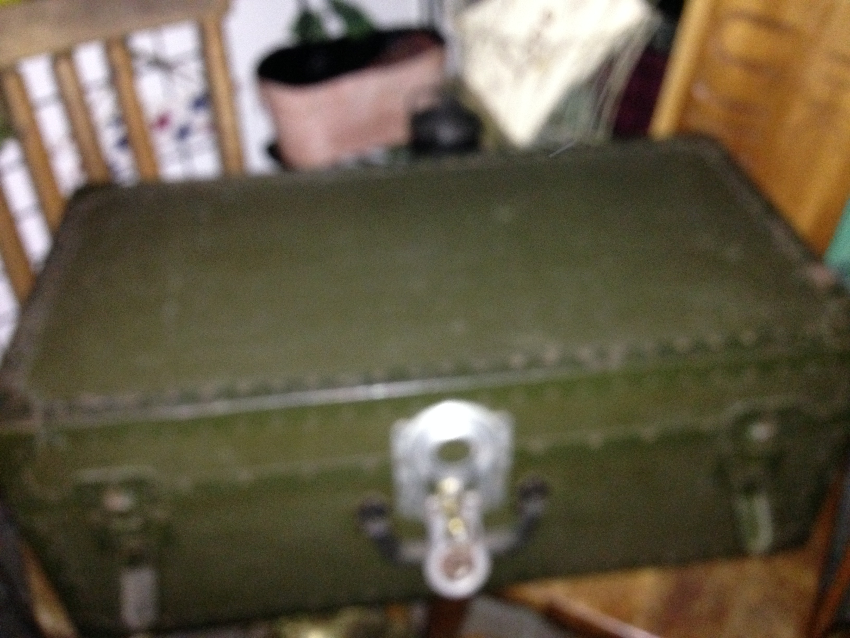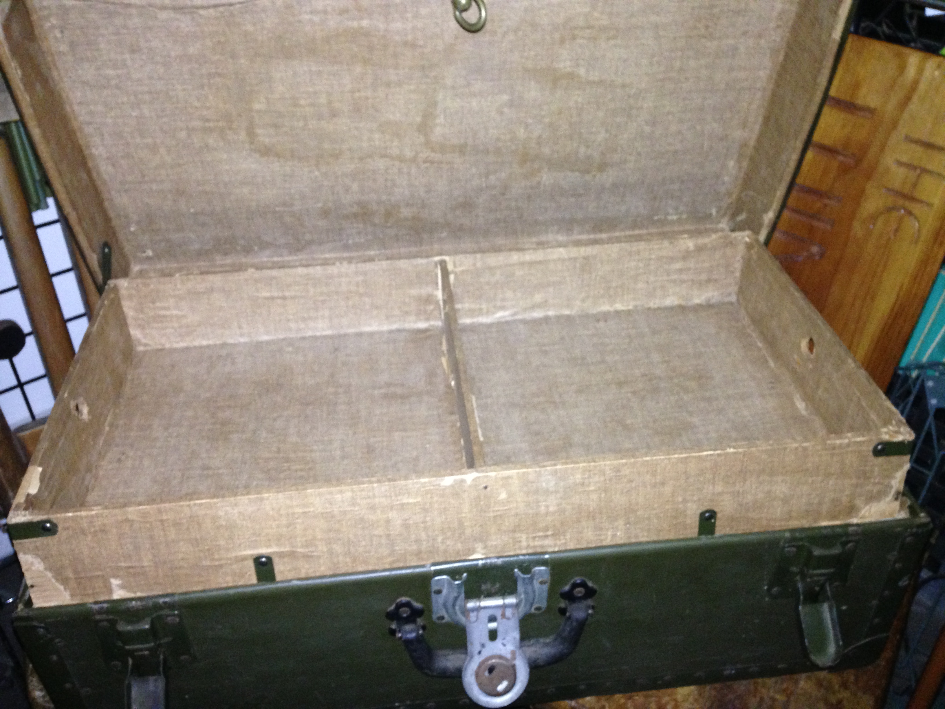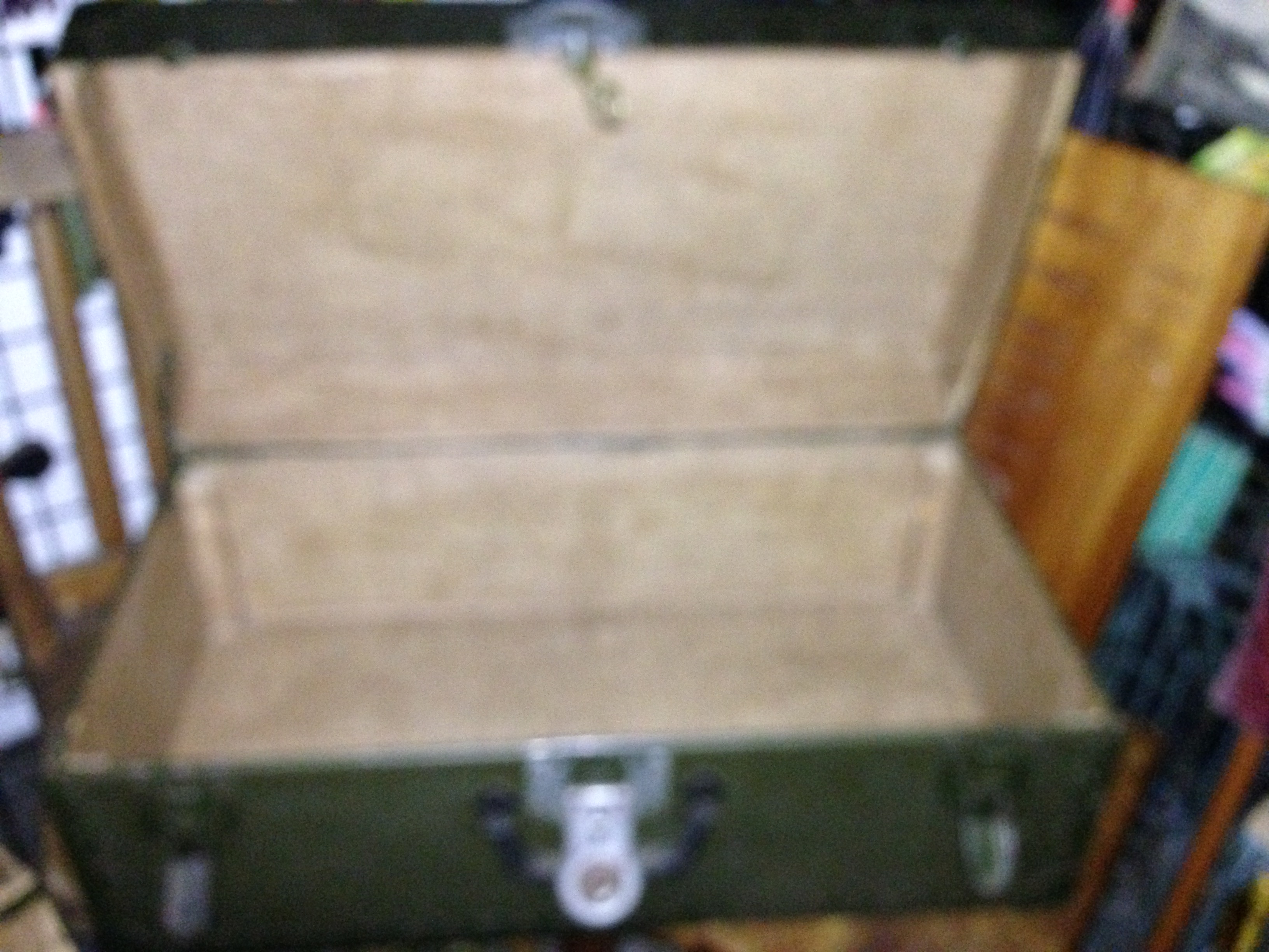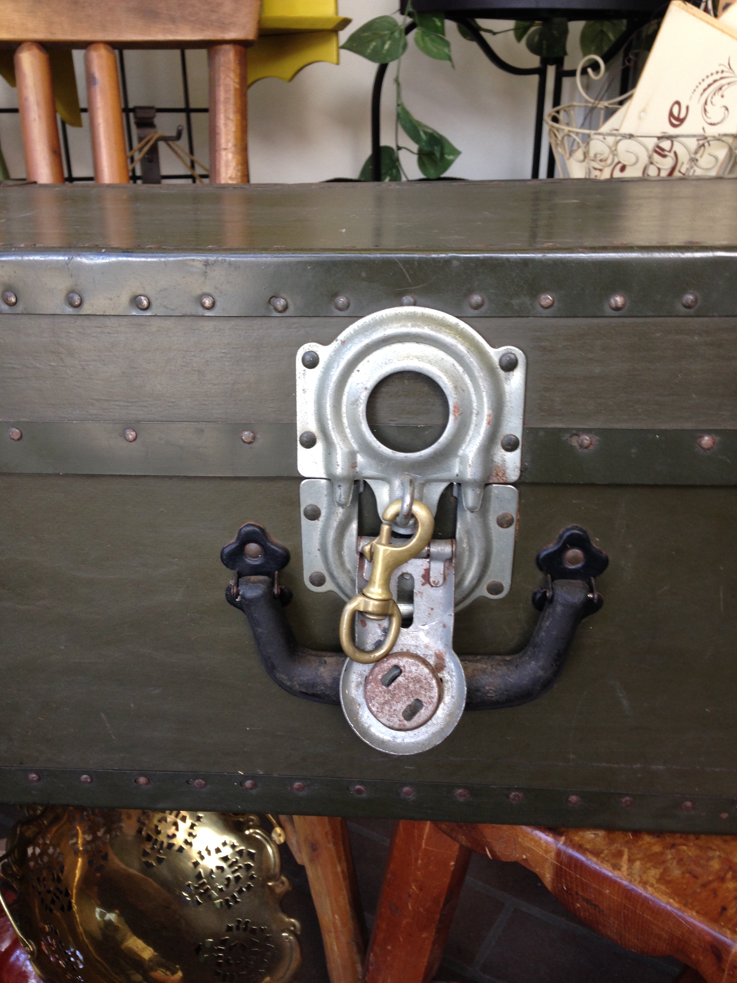 This is a fabulous WW II era army trunk in green made by Shwayder Bros, which was/is also the Samsonite luggage company. Note the metal reinforcements on the corners and around all the edges.