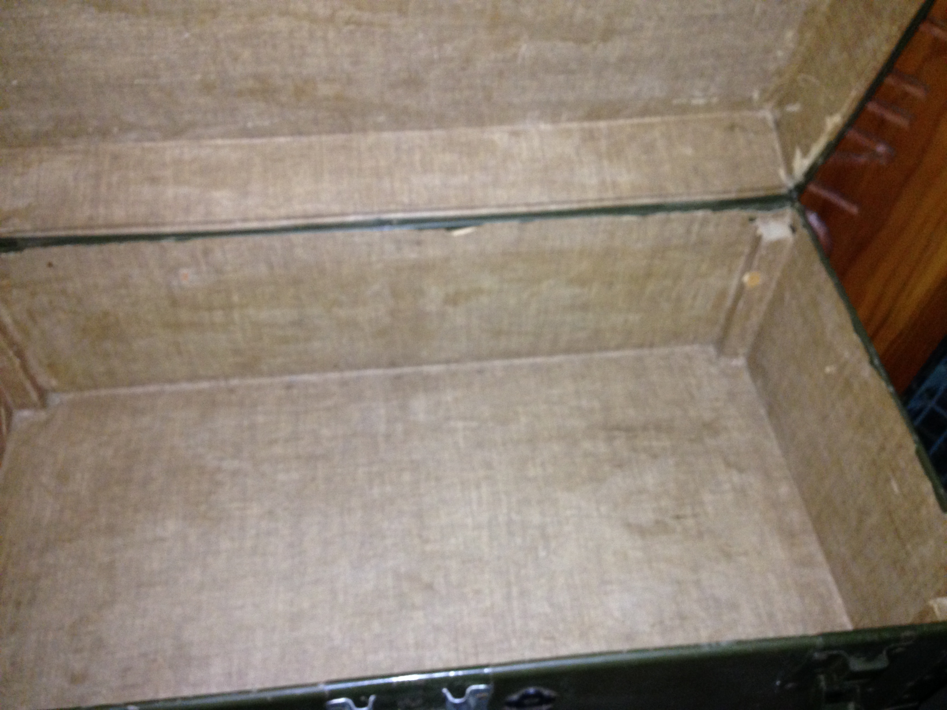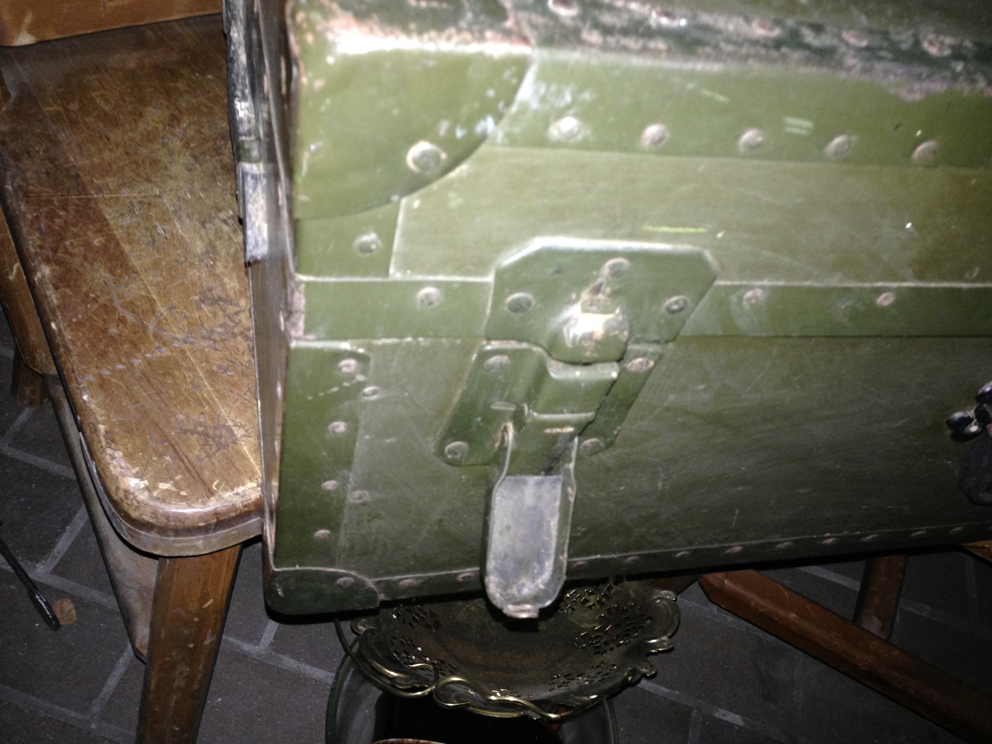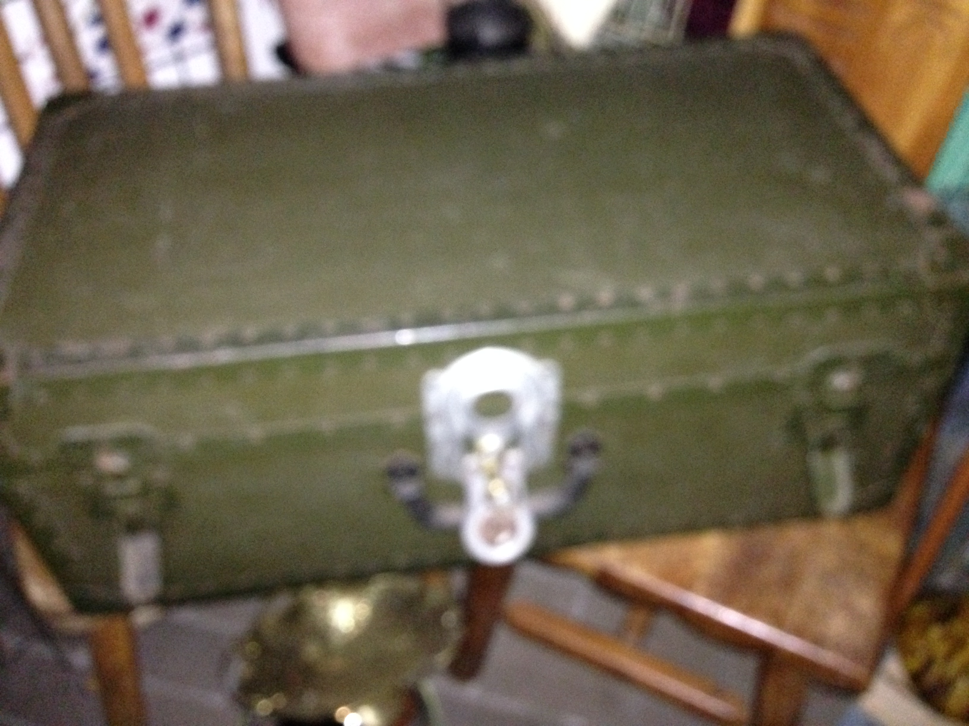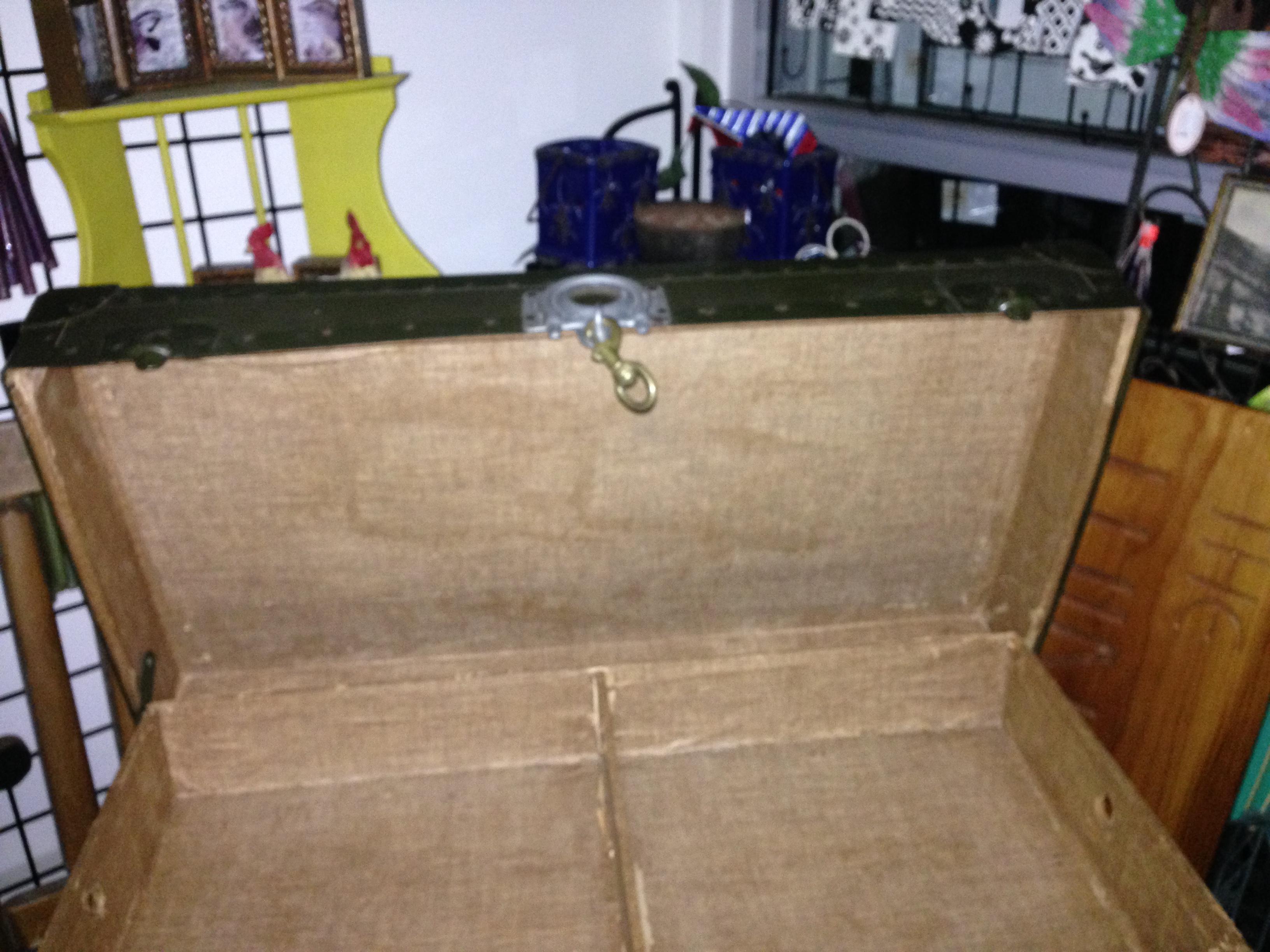 This is a fabulous WW II era army trunk in green made by Shwayder Bros, which was/is also the Samsonite luggage company. Note the metal reinforcements on the corners and around all the edges.
