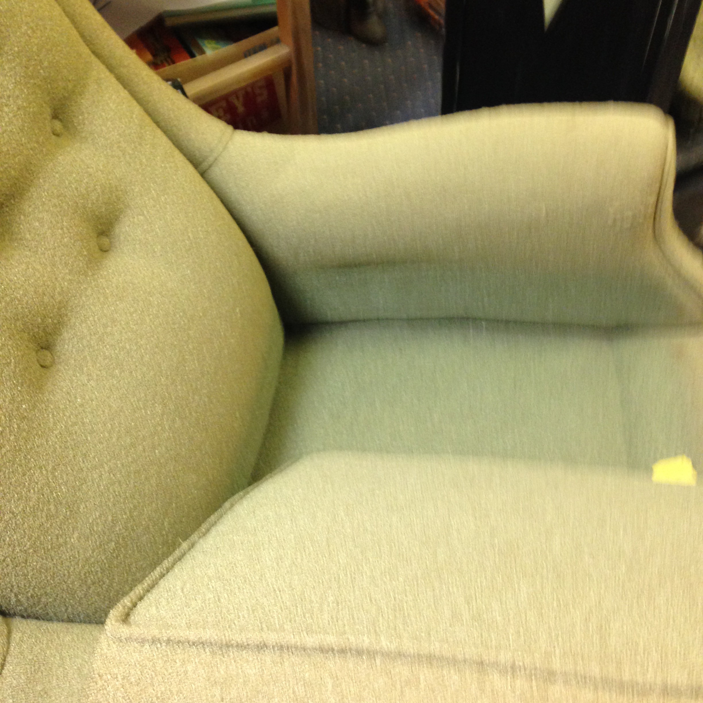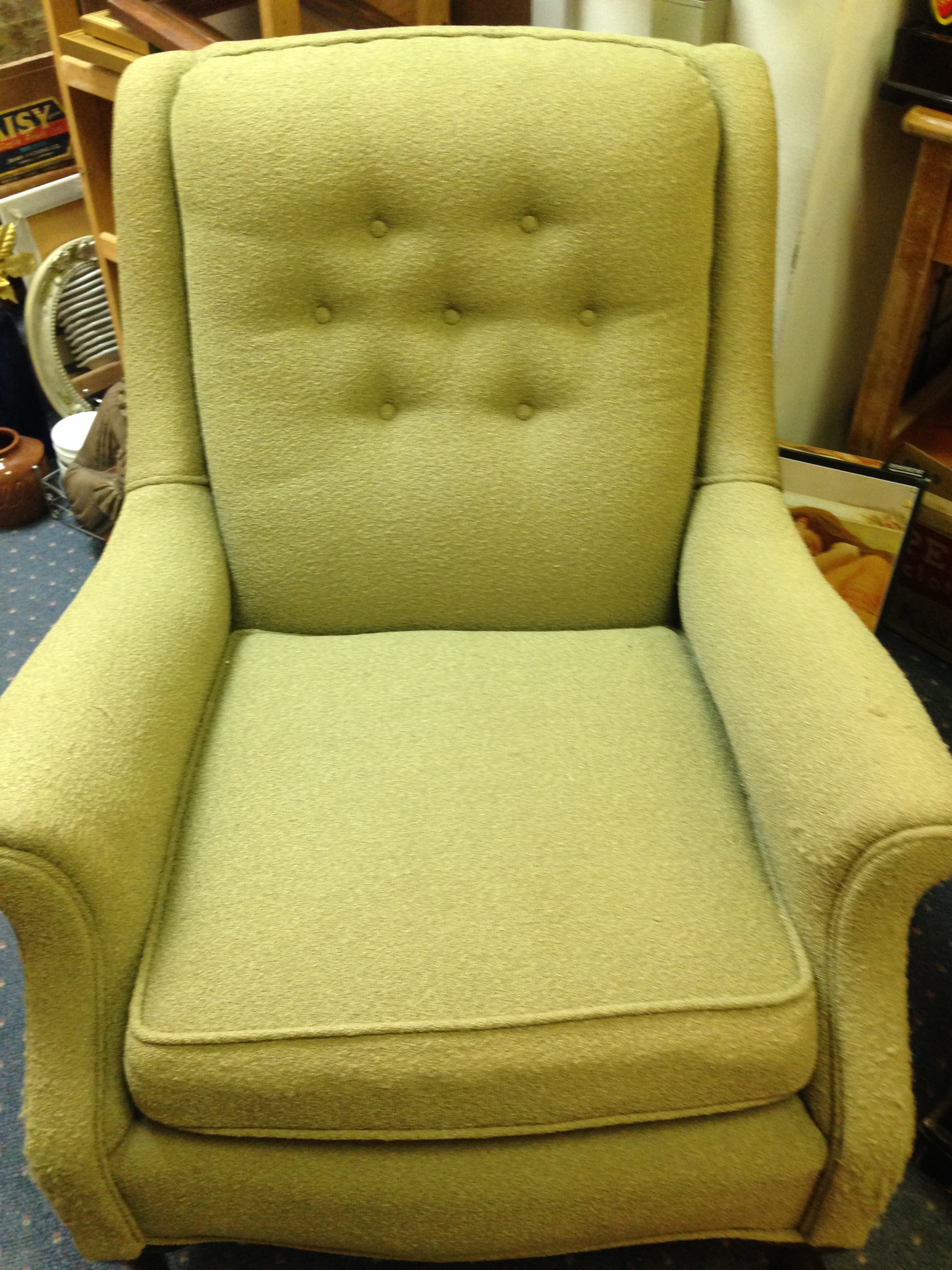 Here’s a nice little upholstered chair just waiting for someone to take it home. While it’s nothing particularly special to look at, it is comfortable. It would make a great camp or porch chair, or even one for the kids’ playroom. The color is sort of a light sage.