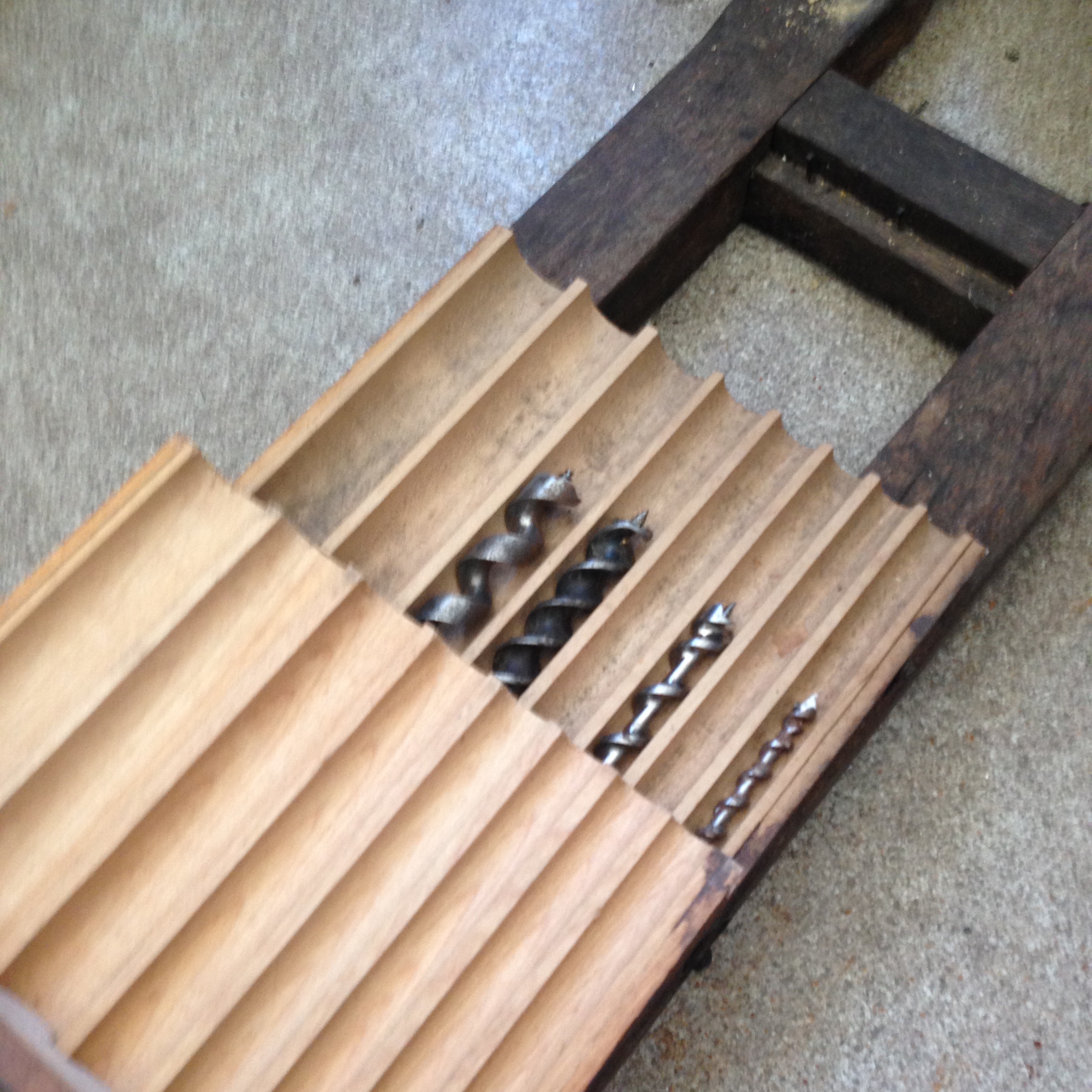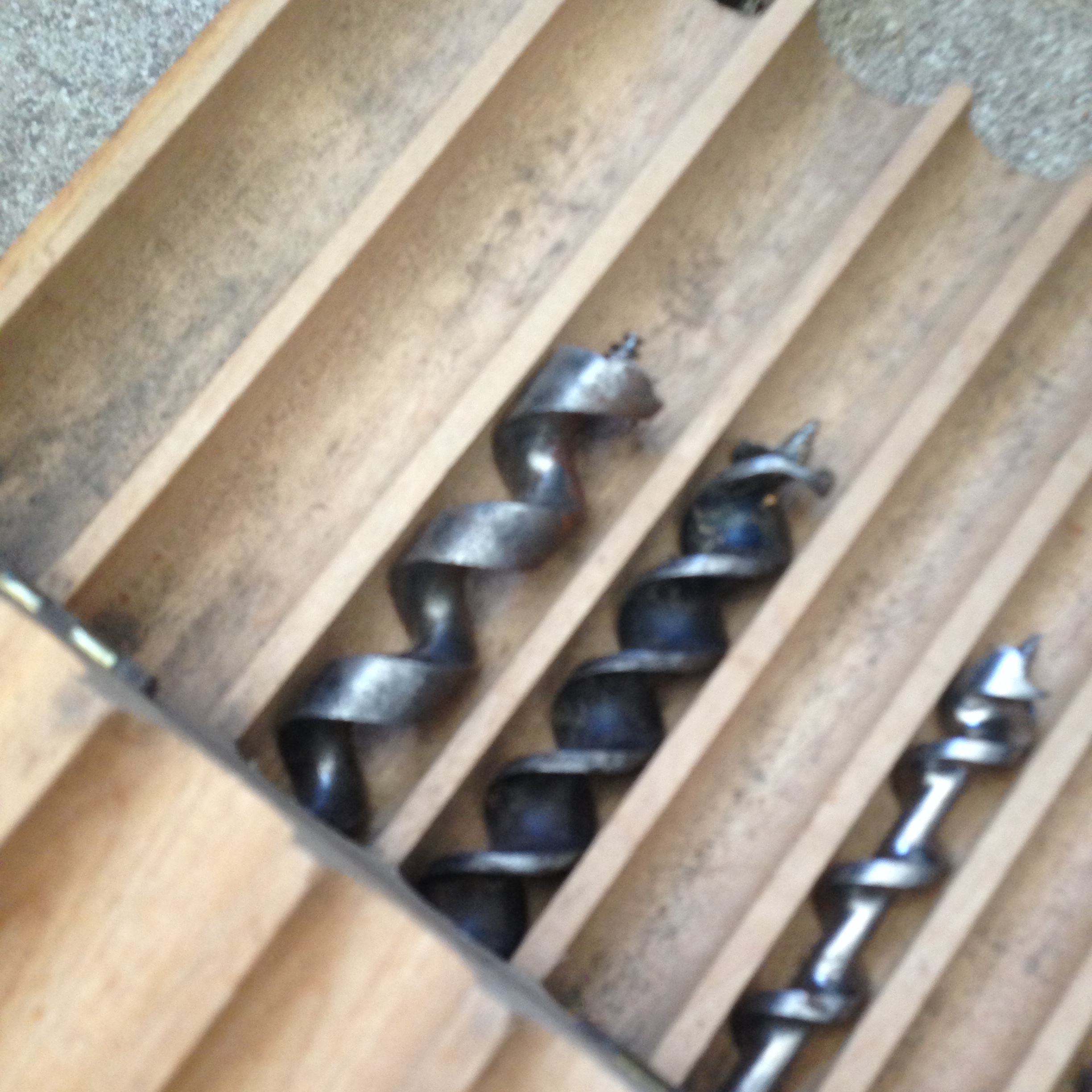 Includes a wooden hinged box that was made to hold 8 auger bits. The box has 5 of its original bits.
