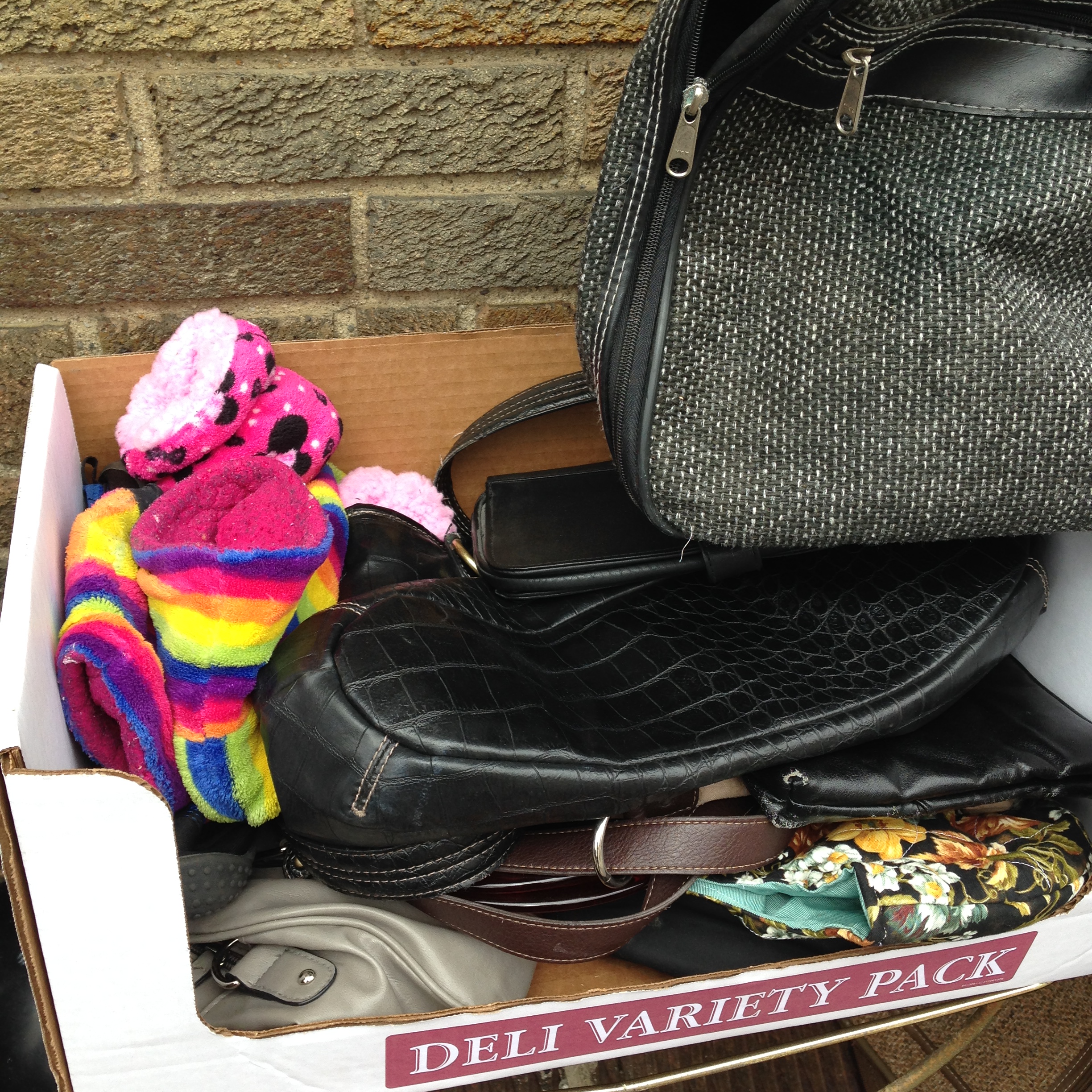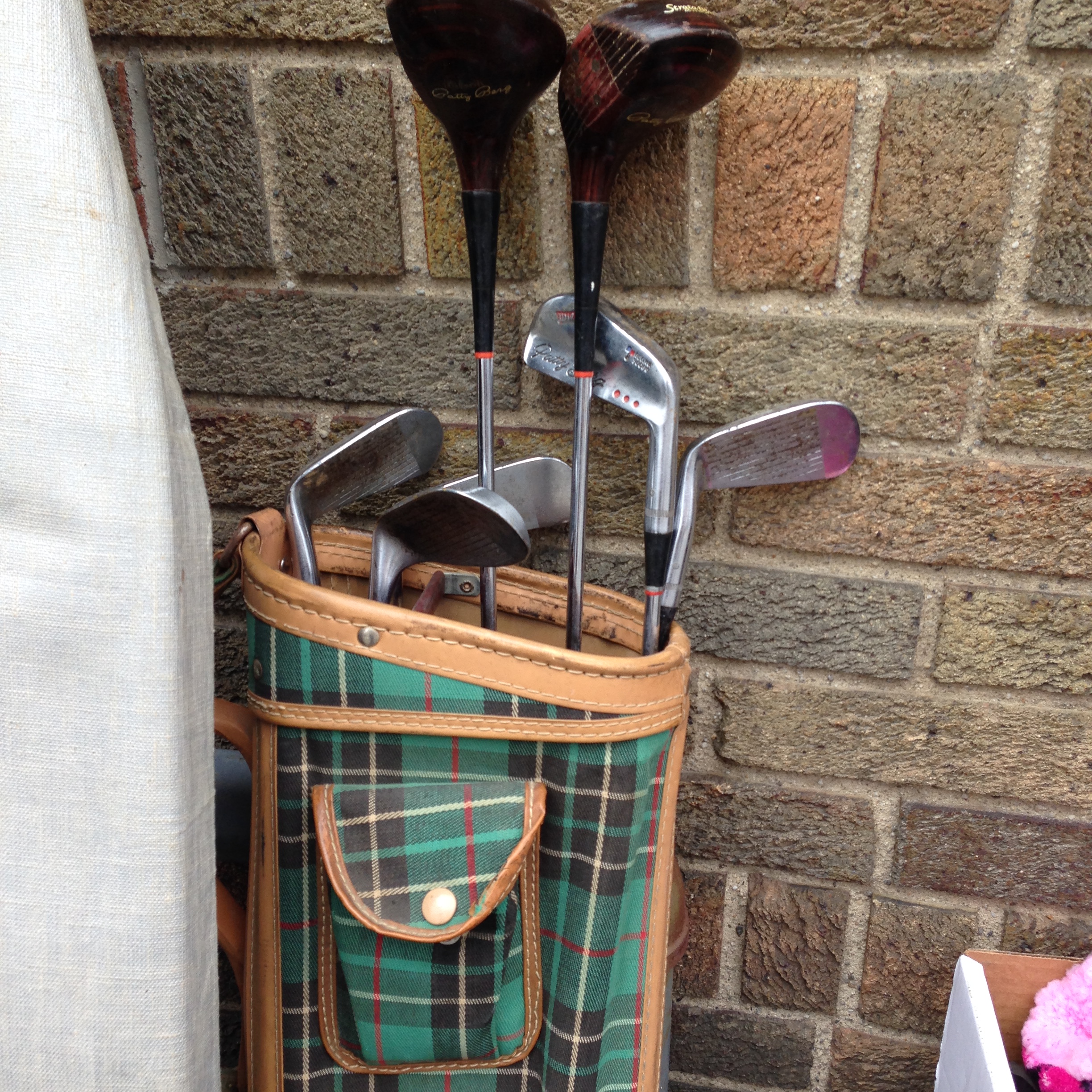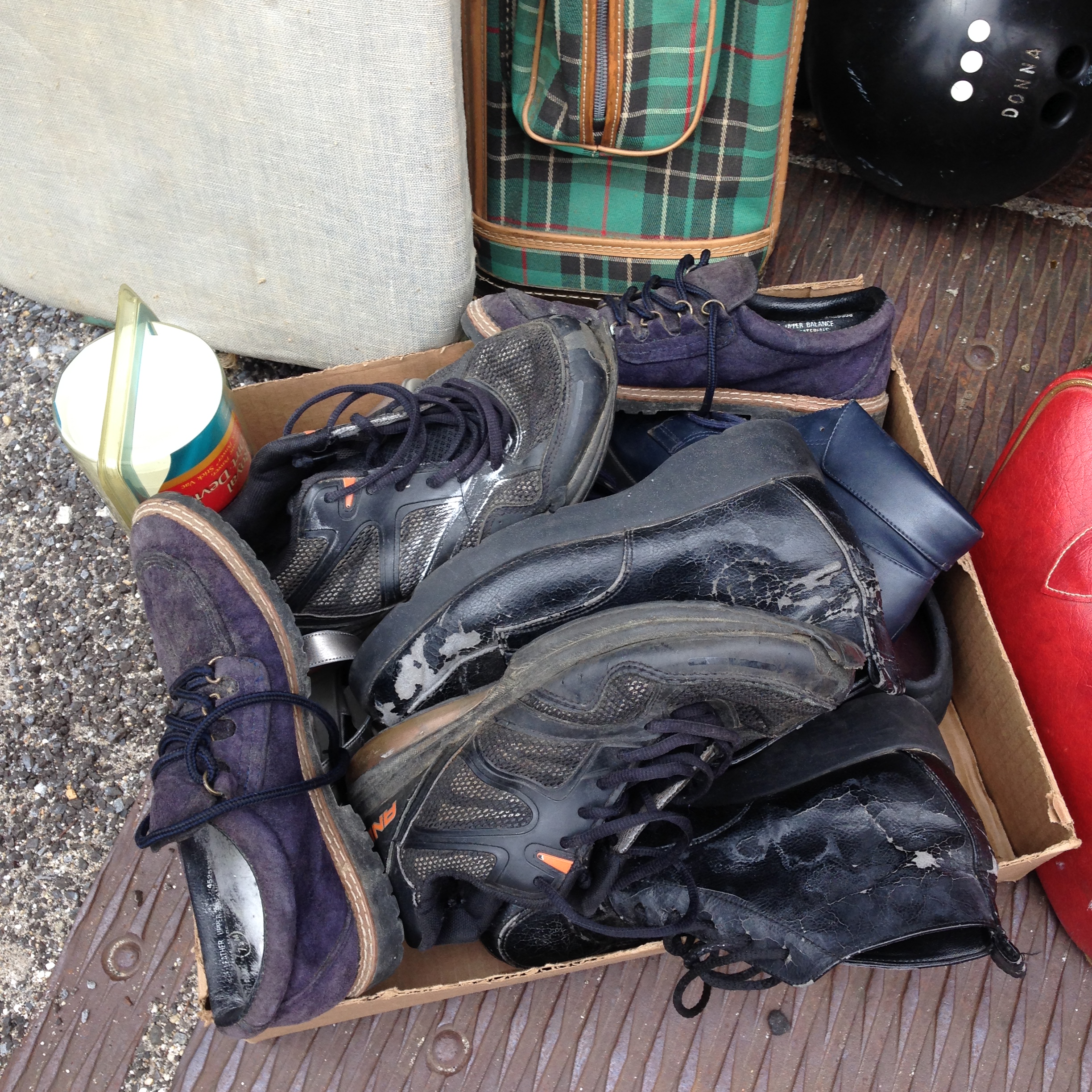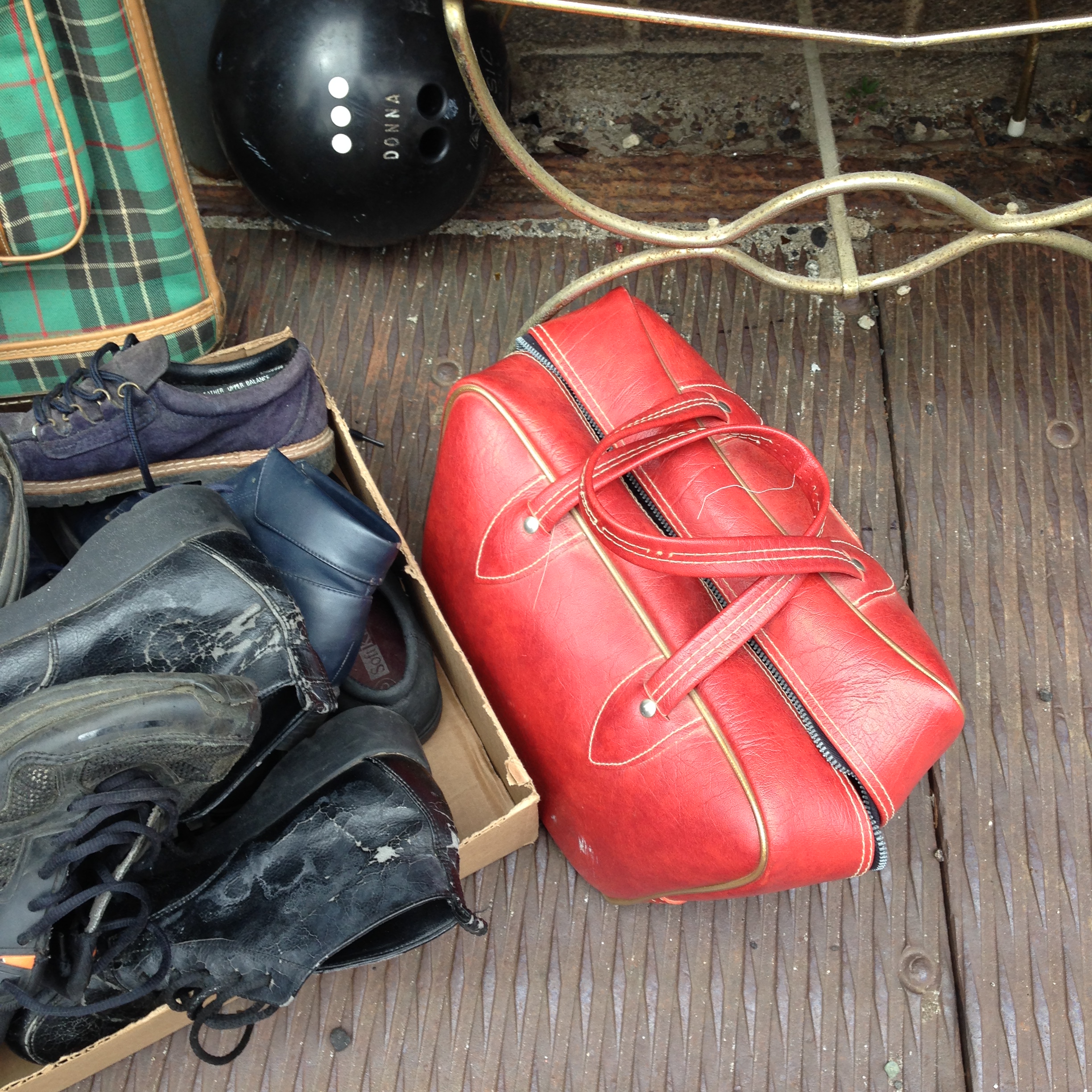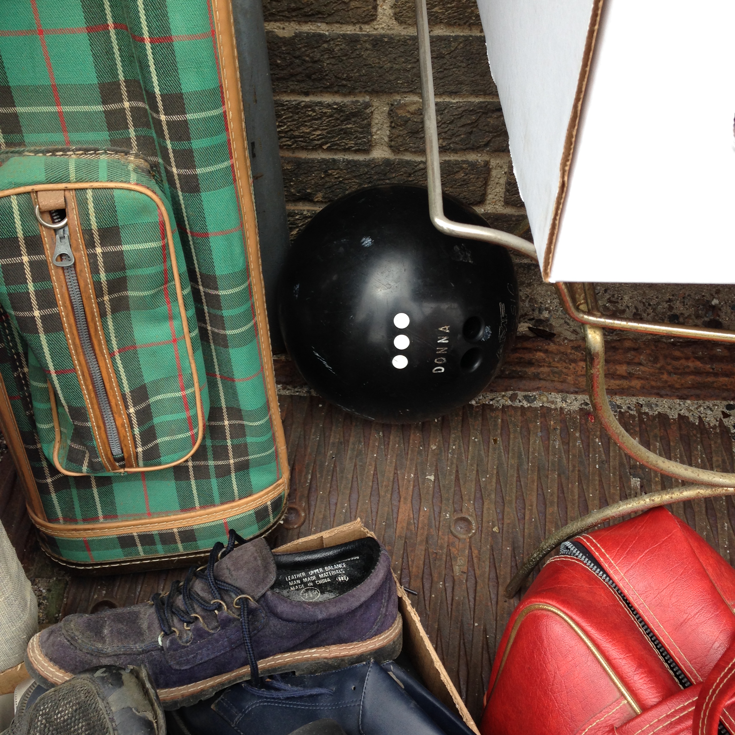 There are a couple of bowling balls (one in a bag), a great Jaguar brand carryall, some golf clubs, an old-fashioned ironing board, shoes, and miscellaneous other items.