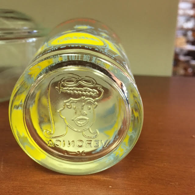 Vintage 1971 Archie’s “Having a Jam Session” Welch’s Grape Jelly Jar Glass featuring Archie, Veronica, Betty, Jughead, and Reggie jamming out with Hot Dog holding his ears. The graphics are in good shape, and there’s even a picture of Veronica on the bottom of glass. Approx 4″ tall.
