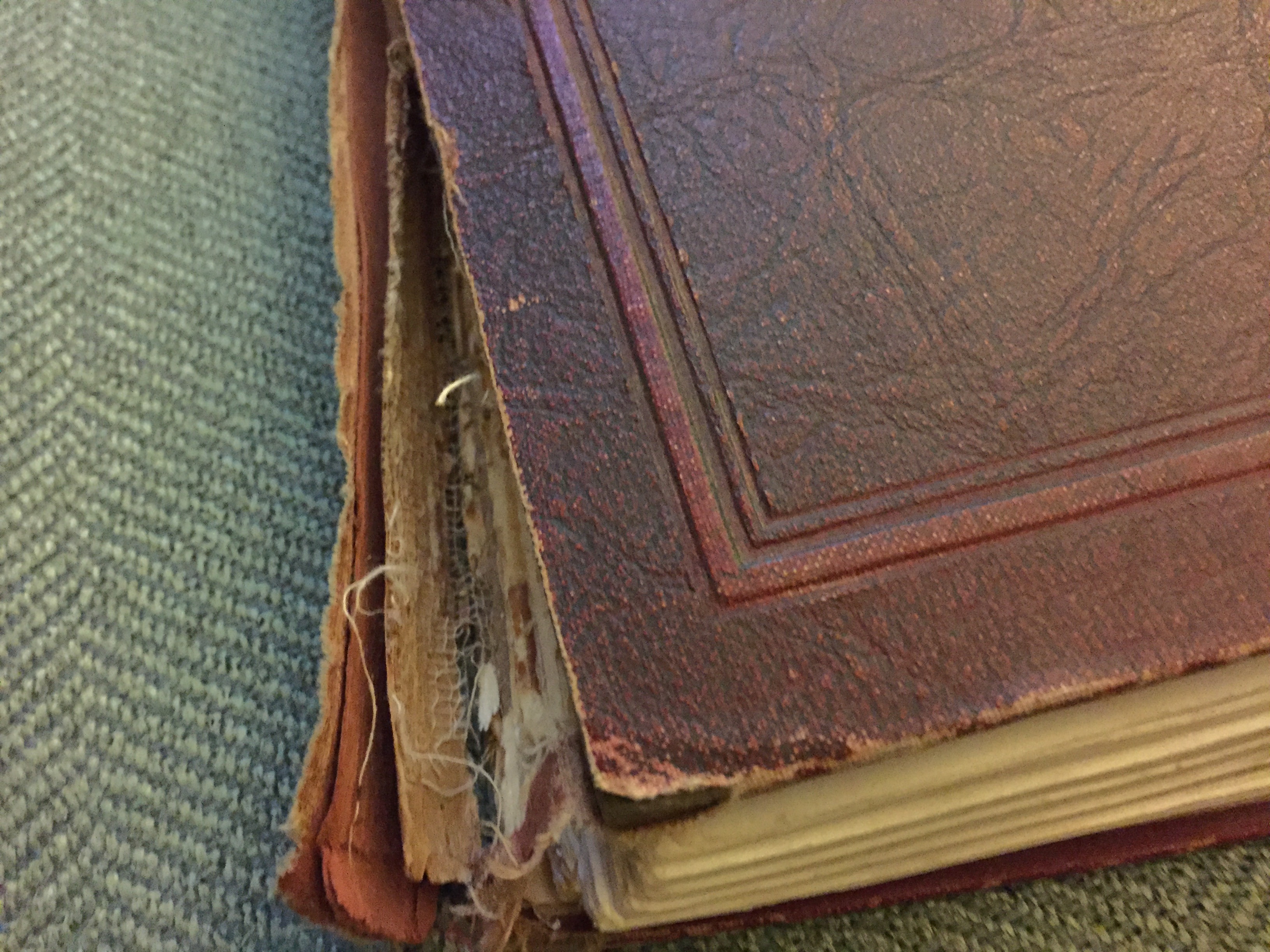 Every single page – from the very first to the last – of the original book is covered with a clipping, chronicling events such as weddings, funerals, local catastrophes, ships launched in the local area (including YMS 104 and 106, mine sweepers), horse race info, and world news items in general as well as items of local interest. Included are some cartoons, ads, poems and clippings on war heroes. Some of the original book can be seen between the clippings.