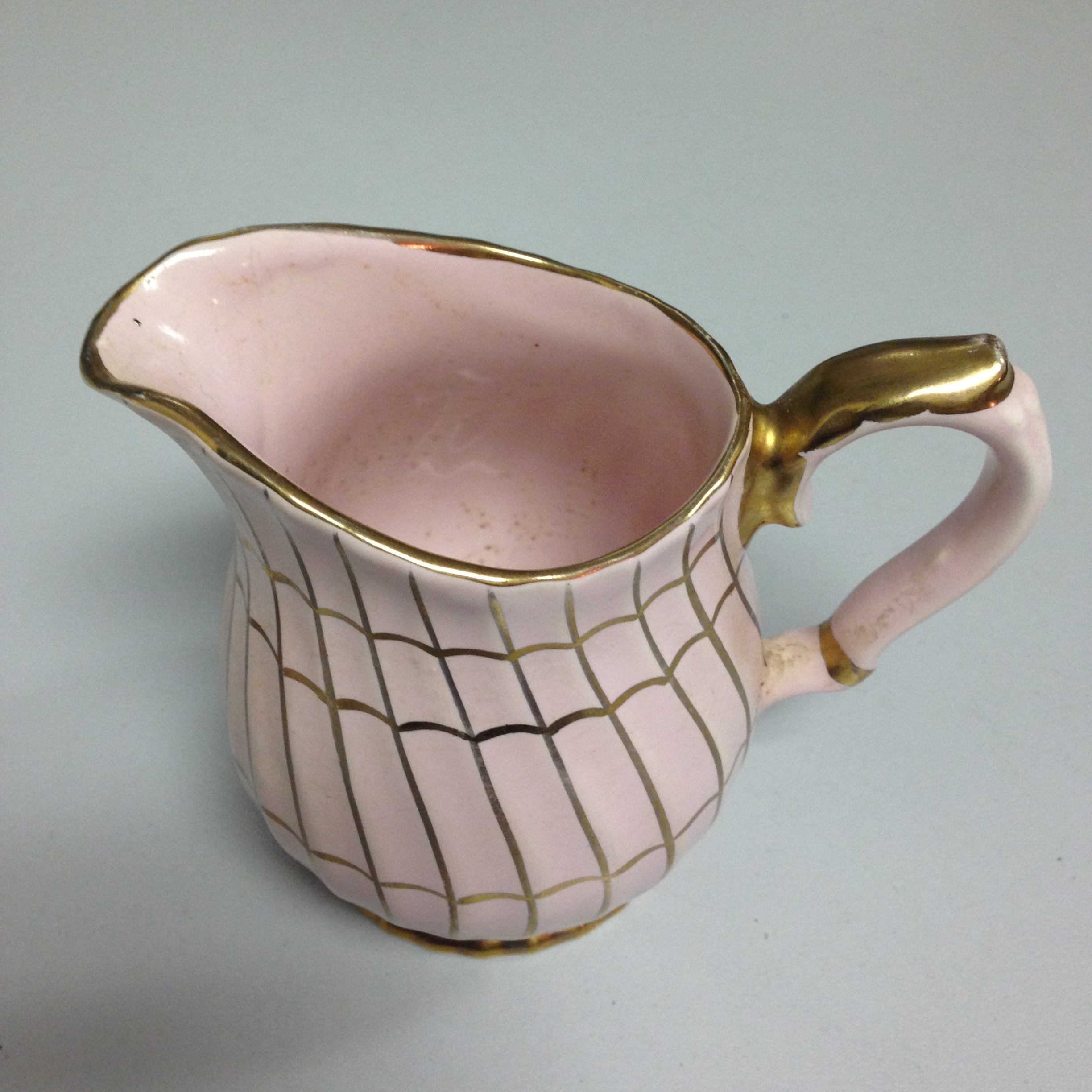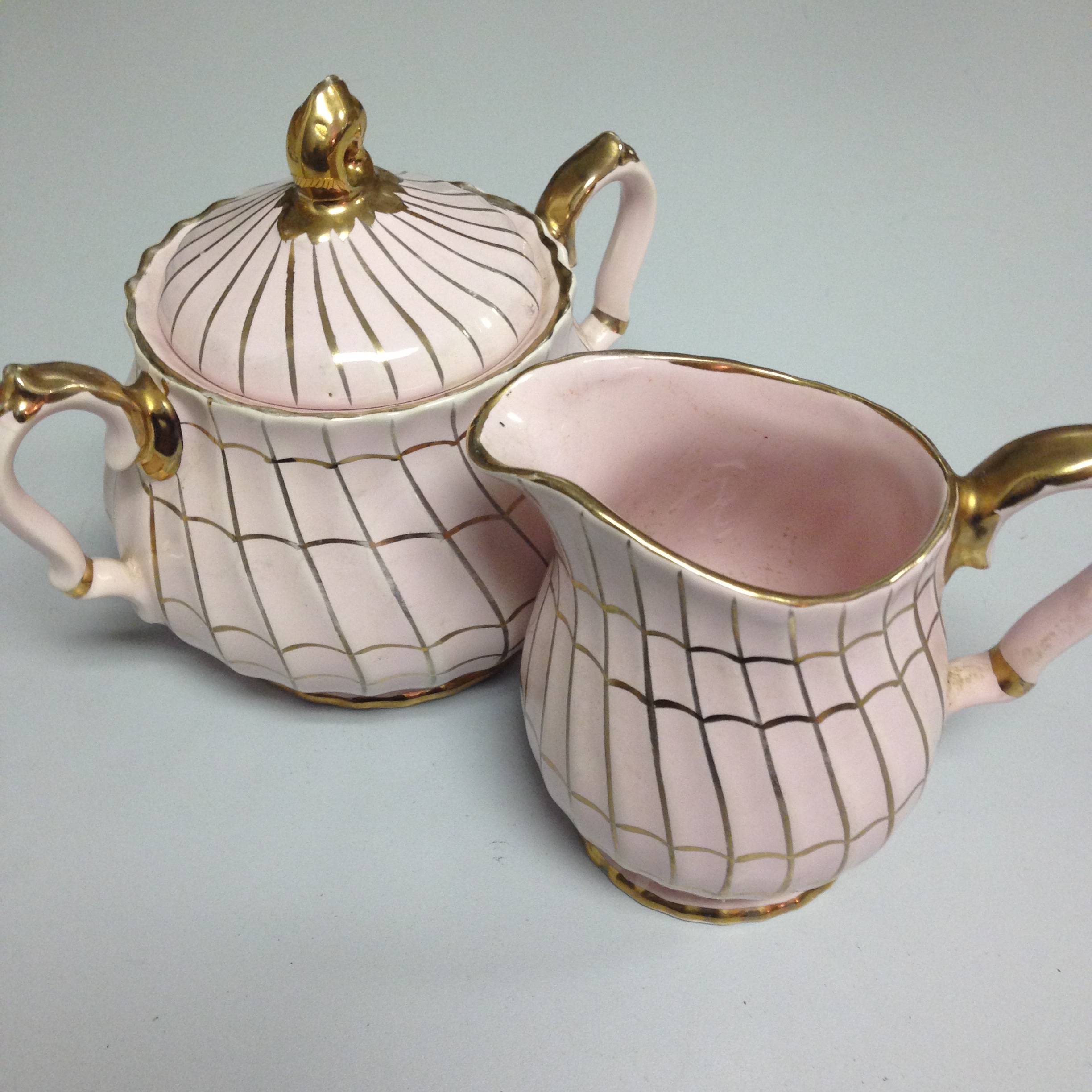 Vintage Sadler, England sugar & creamer set. Pink with gold swirl.