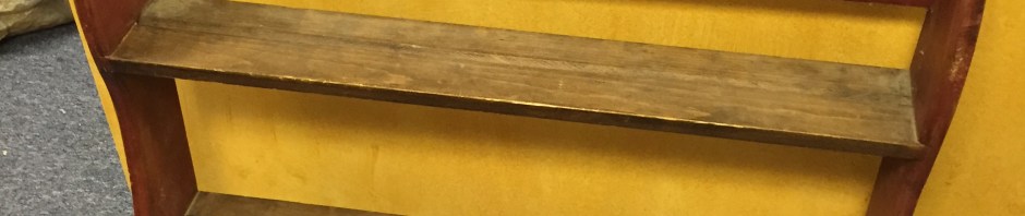 This vintage plate rack has 3 shelves with grooves to hold plates (or other items) upright, and a wire hanger on the back. There’s a nice little heart shaped cut-out in the middle.