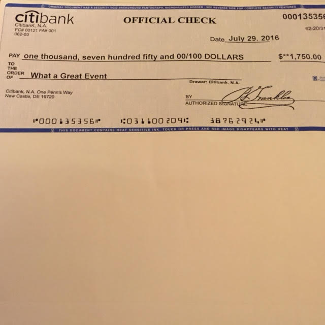 ME: Make the check out to What a Great Event. The mailing address is P O Box 282 Auburn ME 04210. With tax the total is $261.64.