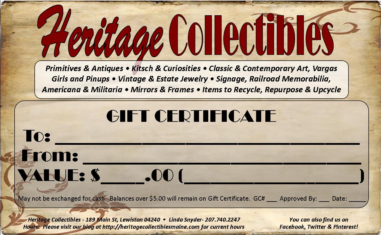 NOTE: With the exception of books, maps & music, most of our antique and other inventory can now be found at the Undercover Antique Mall in Oxford. FMI: https://heritagecollectiblesmaine.com/details-hours/