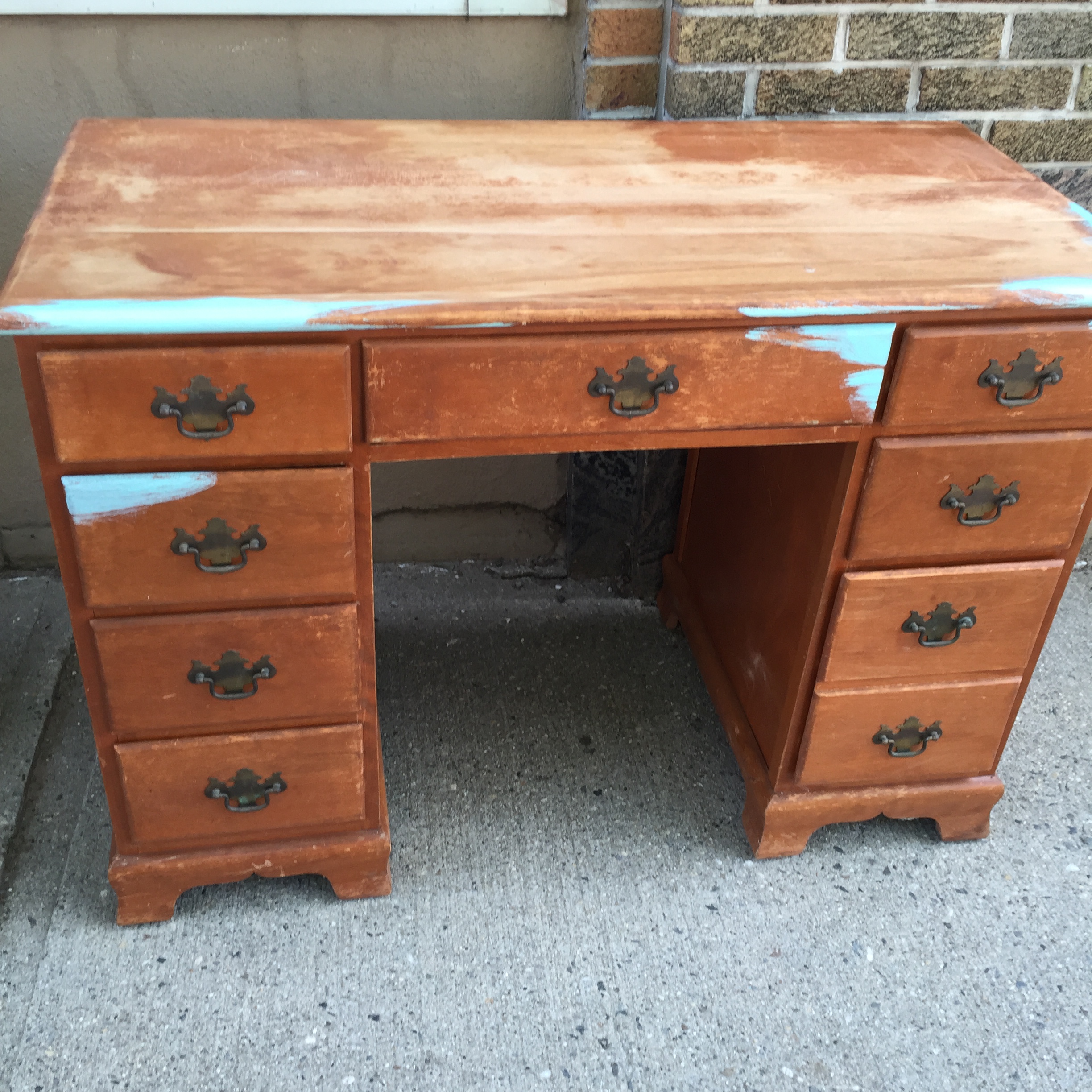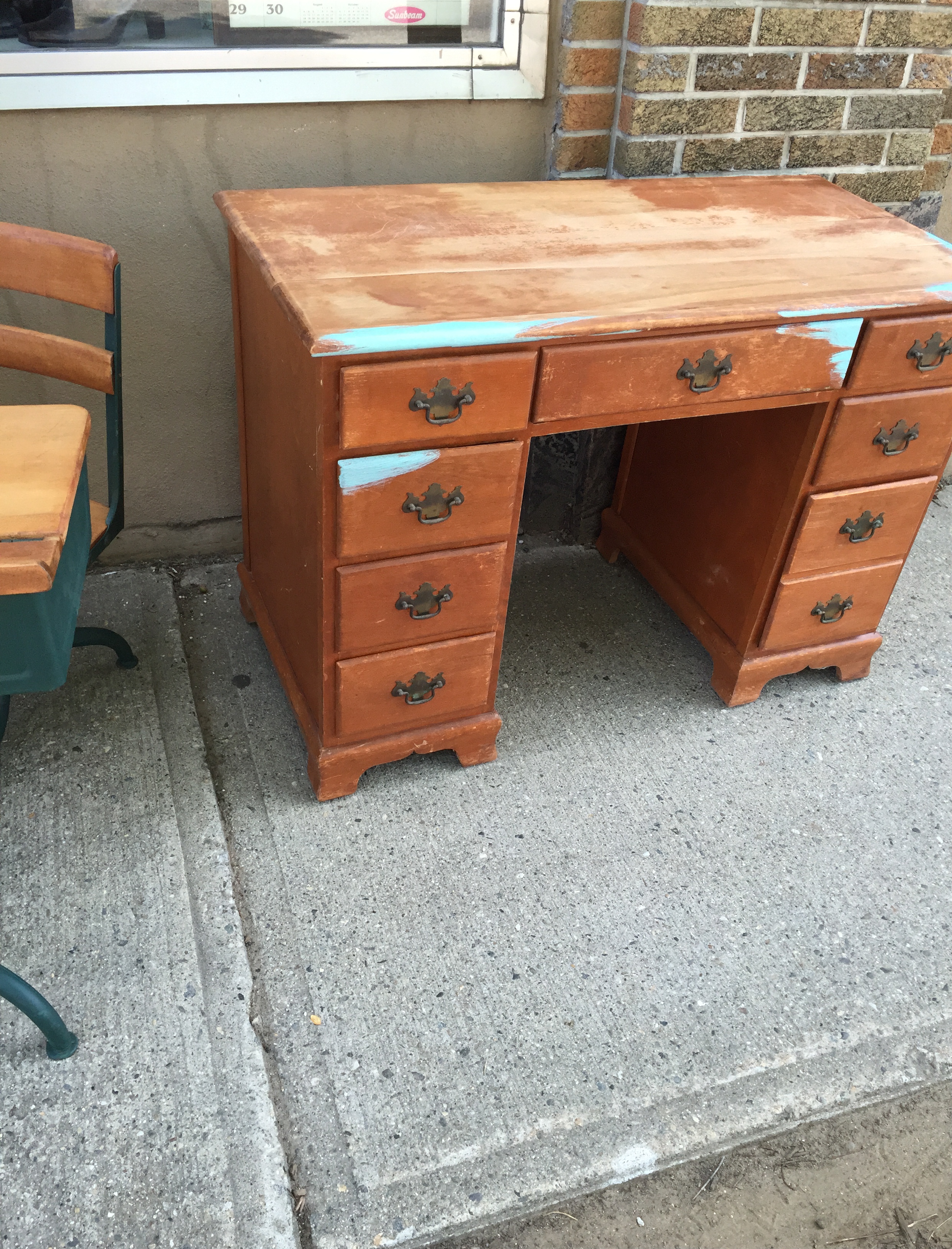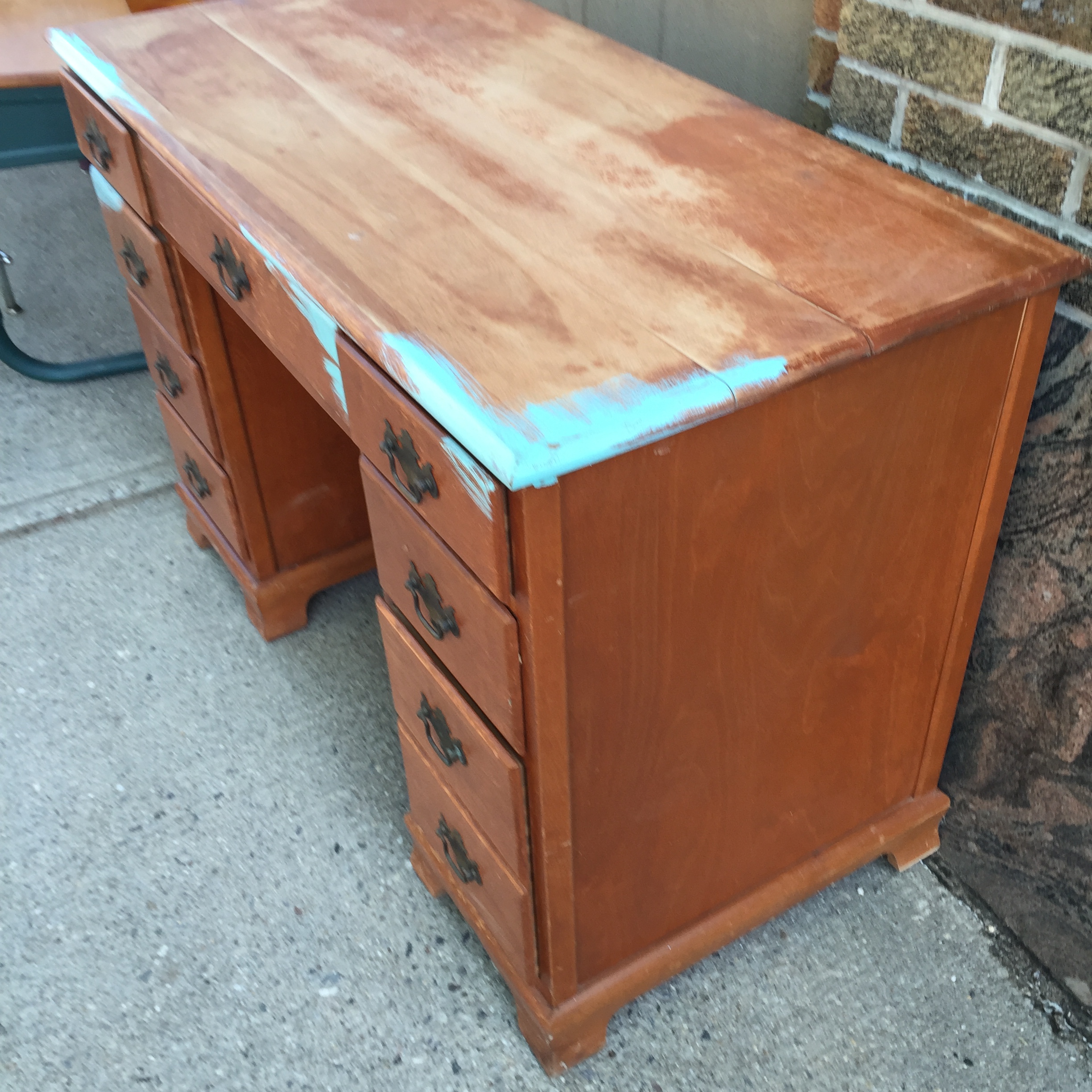 Someone started to refinish this classic desk but then seemed to give up on the project. So you’re free to use your imagination! Will you stain it in a traditional oak or mahogany, or will you go black, or perhaps even a mix of chalk paint and traditional stain?