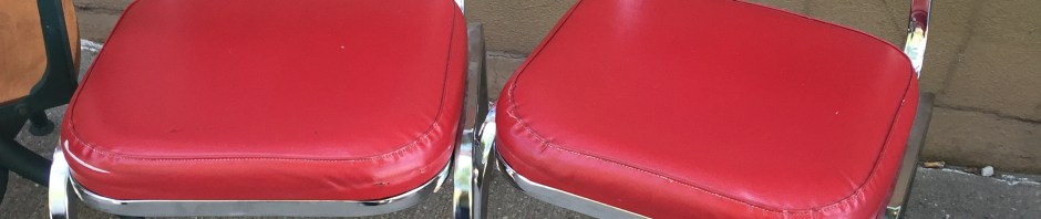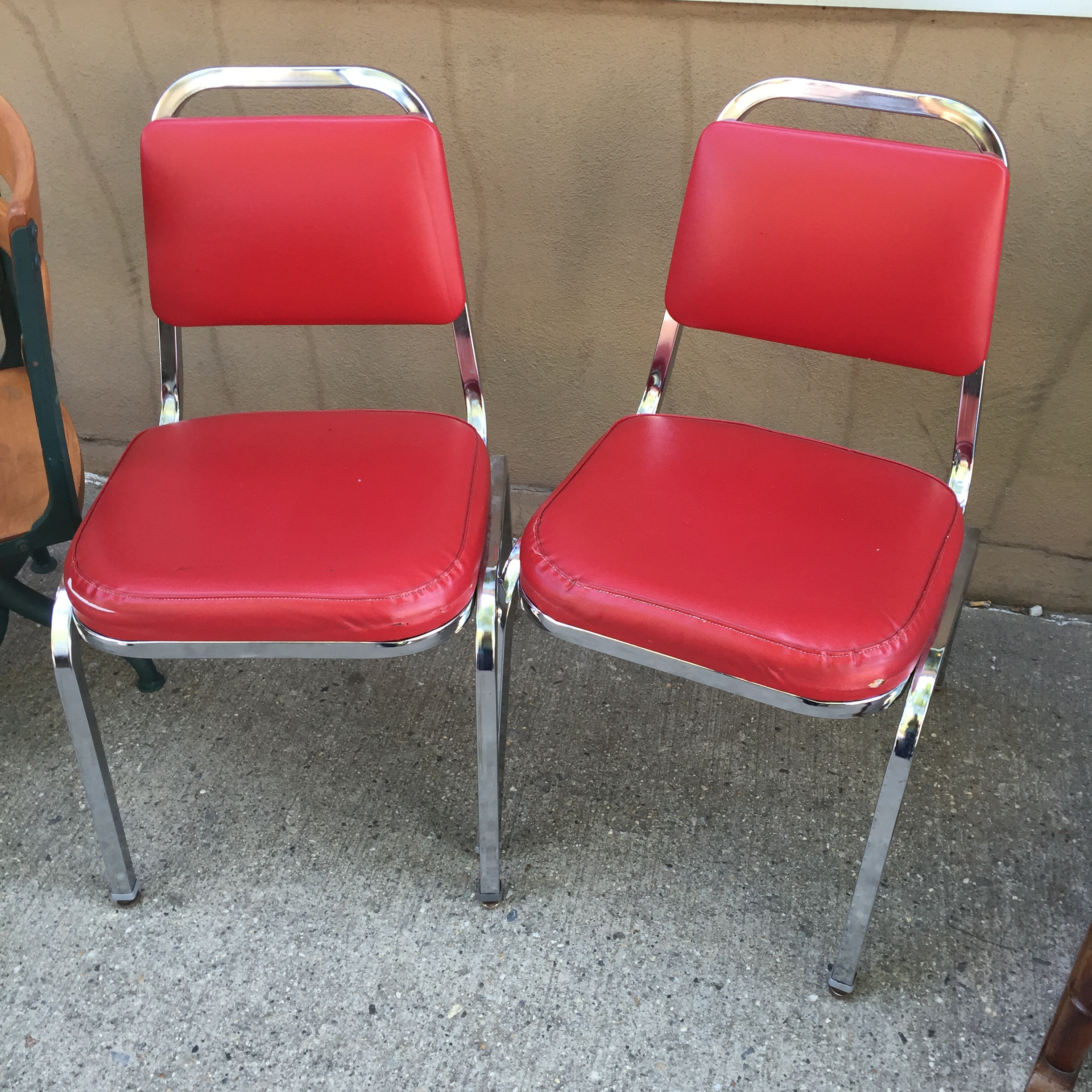 These are a couple of sturdy, basic chairs in bright red. They can be used as kitchen chairs, camp chairs or even as seating for our two student desks that have no paired chairs. The blog for the student desks can be found here: https://heritagecollectiblesmaine.com/2016/04/23/student-desk-chair-combos/