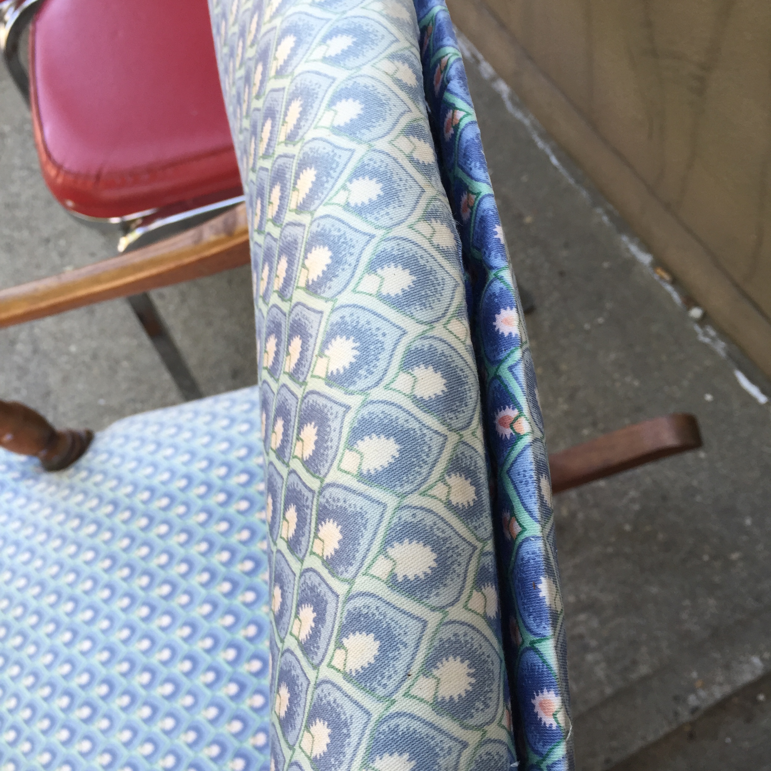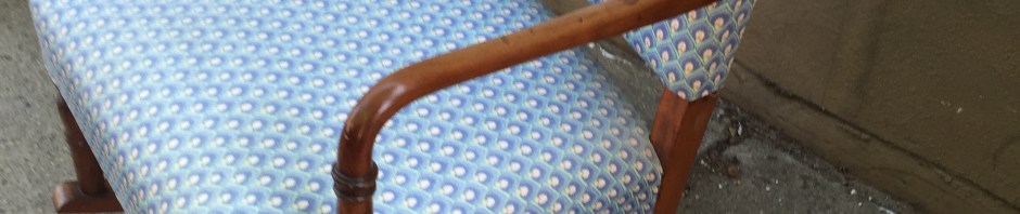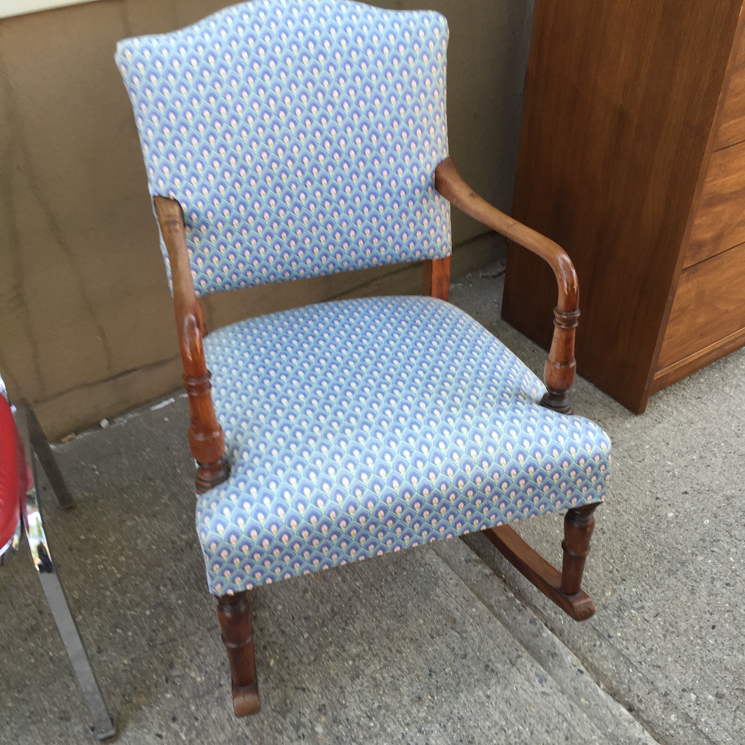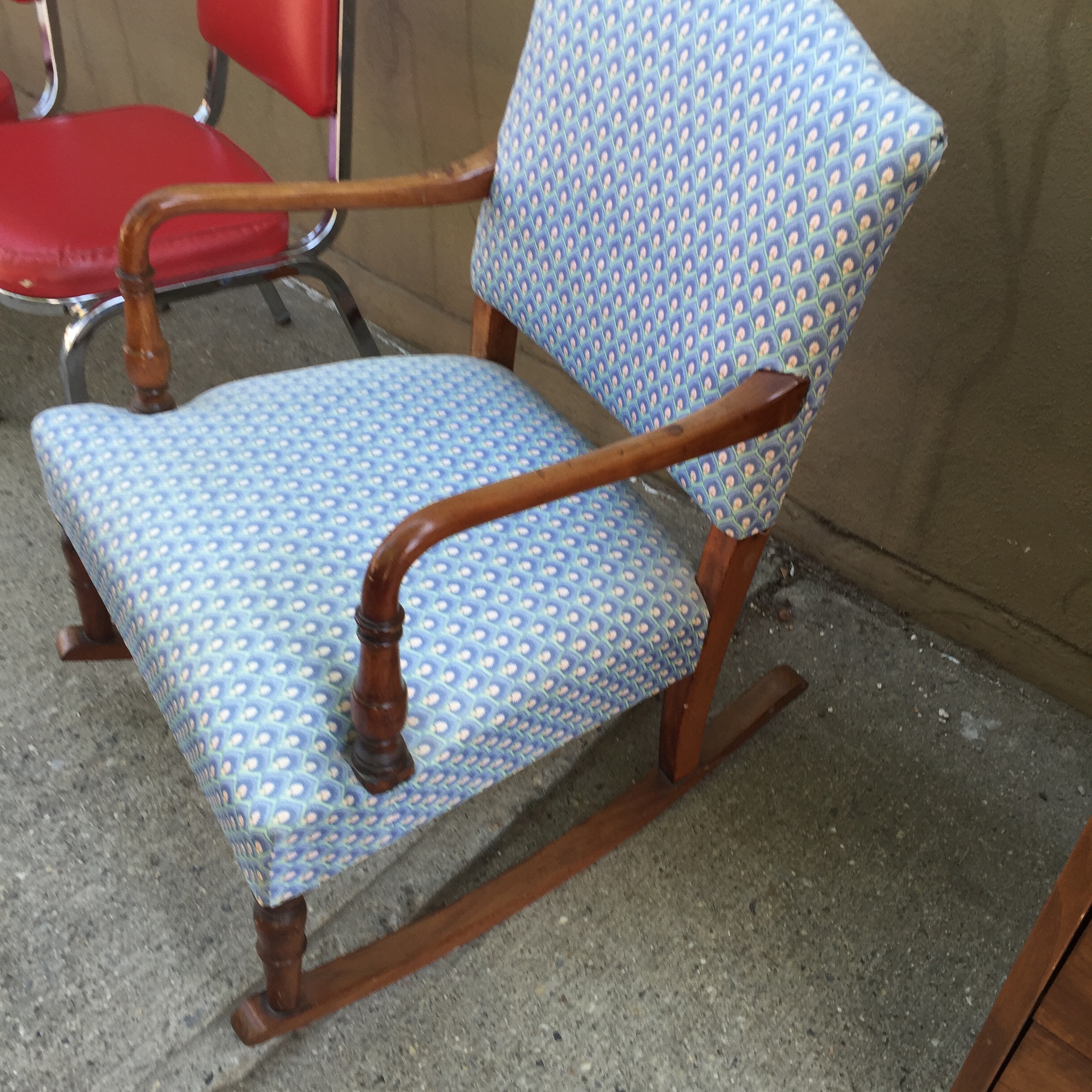 This is a nice comfy little rocker in blue that just needs some stitching along the seam on the back to be practically as good as new.