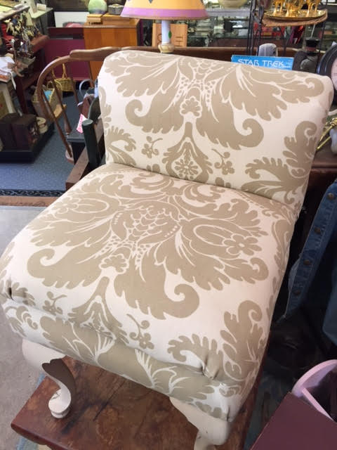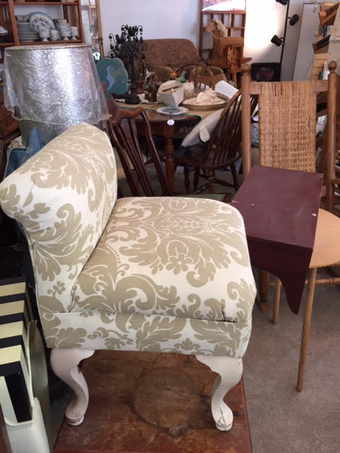 We got this lovely boudoir side chair at an estate sale in the Kennebunkport area. It’s fabulously unique – it’s sort of like an exquisitely enhanced footstool. Whatever or however one wants to define it, our little boudoir chair will add a touch of elegance to any room!