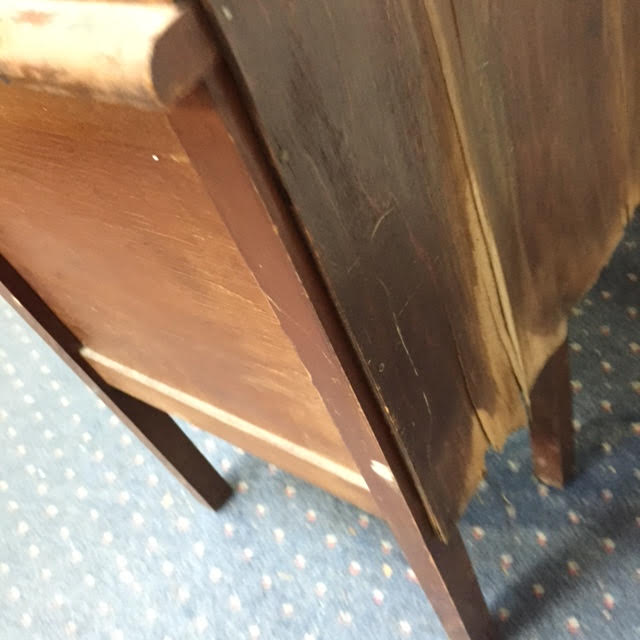Condition: This piece has been well-used and it shows (see the pictures below). The veneer on the back is in pretty rough shape, too. But overall, it’s a great piece and if refinished, would be gorgeous.