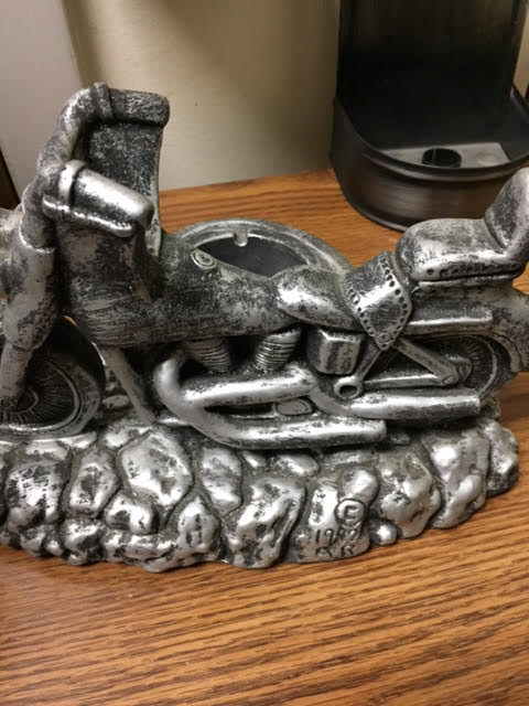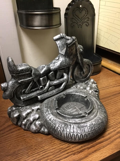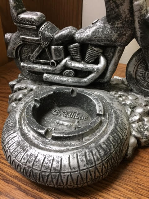We have this super cool motorcycle-themed ashtray from Excalibur Studios, dated 1992. The original price, according to the tag underneath, was $29.99.