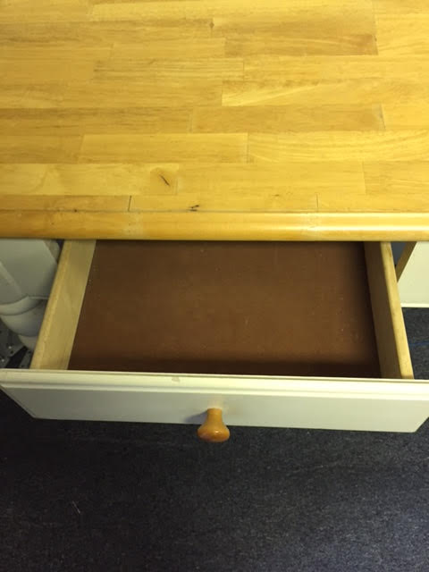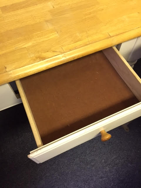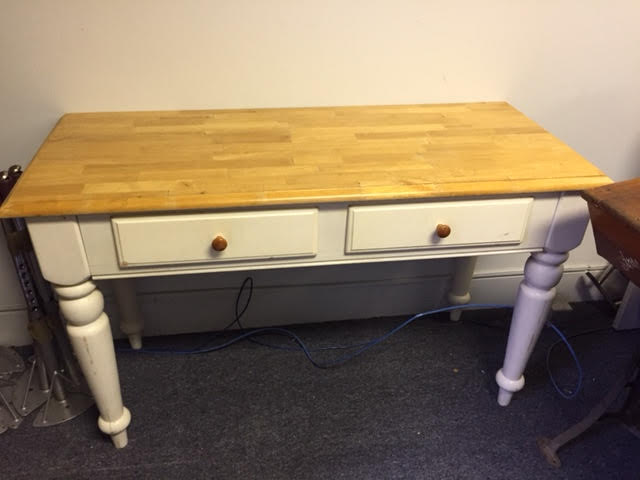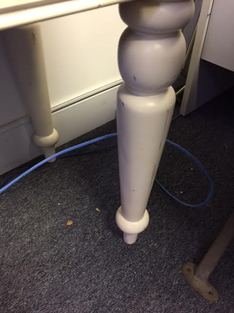 Condition: It’s in pretty good shape, without a lot of dings or scratches. There is some apparent minor damage to the bottom of the leg on the left side facing the desk. And the legs need tightening up, but that should be a minor detail.