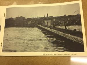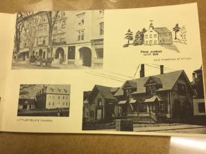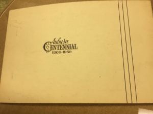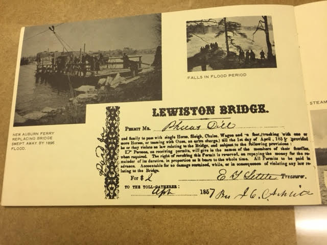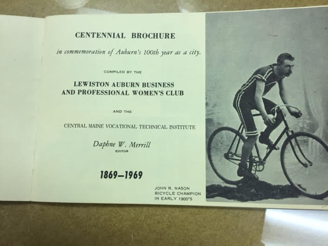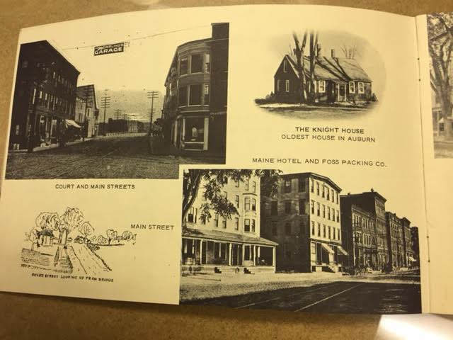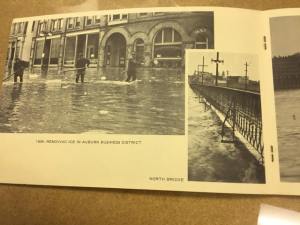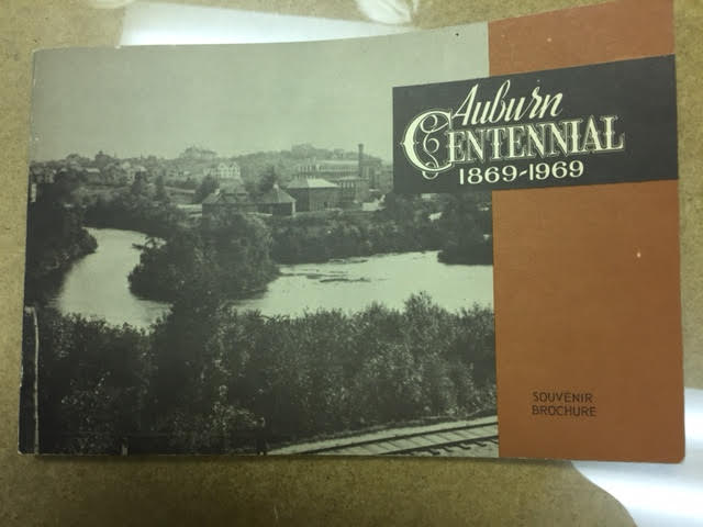 We love-love-love this souvenir brochure from Auburn’s Centennial (1869-1969), which is now almost 50 years old! The pictures of the swollen Androscoggin, and workers trying to remove ice and flooding from Auburn’s downtown are startling; the photos of the intersections of Turner and Court, and Main and Court, streets show a very different version of the town than we see today.