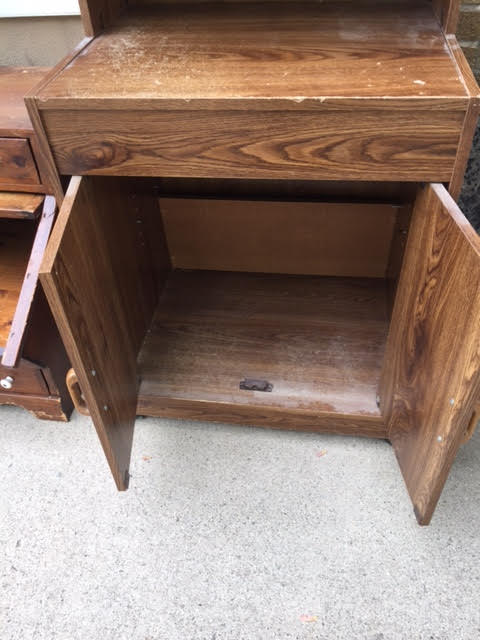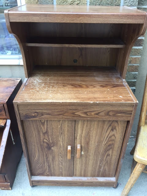 This is one of those particle board entertainment centers – or maybe it’s a small hutch. In any event, it’s been used and is somewhat scratched up but it’s fine for a camp or starter piece. And it’s on wheels, which makes moving it a breeze! (The wheels alone are probably worth the $10.00 price tag.)