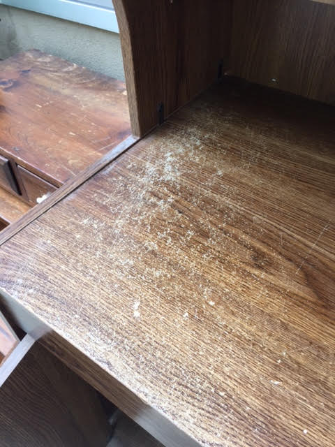 Condition: It’s in fair condition… it’s obviously been well used, as the pictures show. And there is a section where water was apparently spilled on it; since it’s particle board, that area is kind of bubbled up.