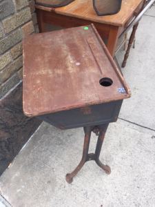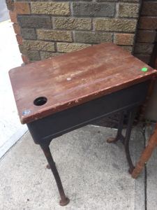 Here’s a sweet little vintage student desk; unfortunately, it doesn’t have a matching seat. (We have others, that do.)