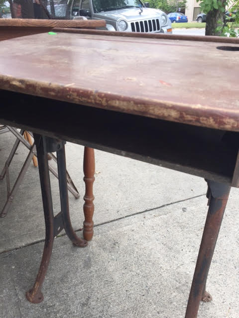 Here’s a sweet little vintage student desk; unfortunately, it doesn’t have a matching seat. (We have others, that do.)
