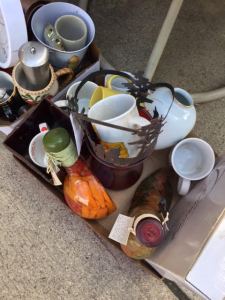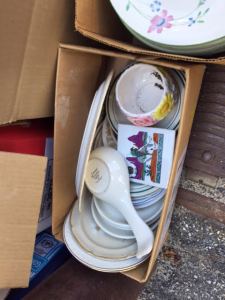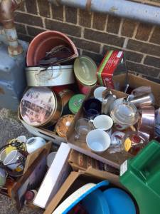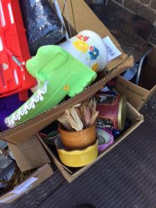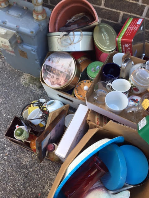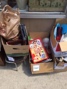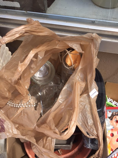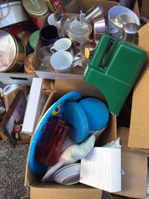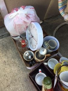 Right now there’s a small outdoor grill, and a bunch of glassware, candle holders and knick knacks, as well as a big umbrella. Nothing particularly special, but the stuff may be good for someone.