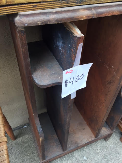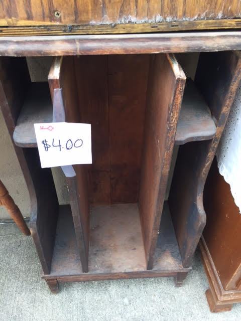 Vintage music or magazine cabinet; this was used as a plant stand on a front porch, so is now rather rough. The top needs to be reglued or reattached somehow..