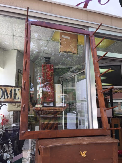 Wooden frame with 7 pegs on each side… or hang it horizontally. Although it appears to have a glass insert, that’s just the shop window in the background.
