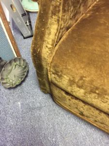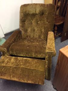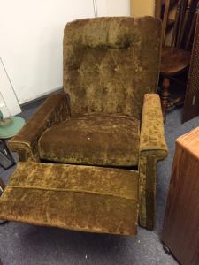 Condition: It has an apparent cigarette burn hole in the seat, and a bald area on the top. Otherwise, it’s a nice comfy old chair, the kind the kids can climb on and for the price, you won’t worry about them destroying the recliner.