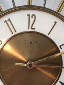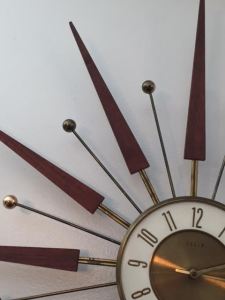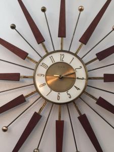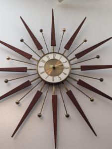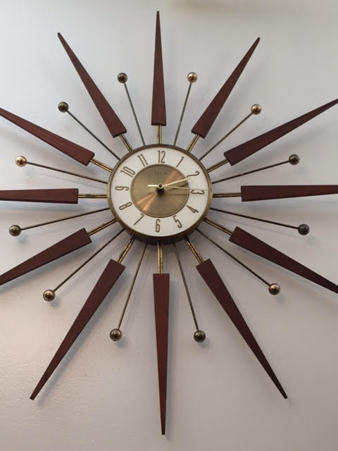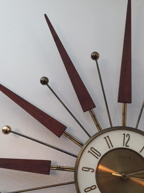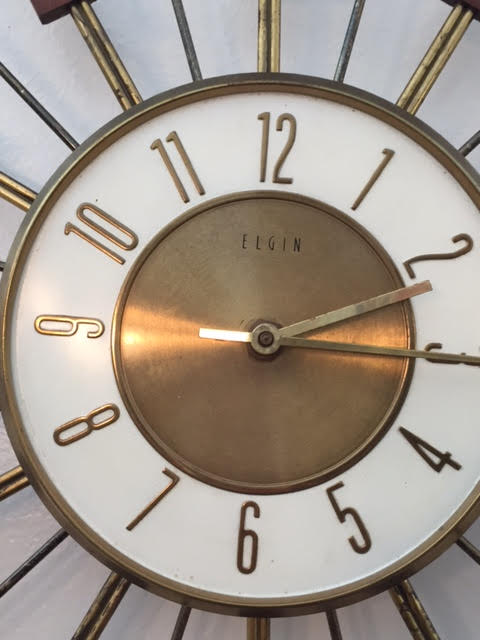 Mid Century Modern is HOT right now, and this is a classic. Just ten years ago, this clock was selling for maybe $100… Well, I definitely paid more than that to outbid two others at a local auction! In the past year, the value of Elgin Starbursts has climbed to as much as $500.00, although $300.00-$350.00 seems about average.